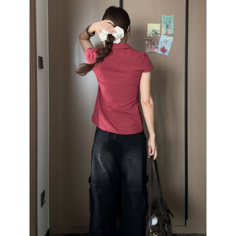 Hong Kong Style Retro Red Polo Collar Short-Sleeved Plaid Shirt for Women 2025 Summer New Commuter Slim-Fit Regular Shoulder Top