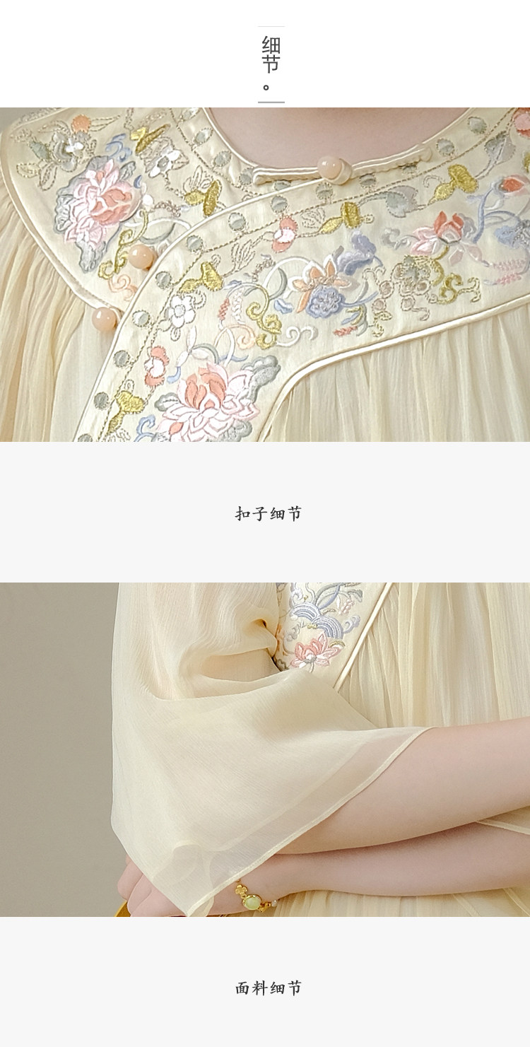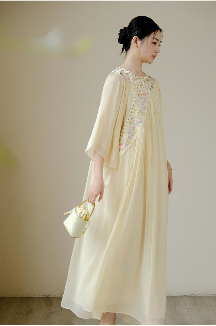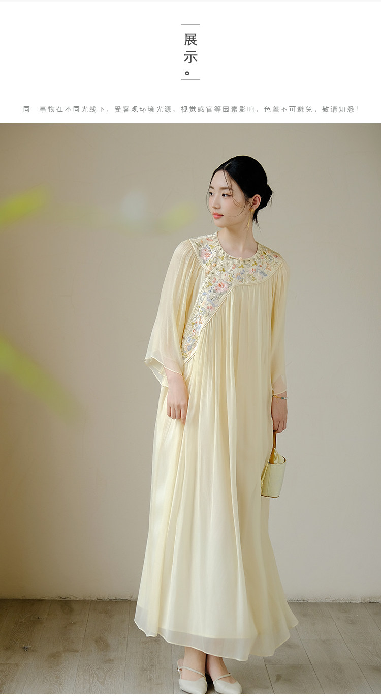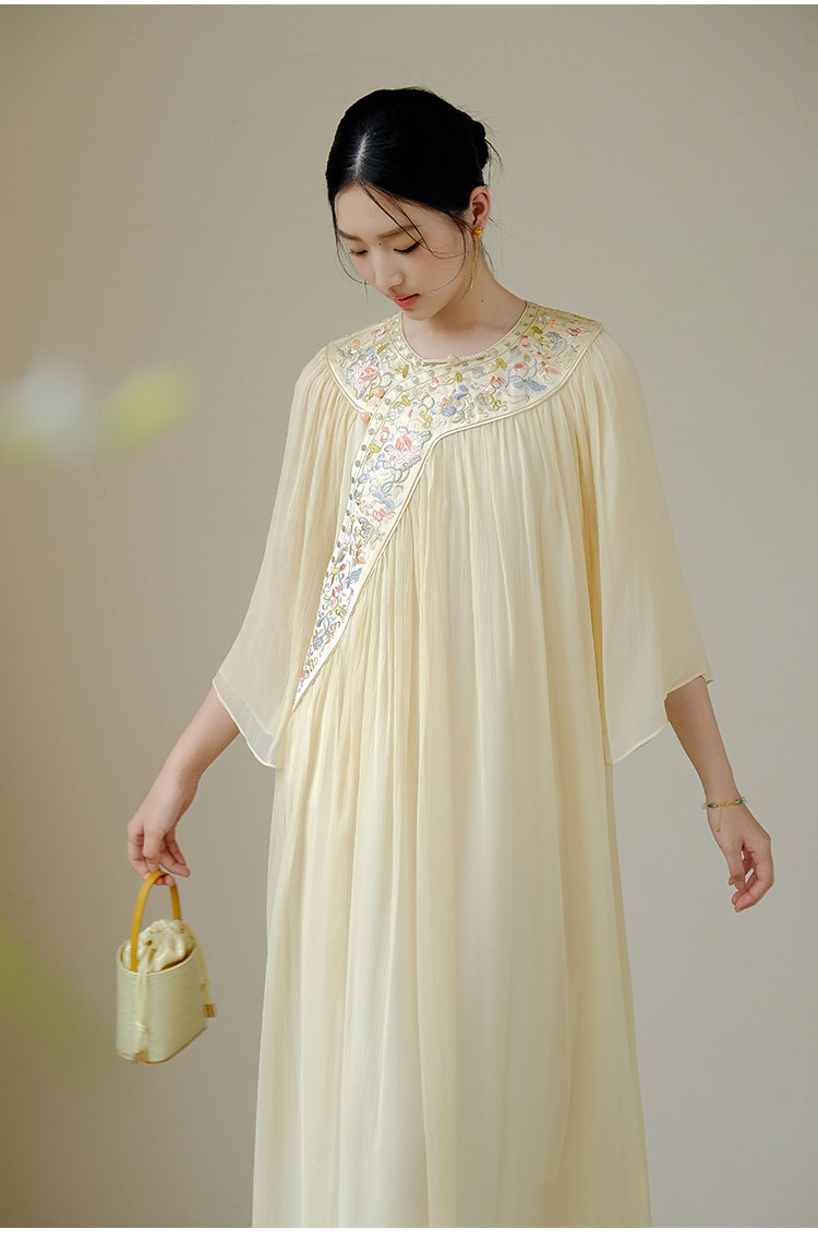 The Mountains Are Colorful, the Willows Are Swaying, New Chinese Style 2025 Summer National Style Loose Embroidered Round-Neck Silk Dress