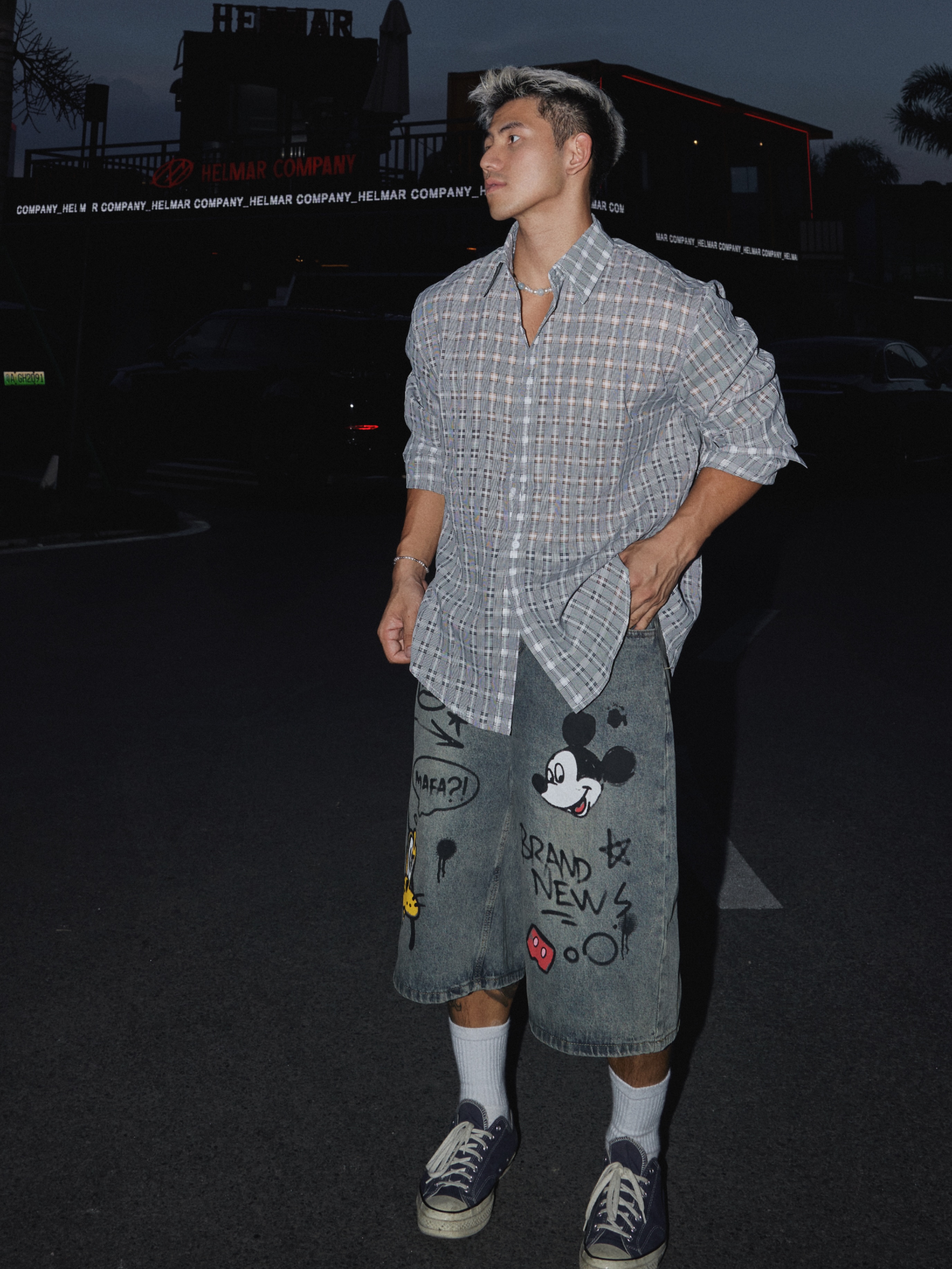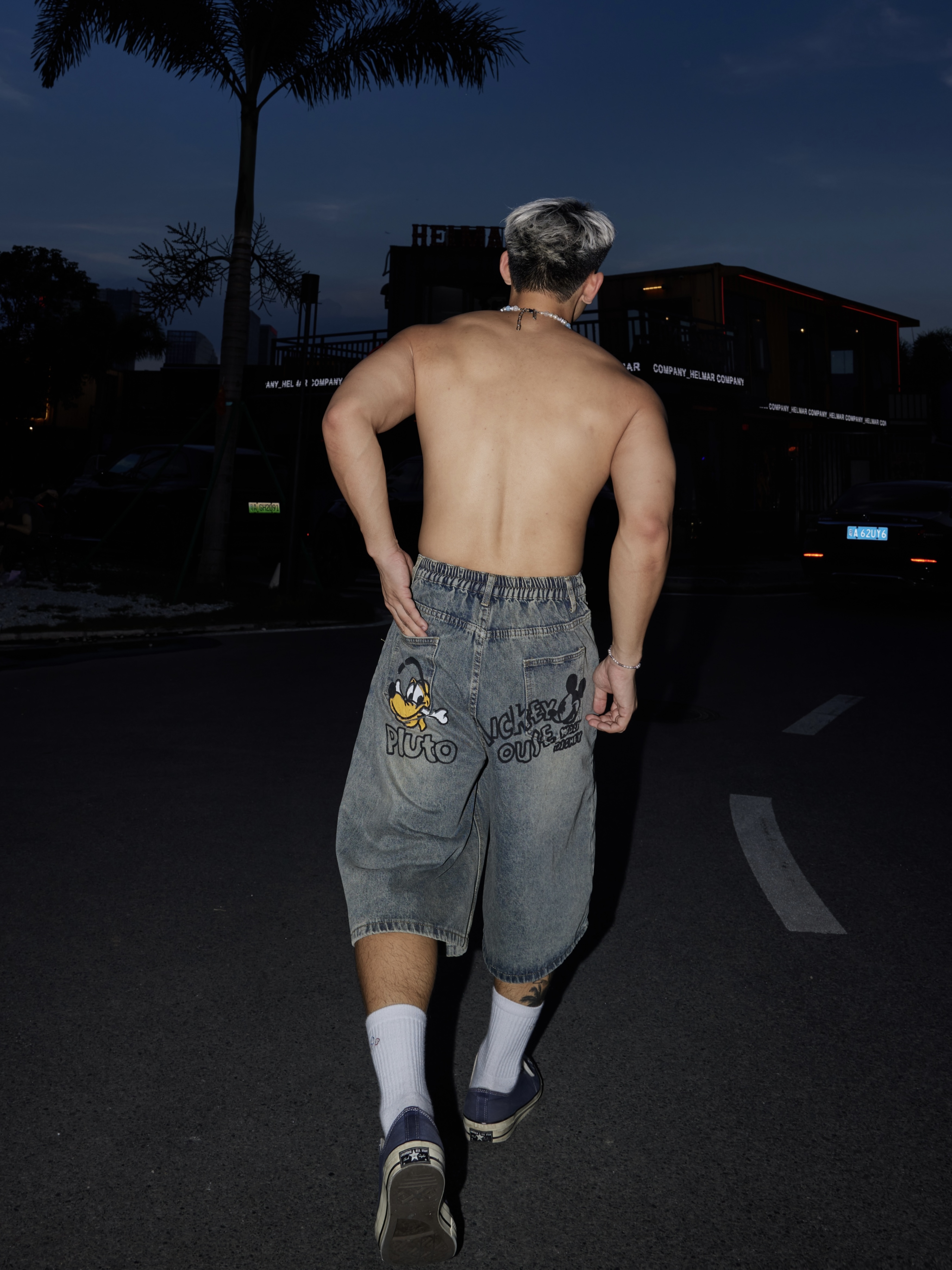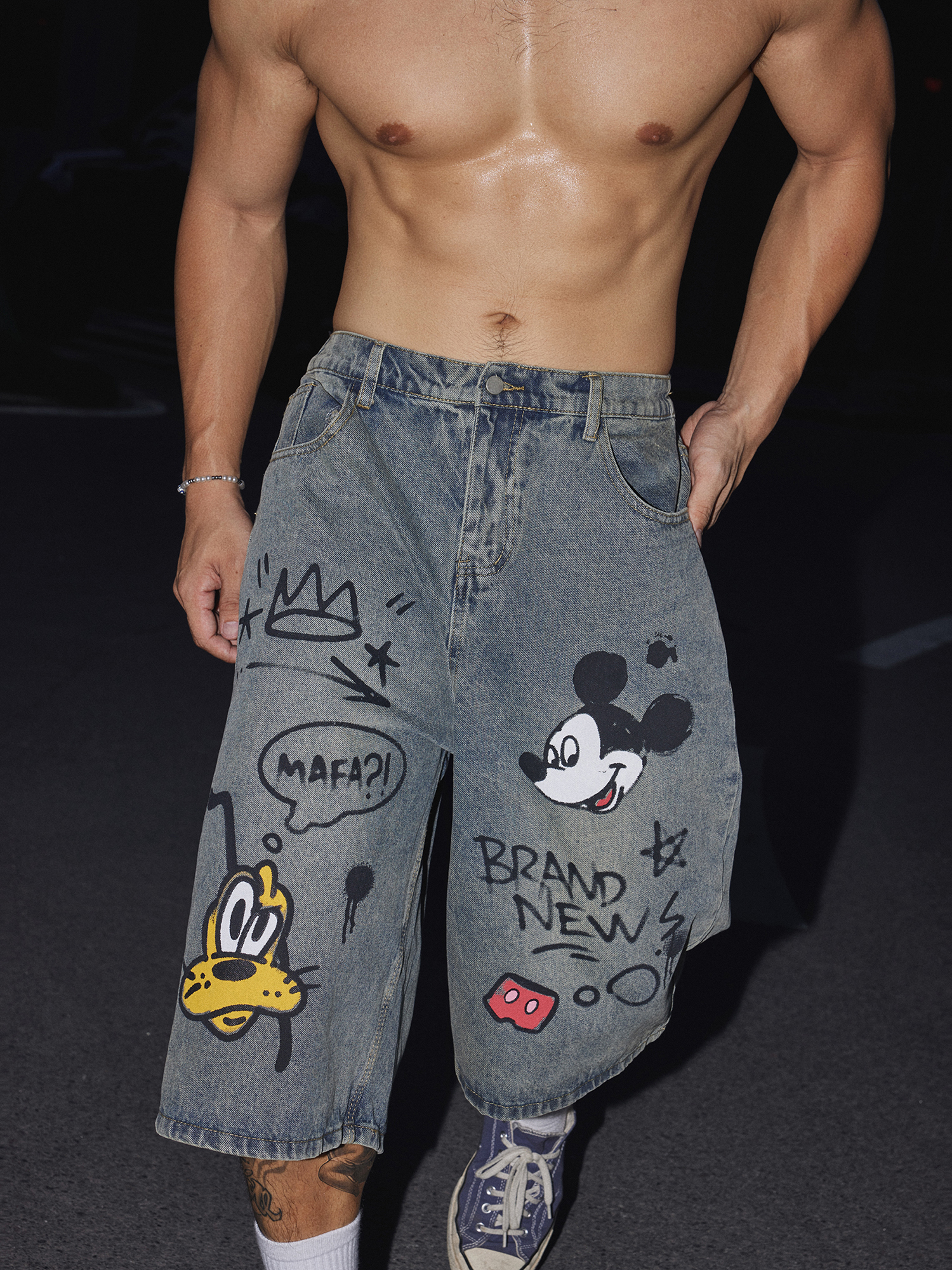 Cartoon Paradise American Retro Street Graffiti Print Denim Shorts for Men, Summer Loose Straight-Leg Knee-Length Shorts Trendy