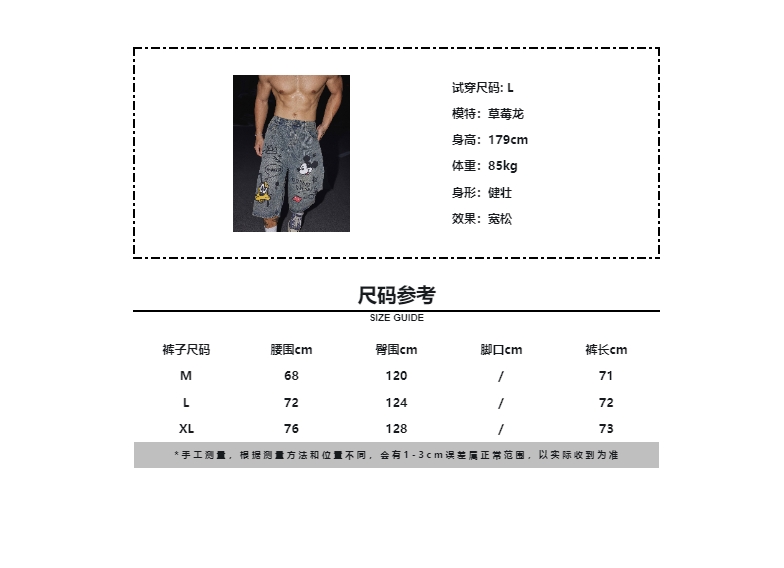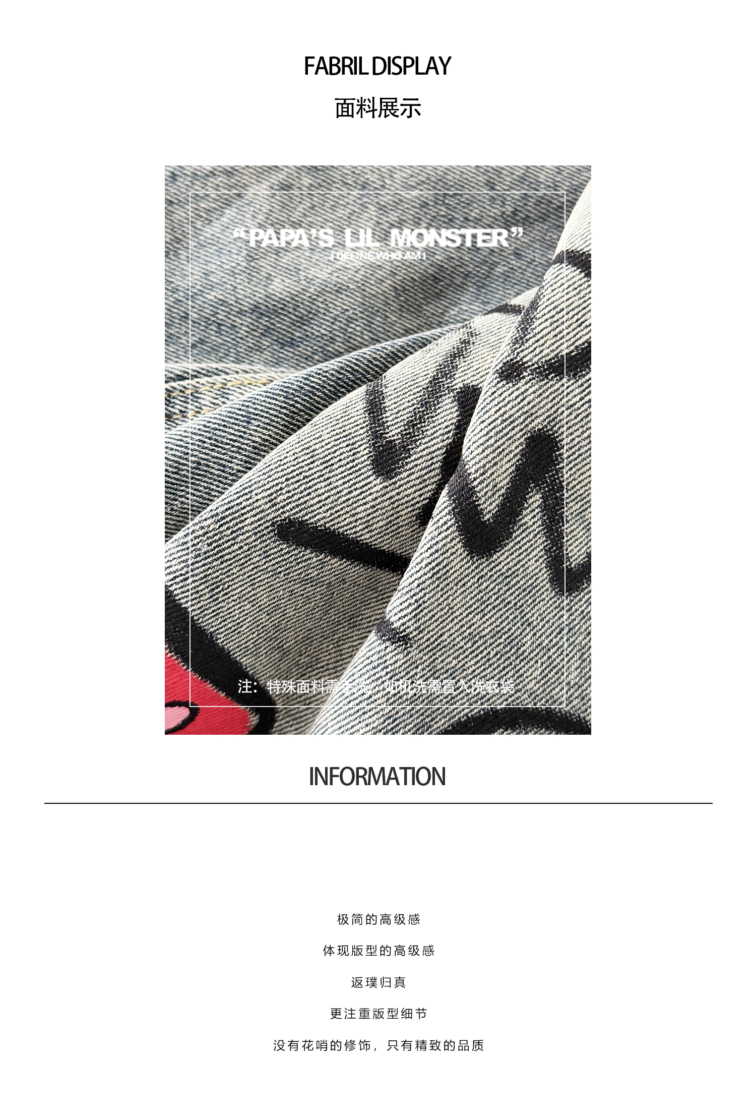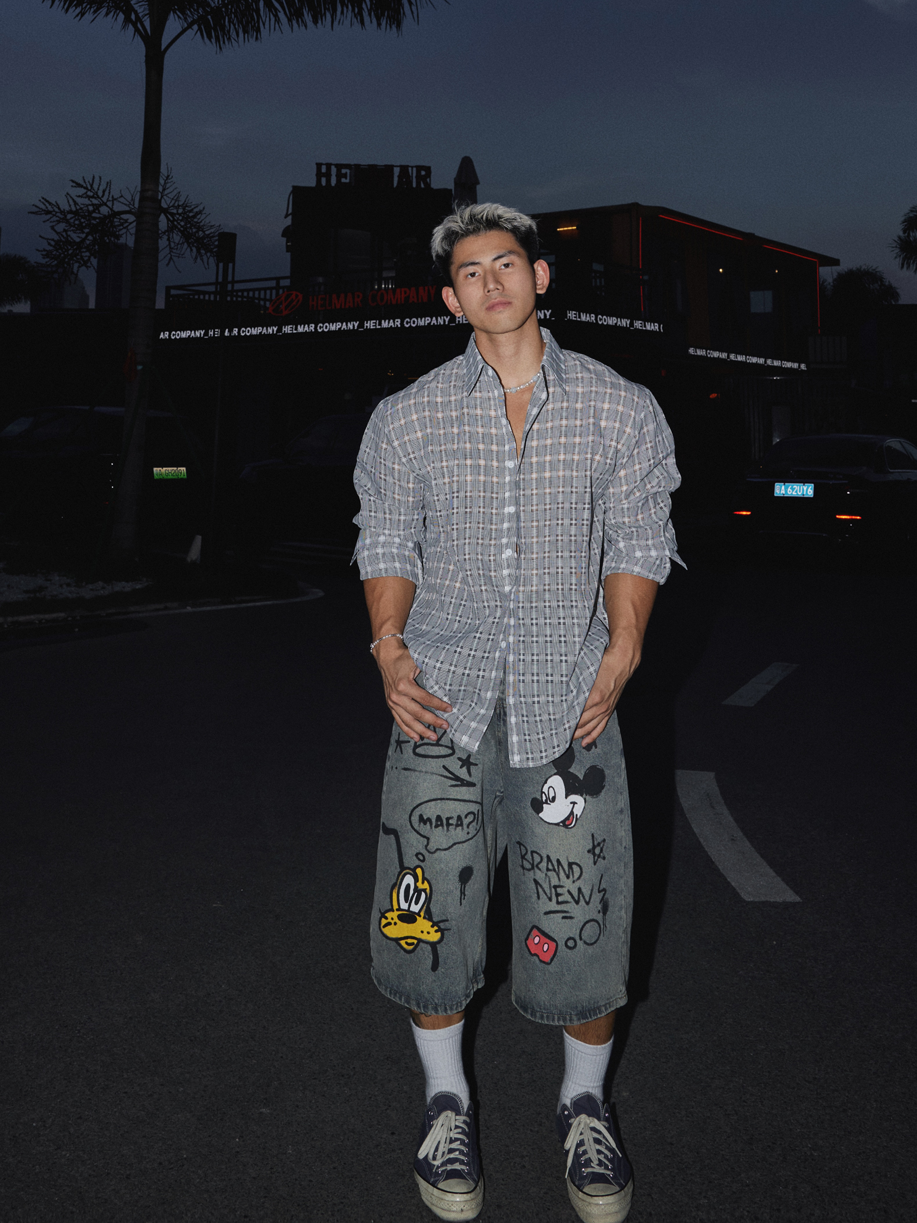 Cartoon Paradise American Retro Street Graffiti Print Denim Shorts for Men, Summer Loose Straight-Leg Knee-Length Shorts Trendy