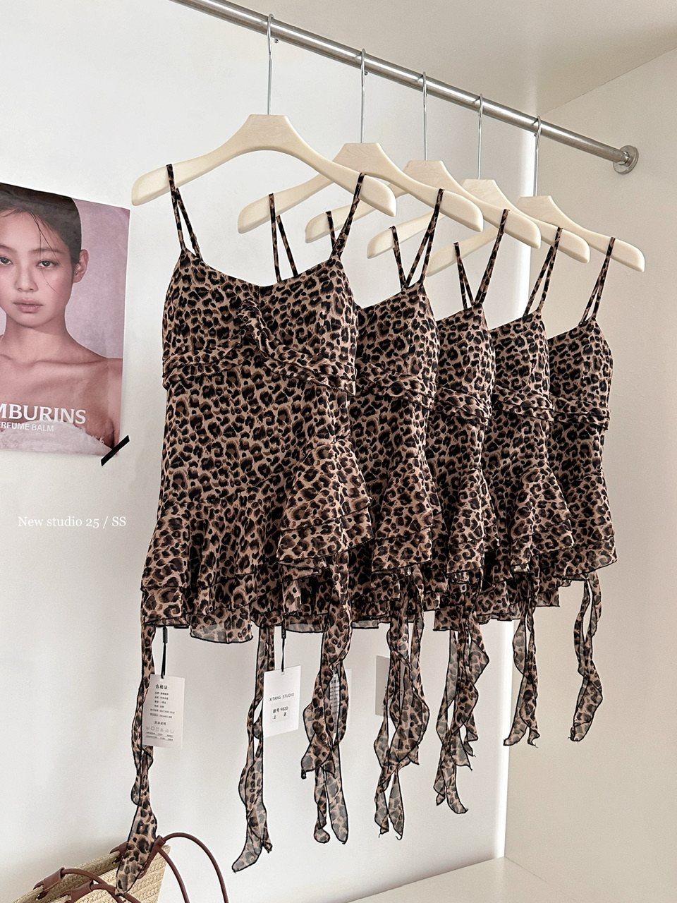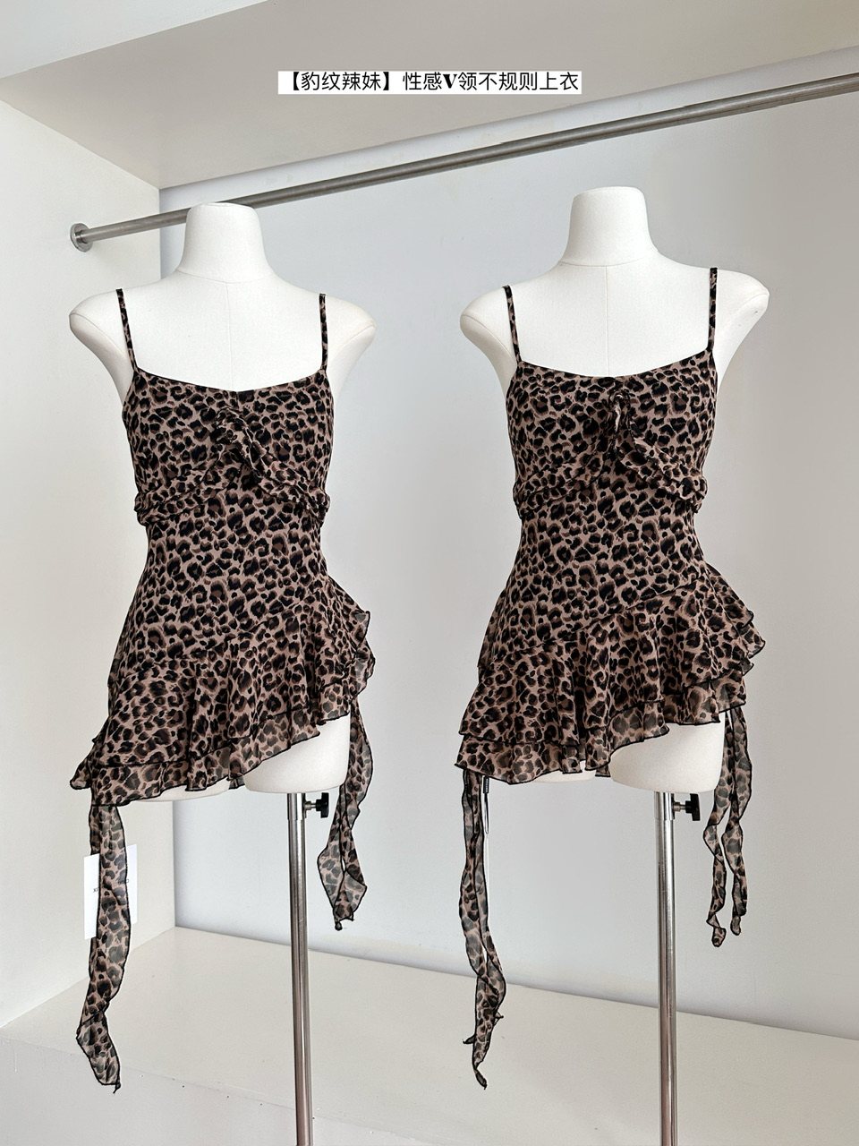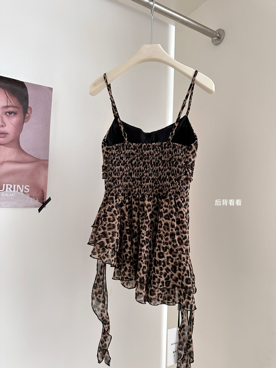 New for Summer! Leopard Print Irregular Chiffon American Retro Sexy Slim-Fit Camisole Top for Outerwear