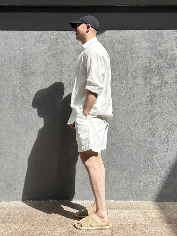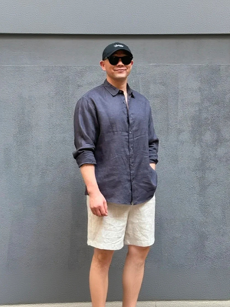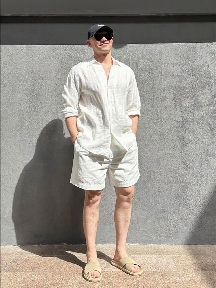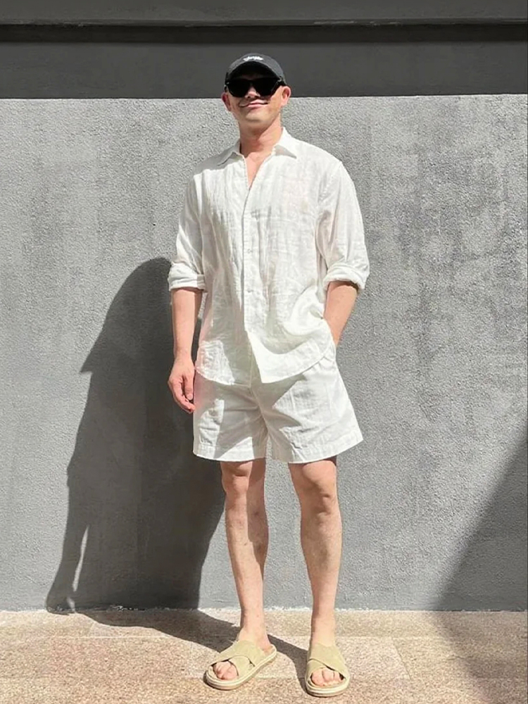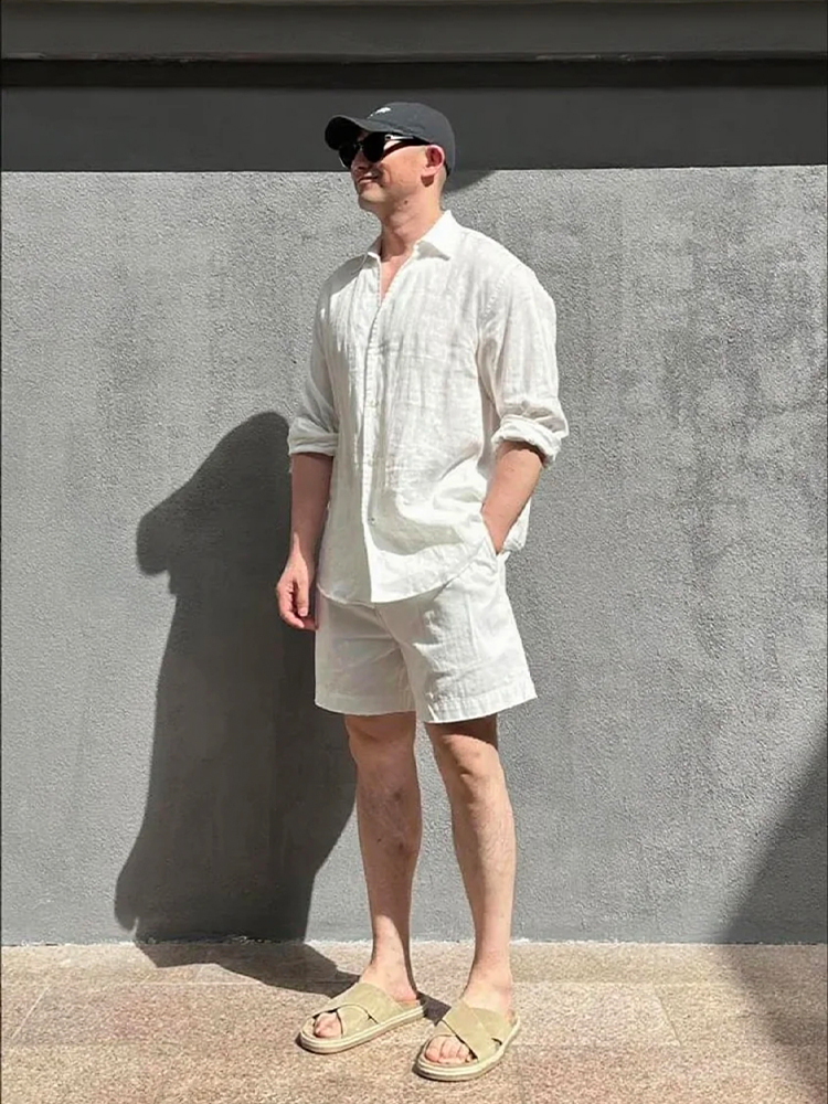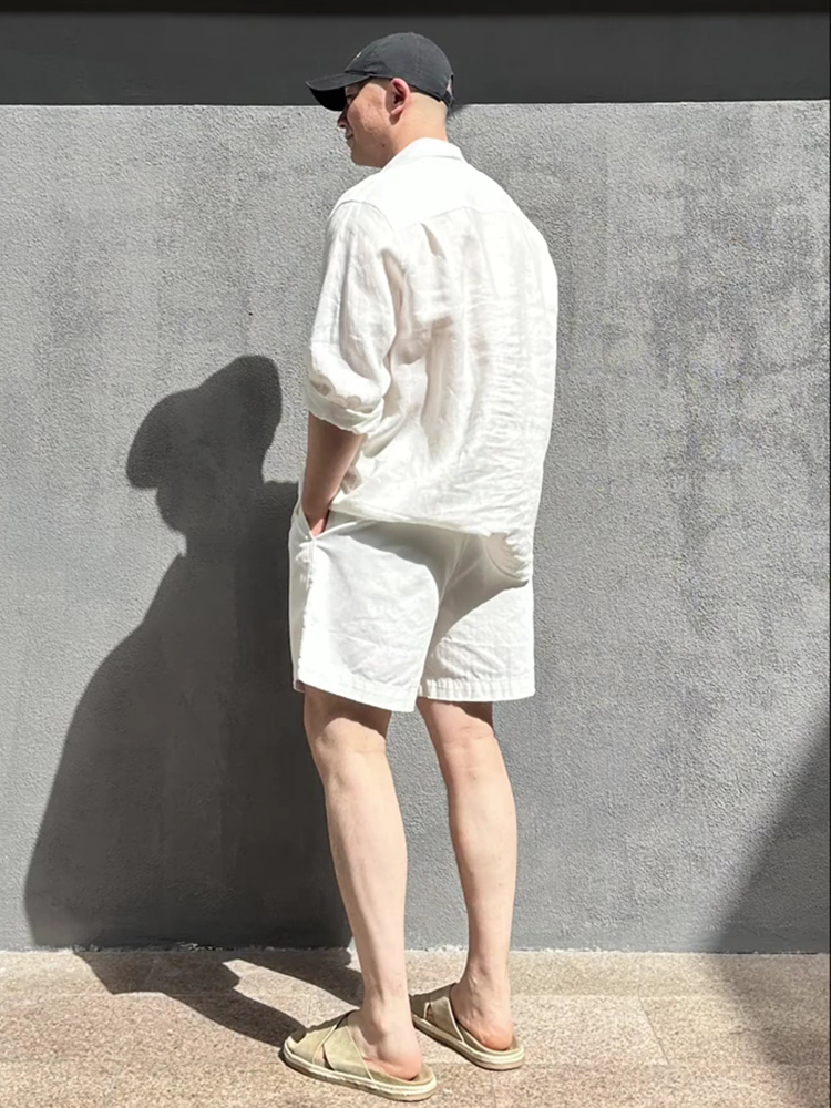 Old Money Style Outfit: White Linen Sun Protection Shirt for Men, Autumn Light Mature Style, Thin Sports Shorts Two-Piece Set