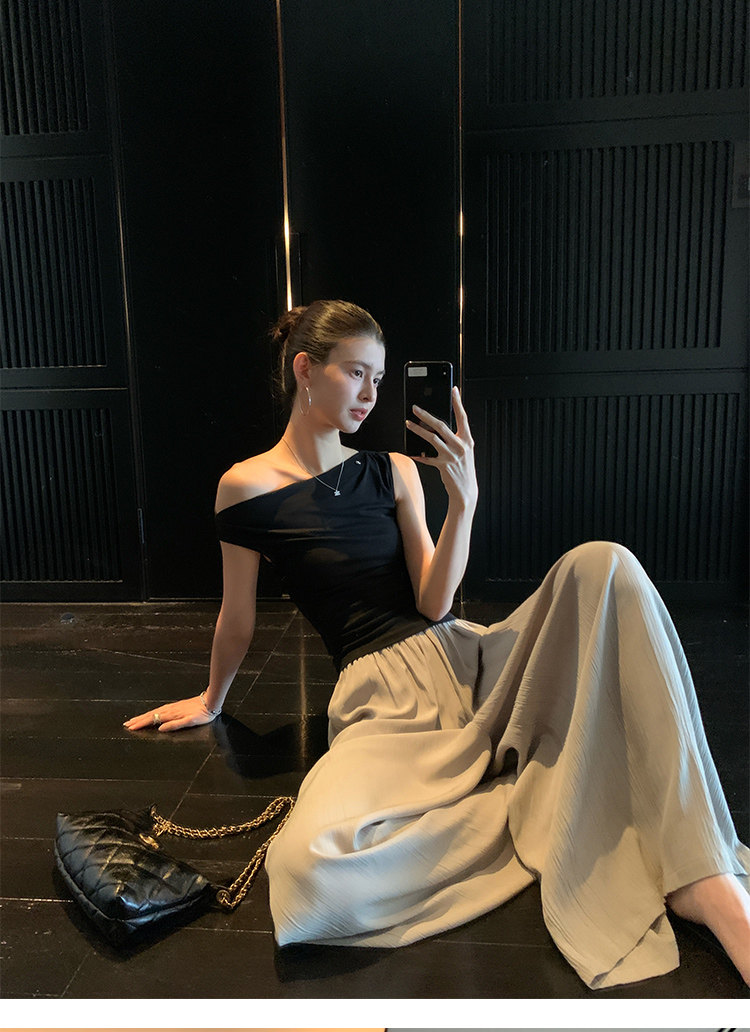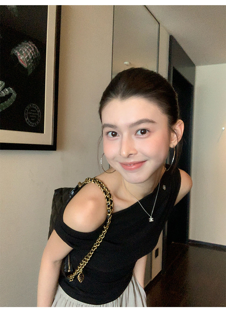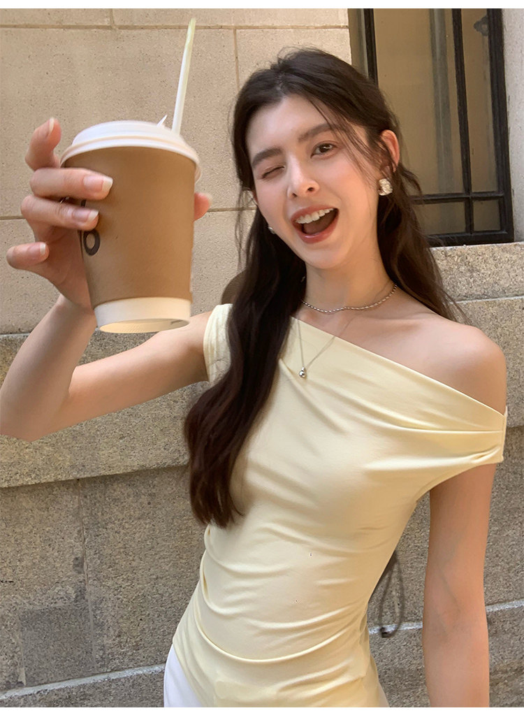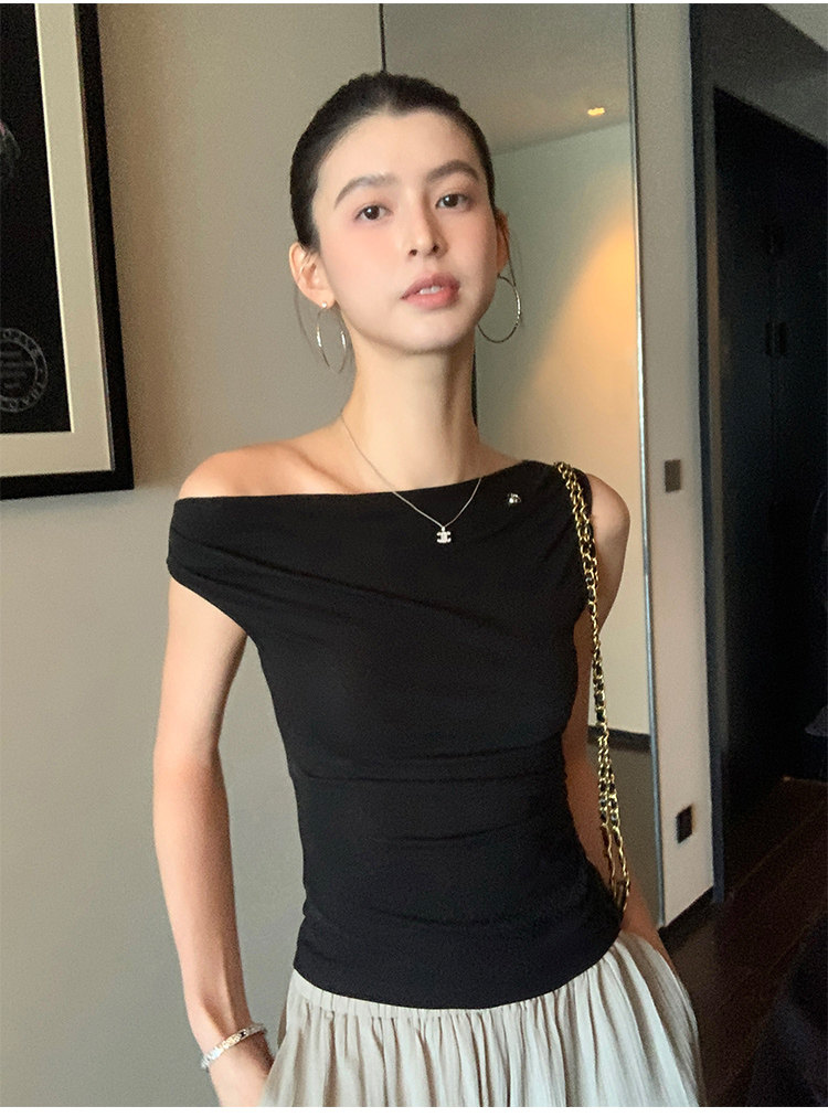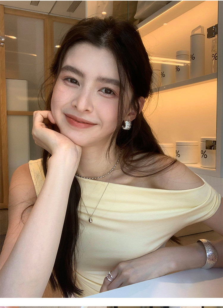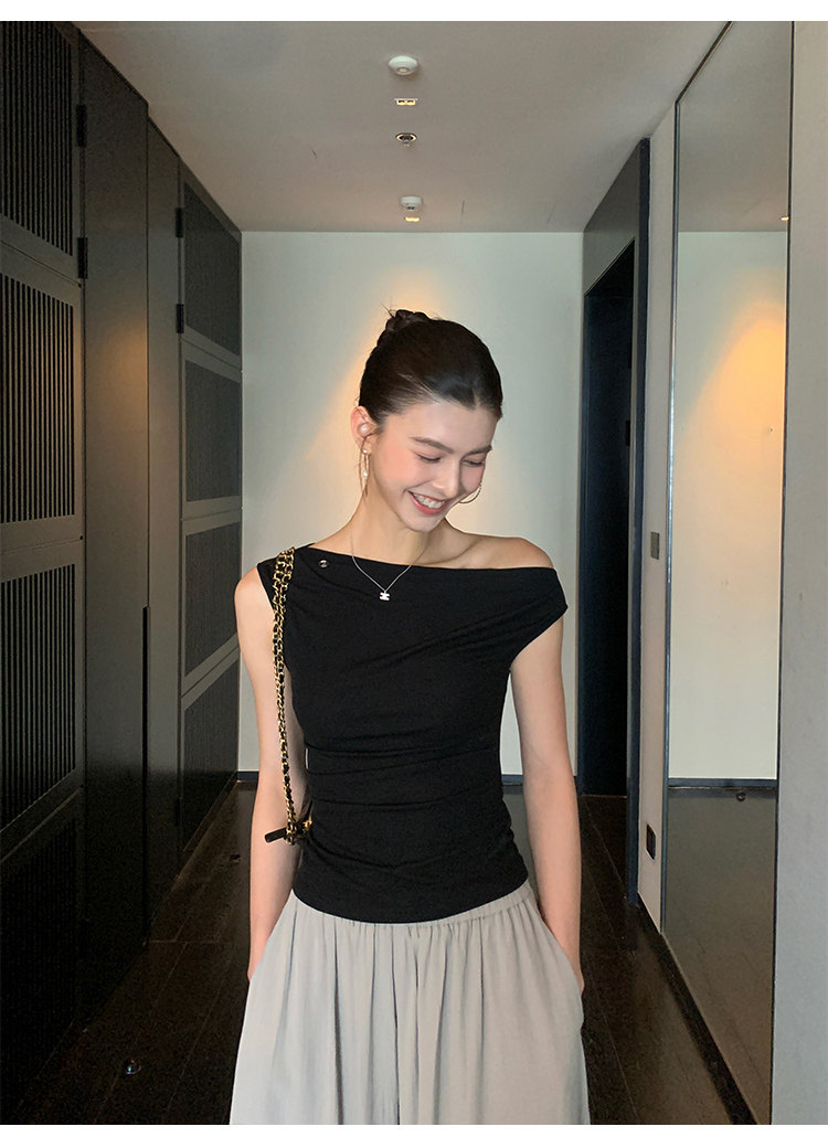 Pusumede Minimalist One-Shoulder T-Shirt for Women, Short Knitted Slim-Fit Elegant Off-Shoulder Sleeveless Top