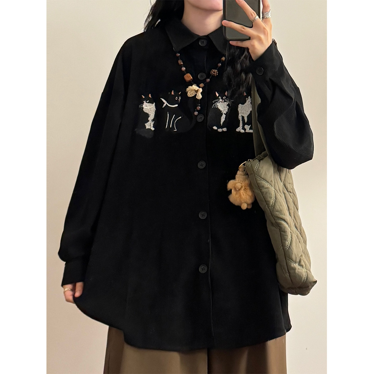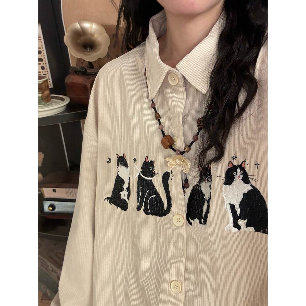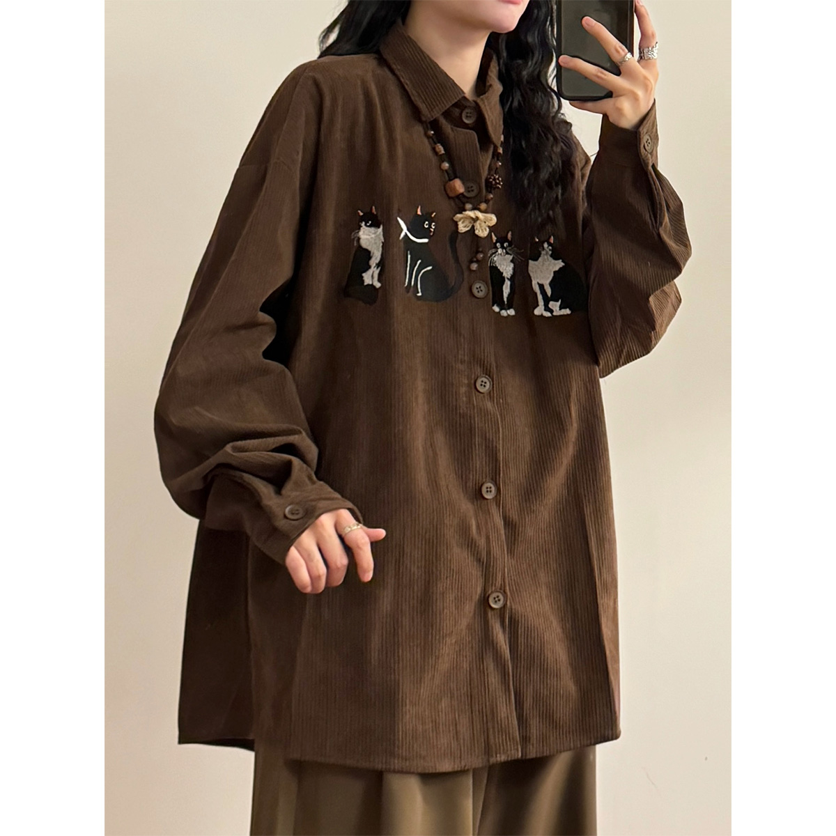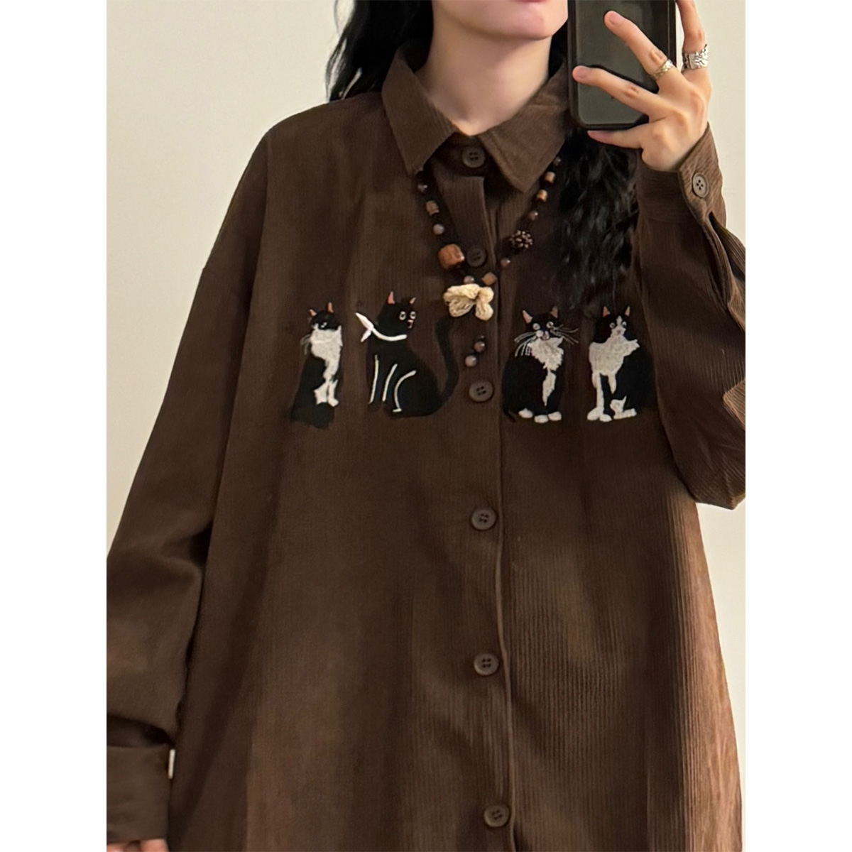 Uatonline Early Autumn American Retro Loose Trendy Brand Fun Cat Embroidery Corduroy Long-Sleeve Shirt Top