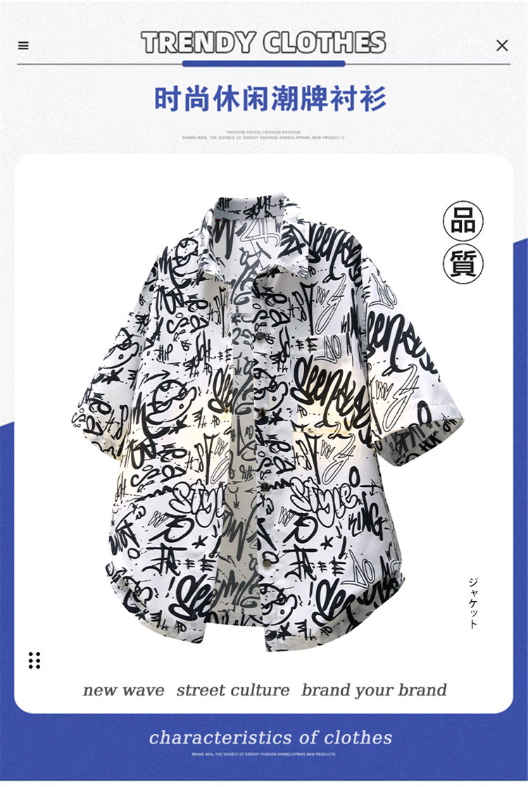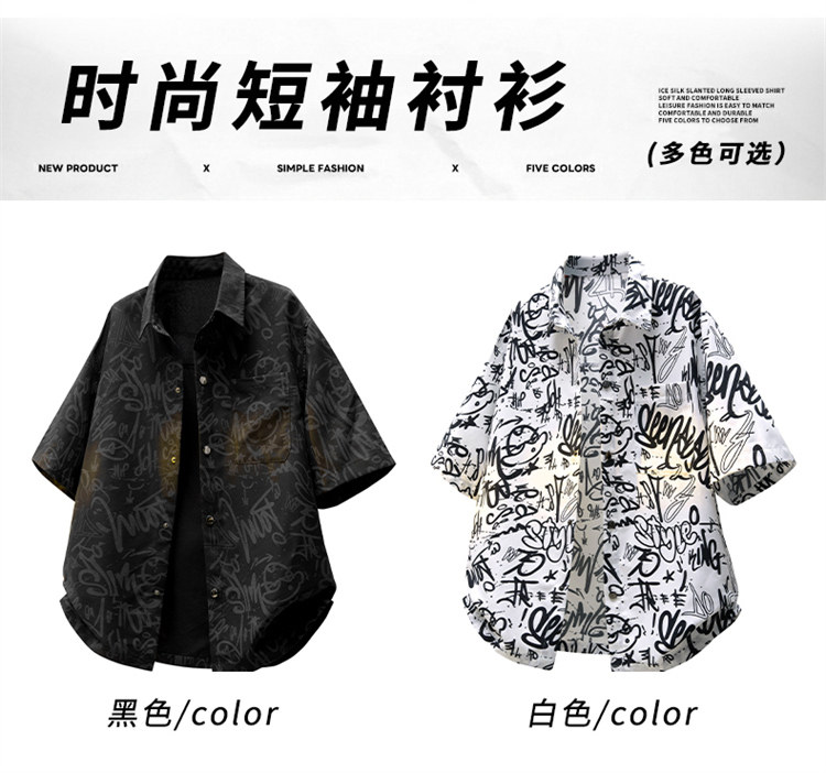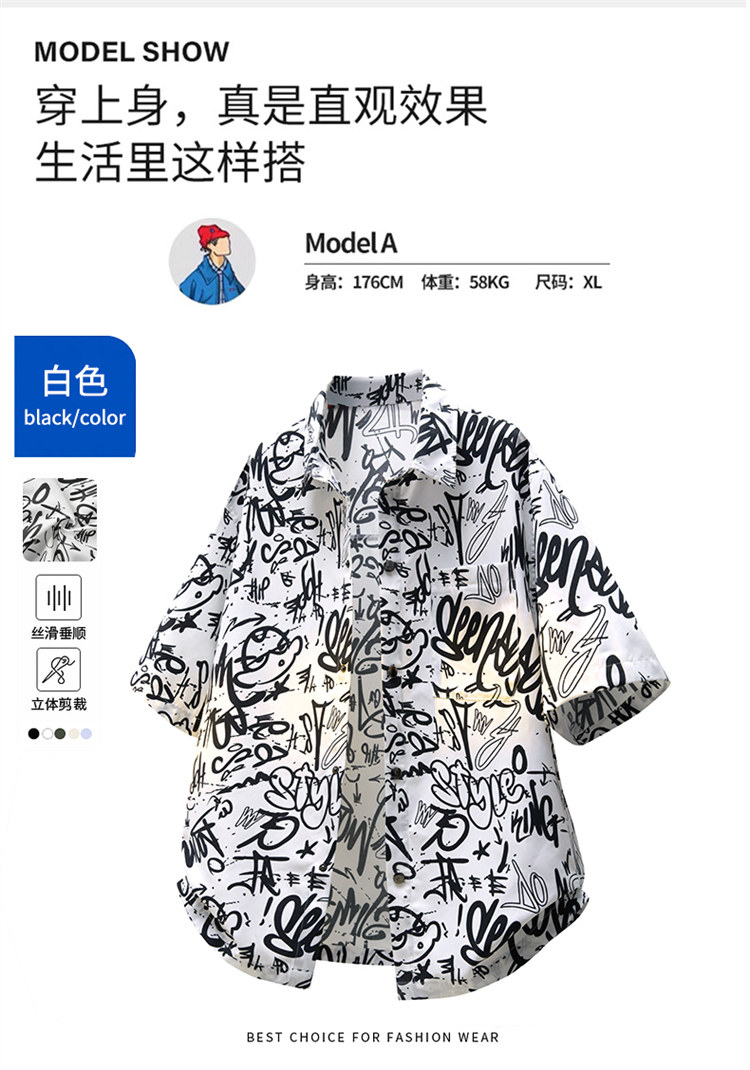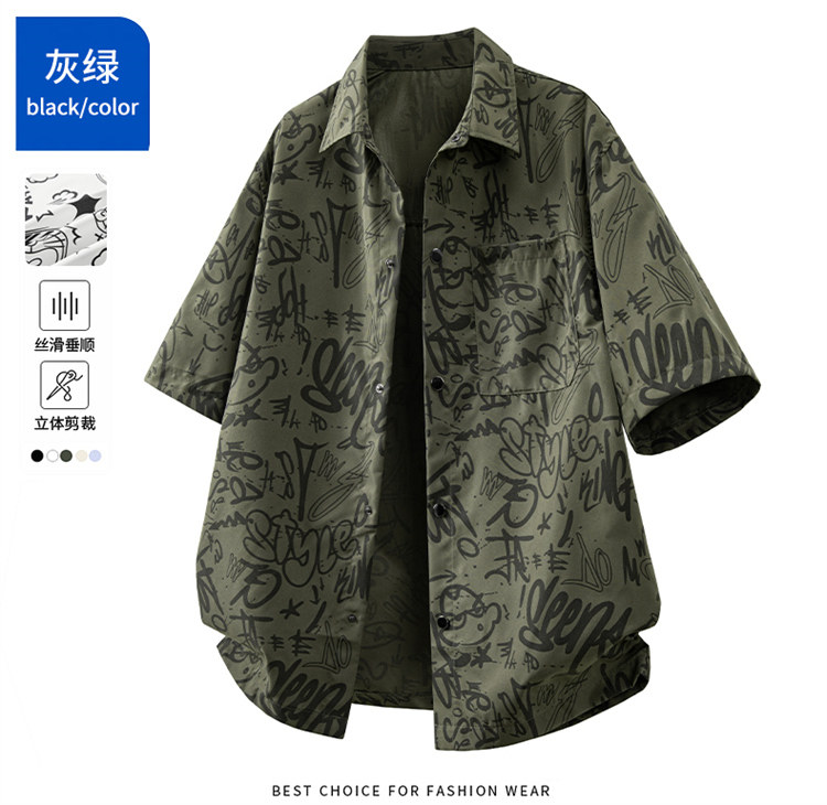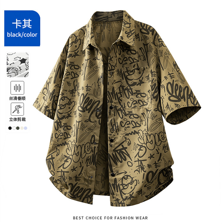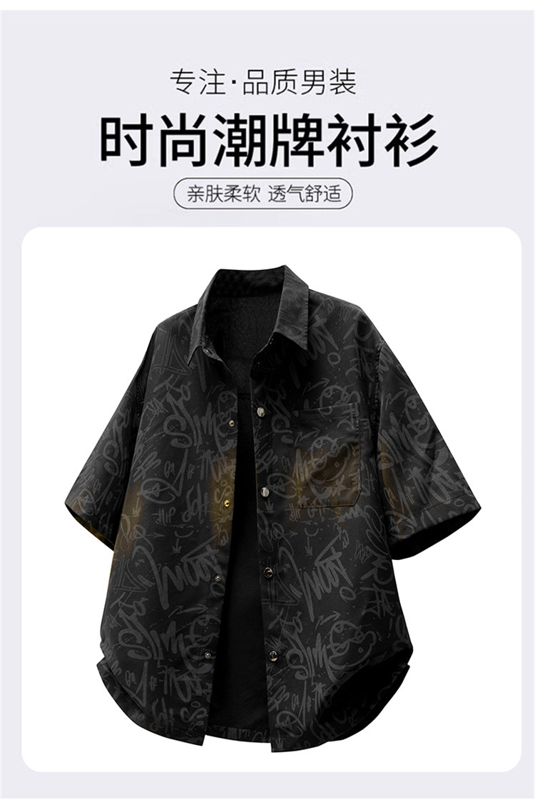 Wassup Line Trendy Brand Summer All-Over Print Short-Sleeve Shirt for Men, Loose Fit, Versatile, Breathable, Casual, Plus Size Top