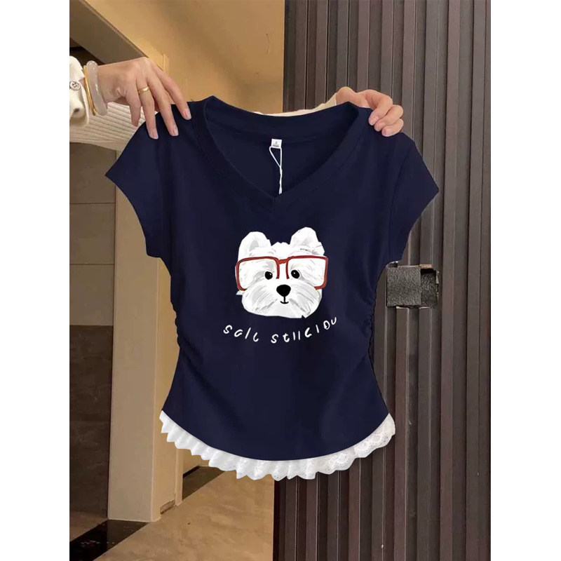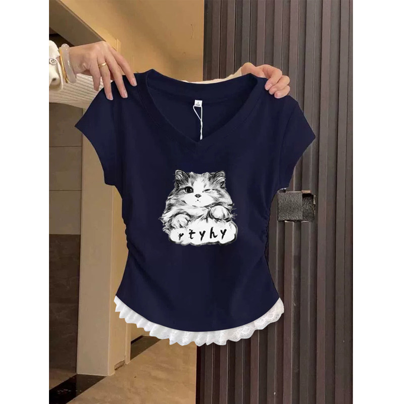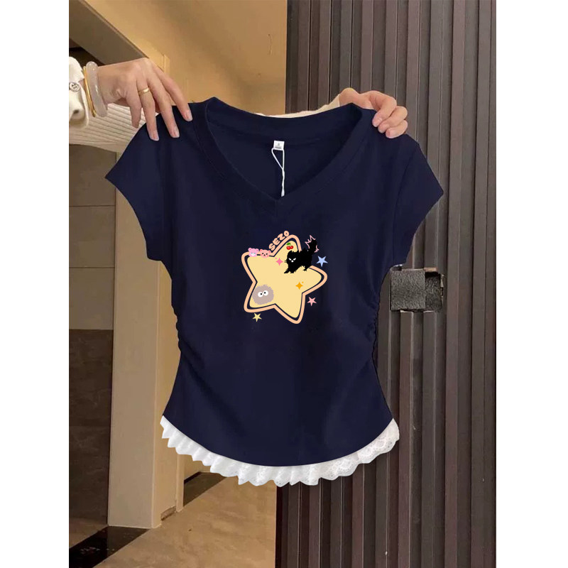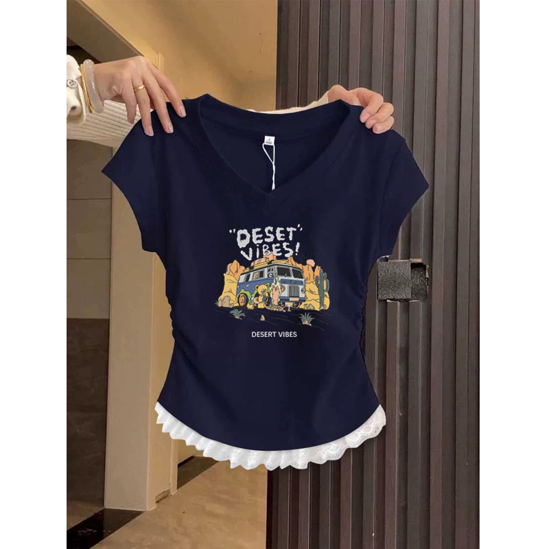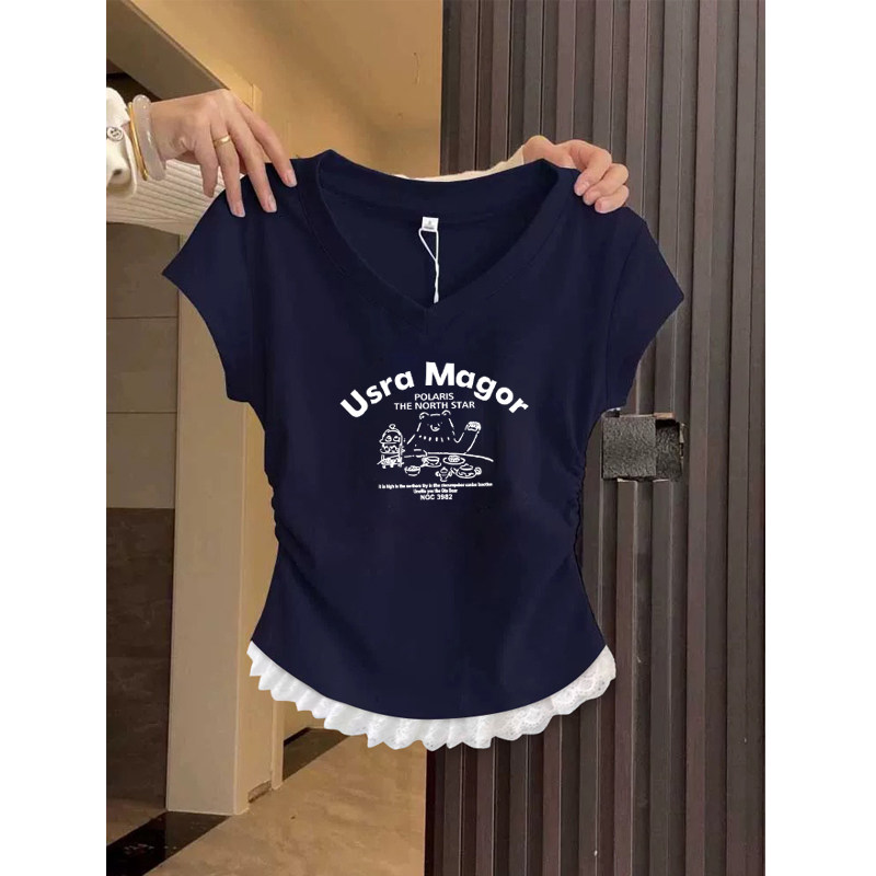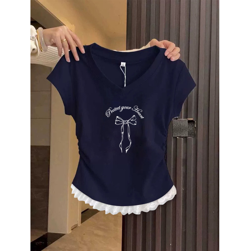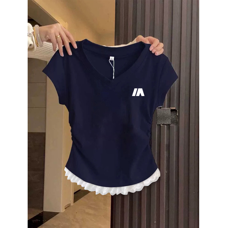2026 Summer New Short-Sleeved Women's T-Shirt, Korean Style, Niche Design, Very Beautiful, Cinched Waist, Regular Shoulder, V-Neck Top