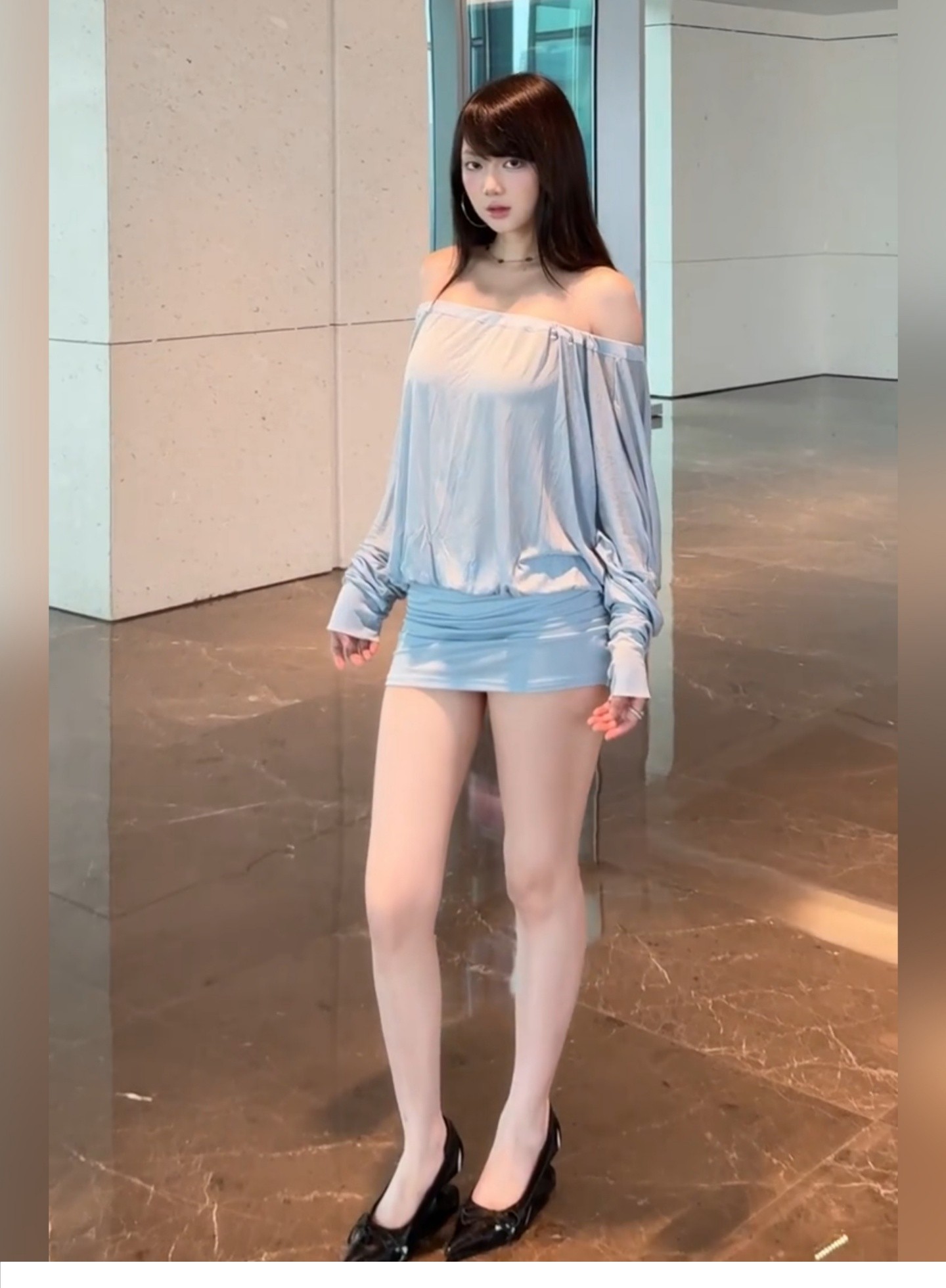 Sexy Hot Girl Blue One-Shoulder Long-Sleeved Dress for Women in Summer, Backless, Waist-Cinching, Slim-Fitting, Hip-Hugging Short Skirt