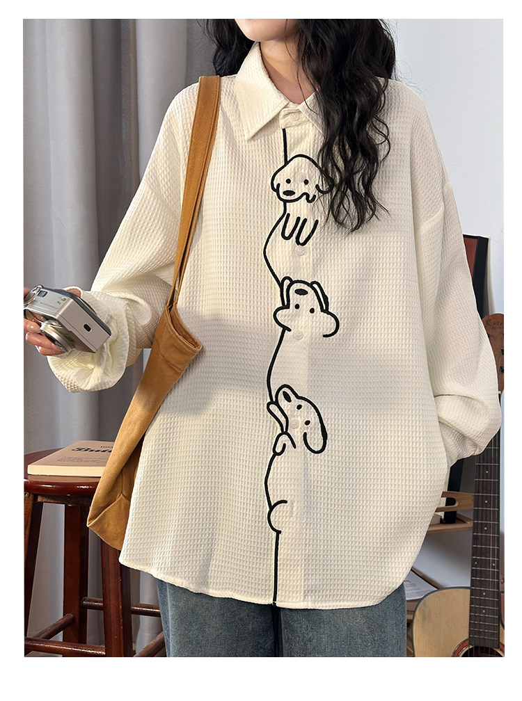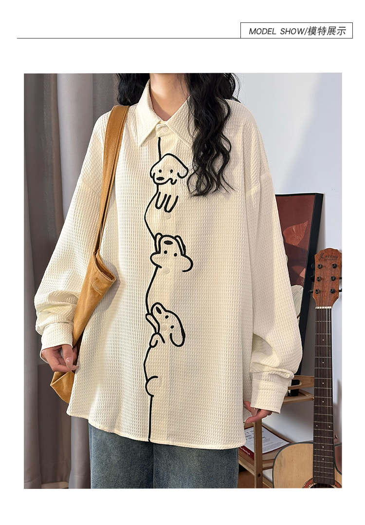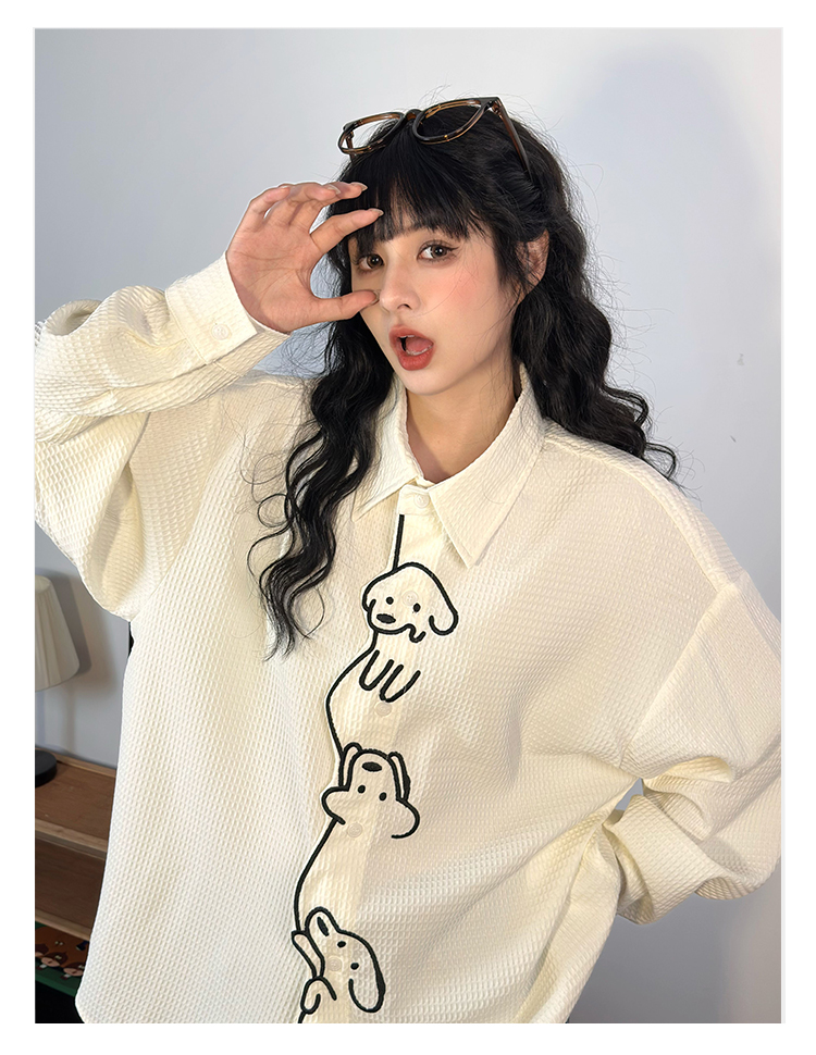 Soldout Original Waffle Pattern Fun Puppy Embroidery Long-Sleeve Shirt for Women, New Loose Casual Versatile Shirt