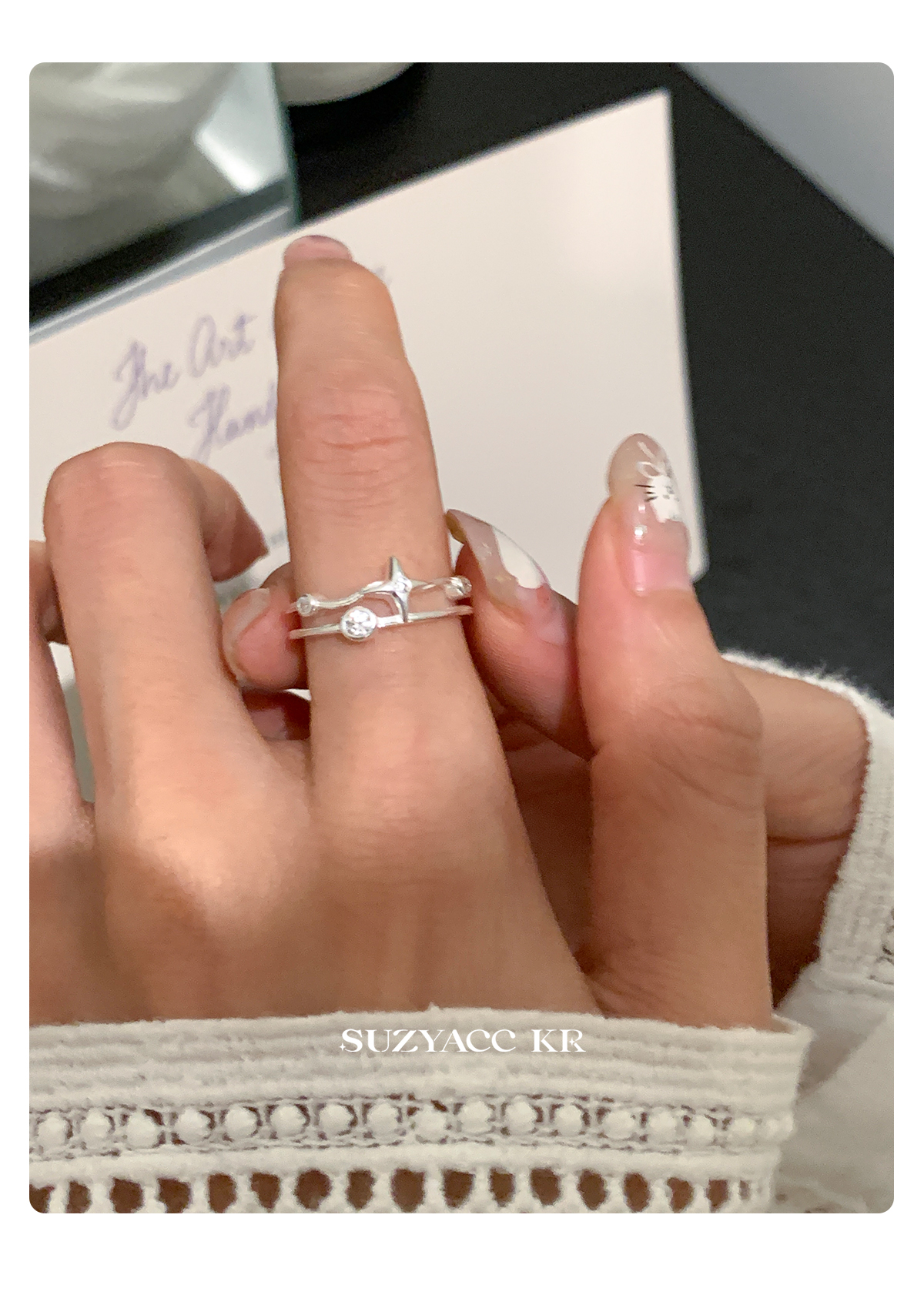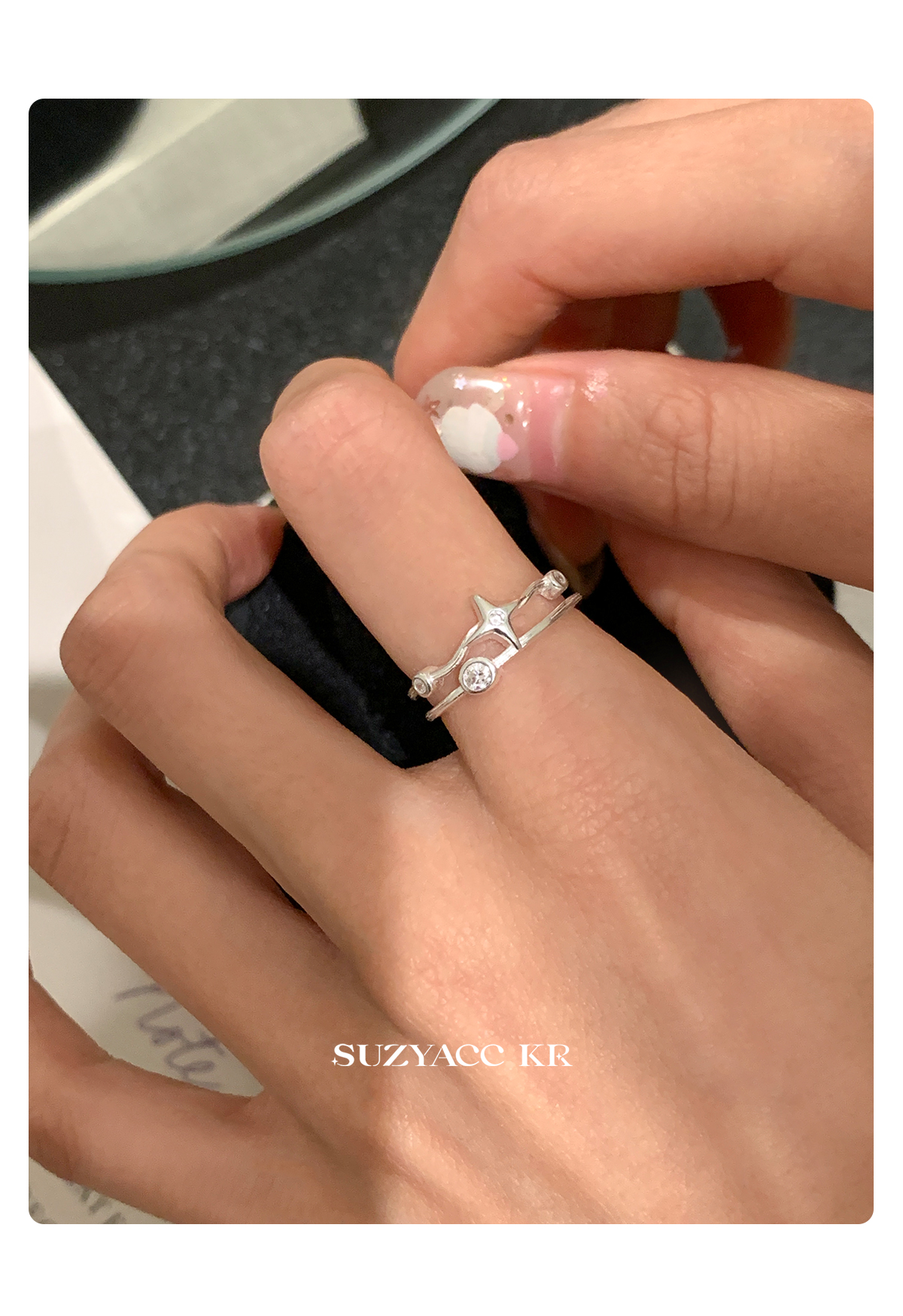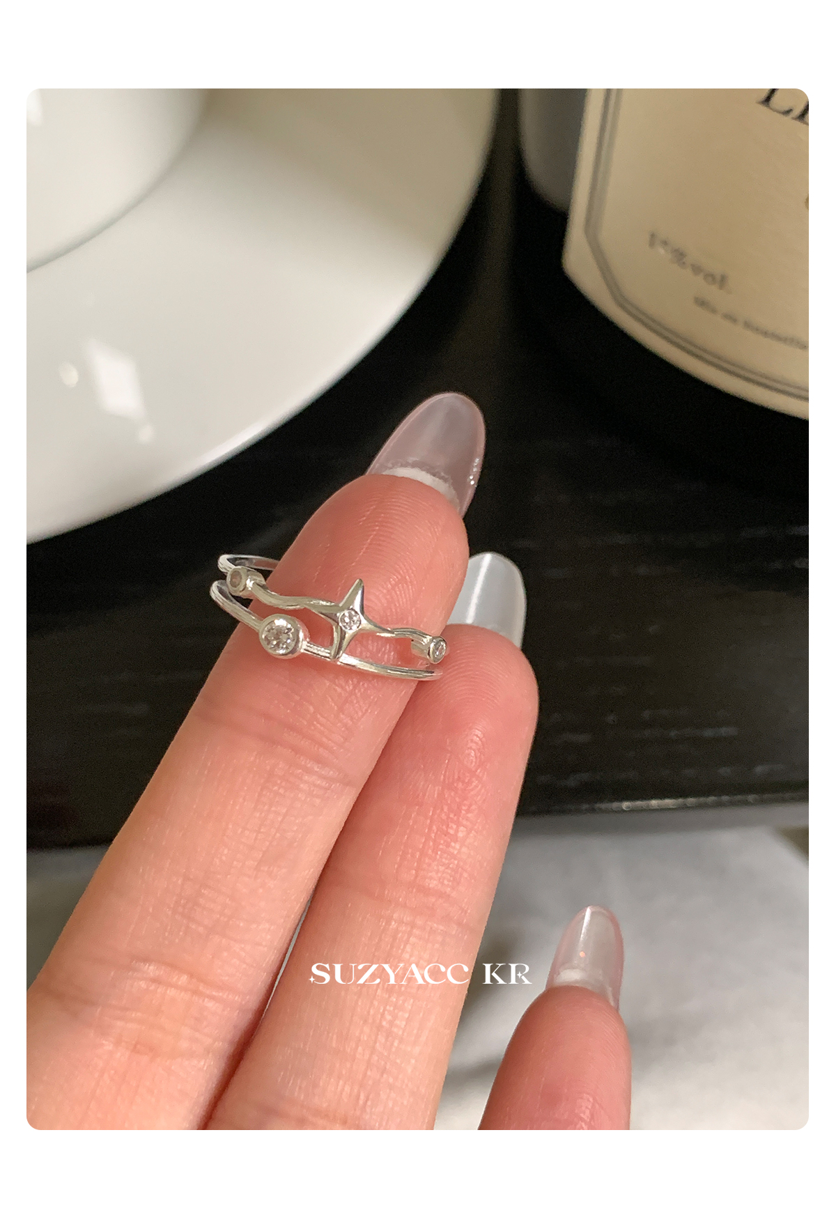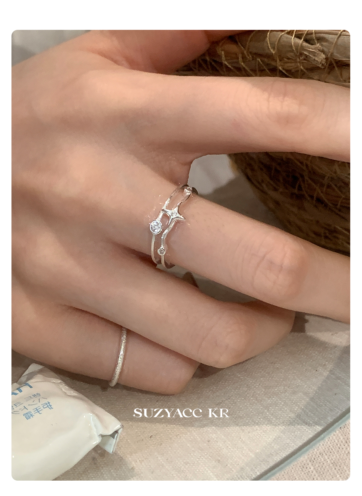 Suzyacc Kr Slim Sterling Silver Four-Pointed Star Synthetic Zircon Double-Layer Ring Niche Design Index Finger Ring