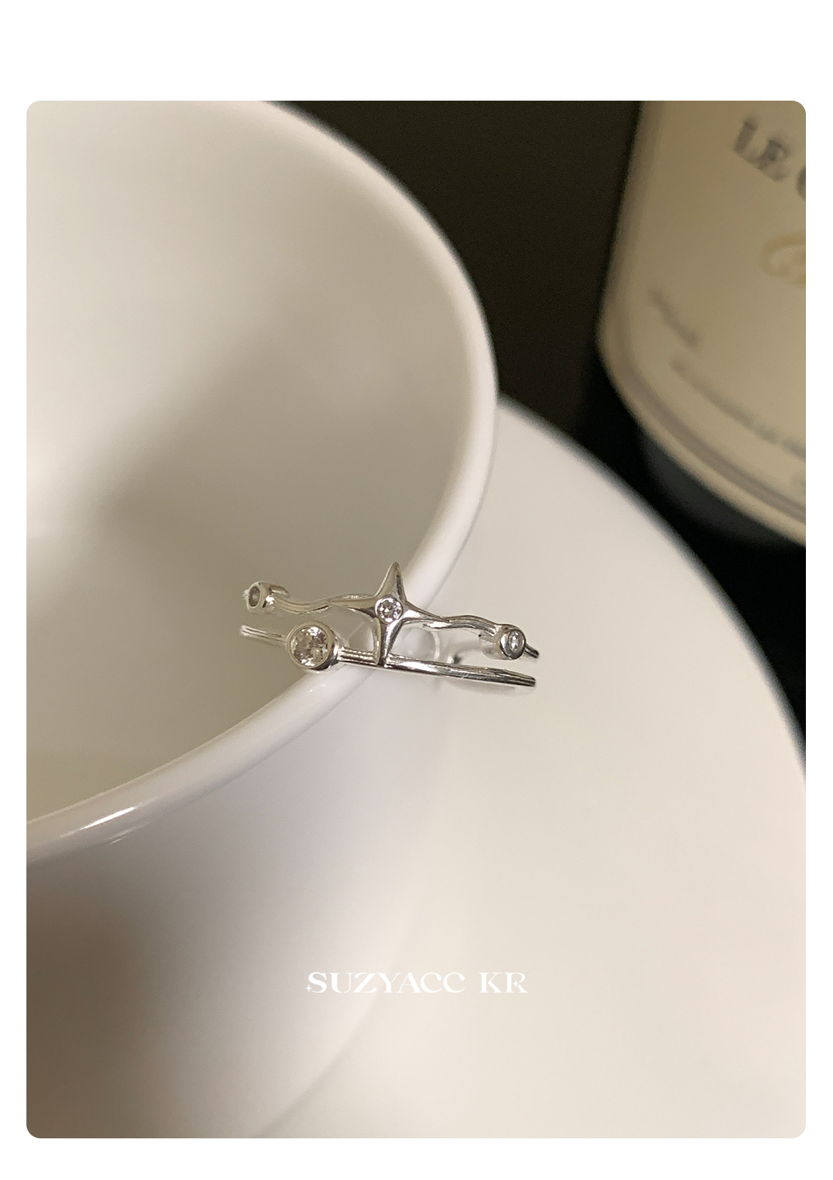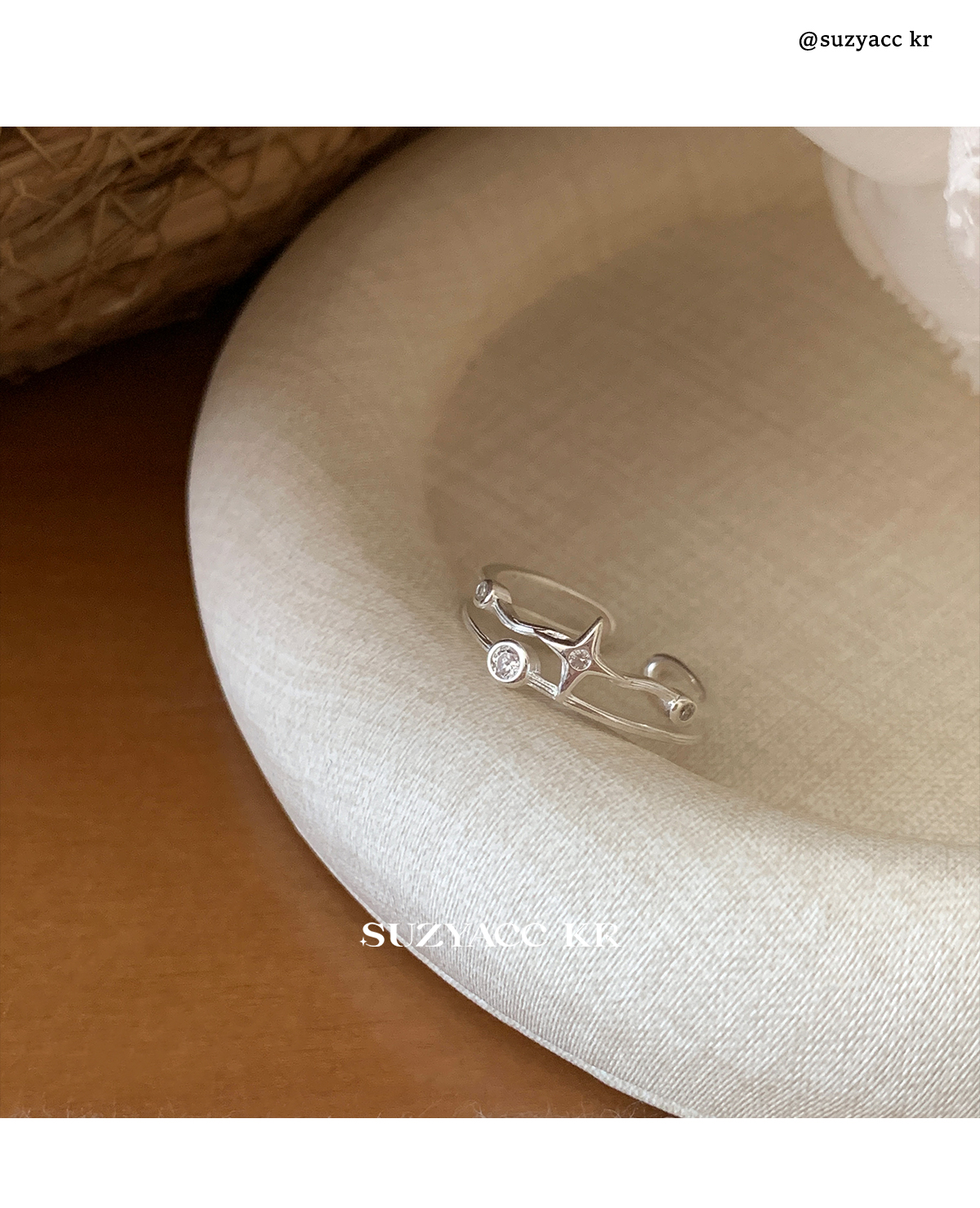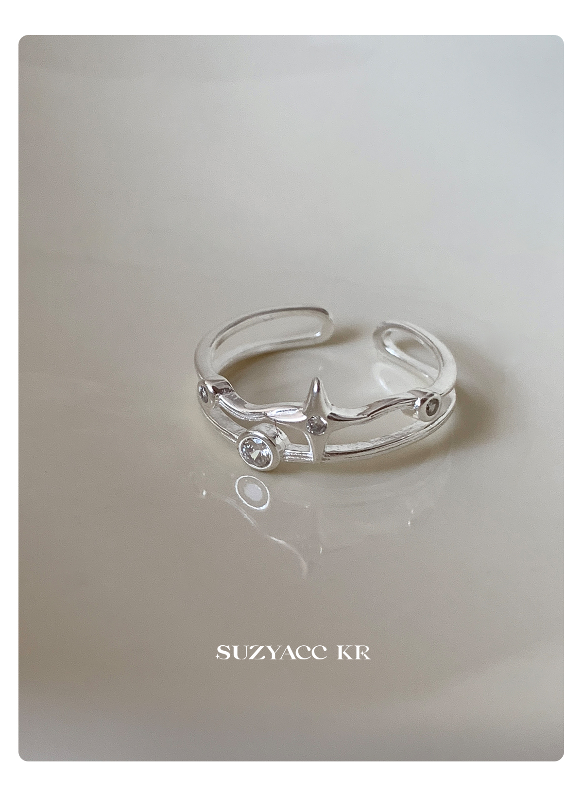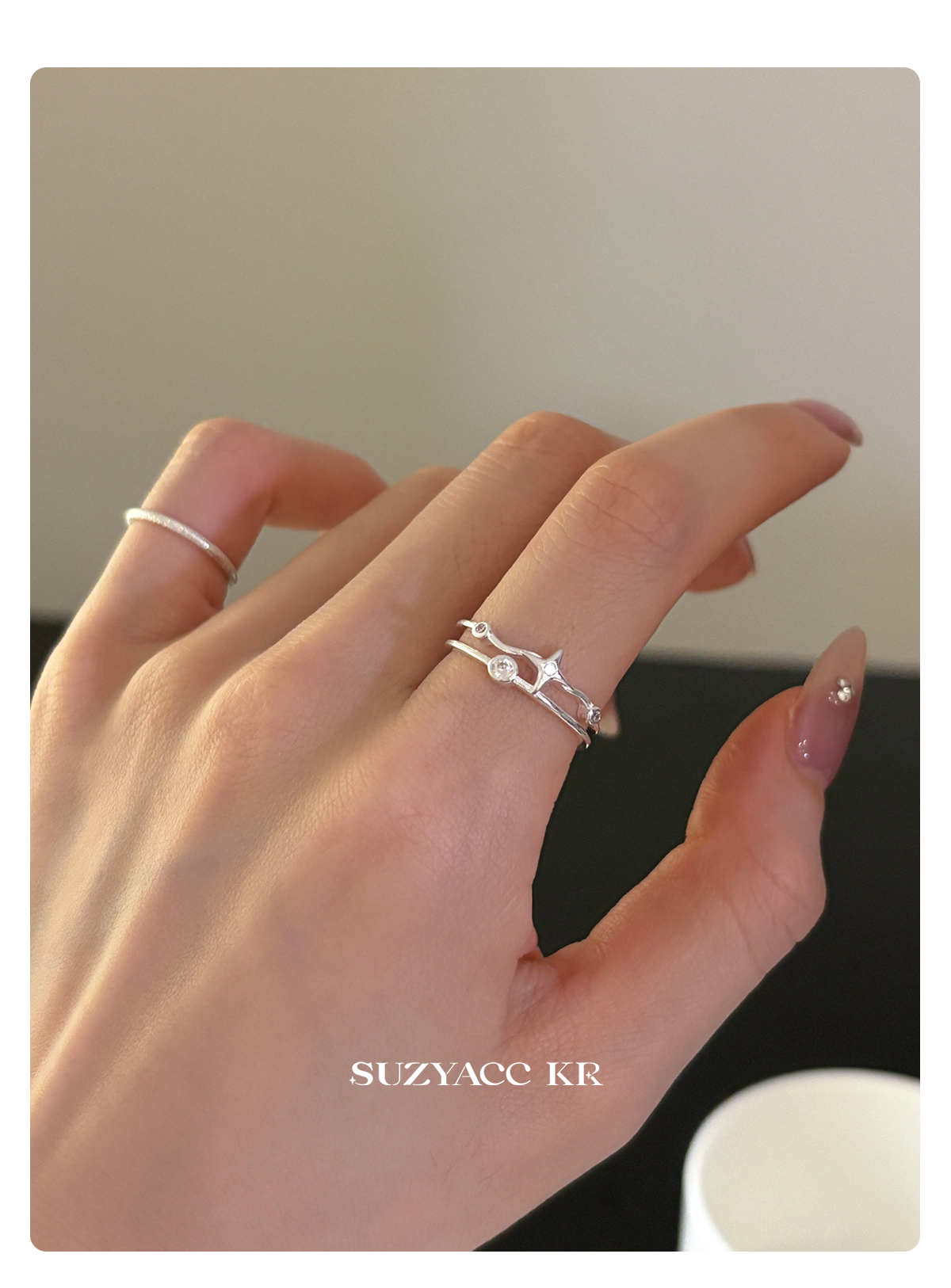 Suzyacc Kr Slim Sterling Silver Four-Pointed Star Synthetic Zircon Double-Layer Ring Niche Design Index Finger Ring