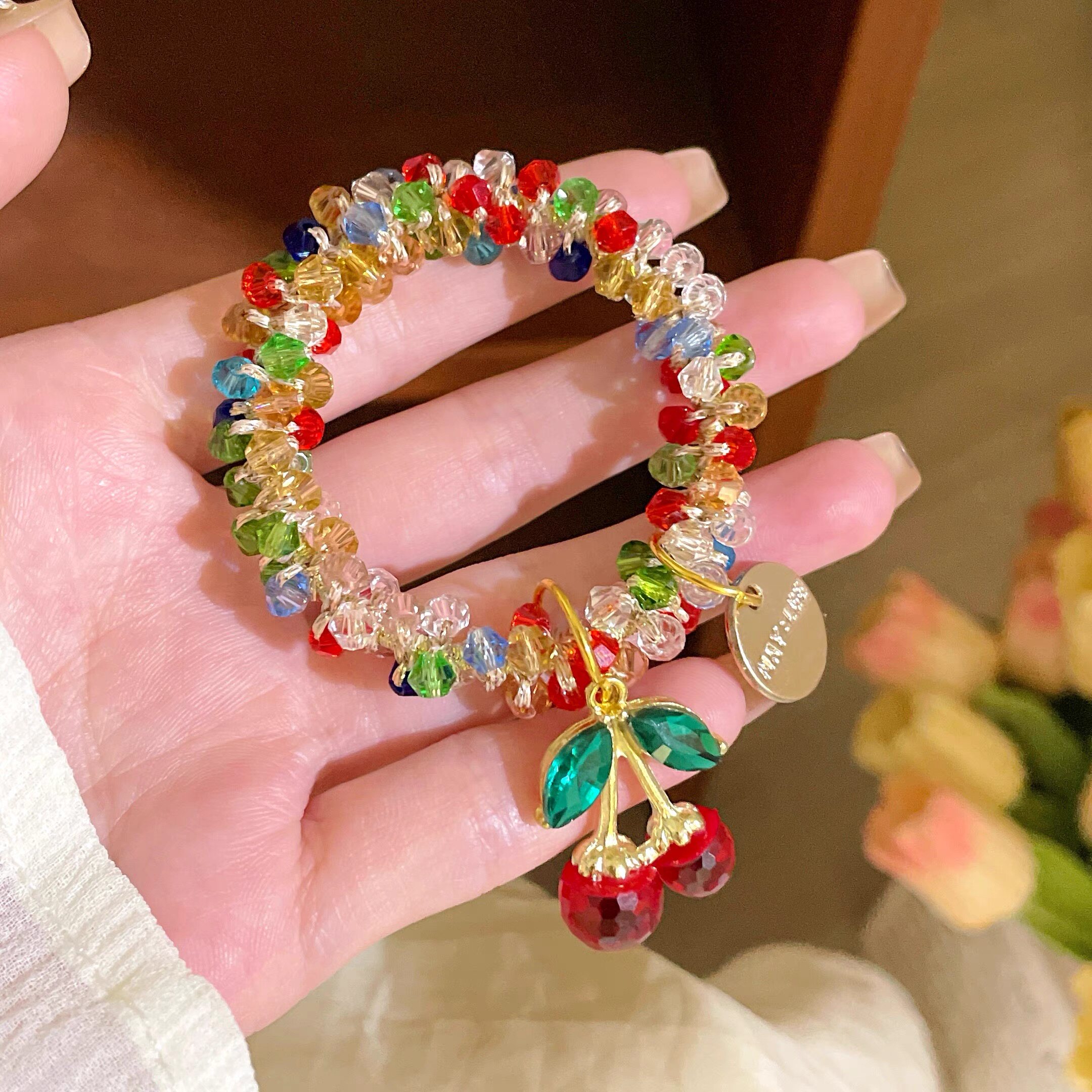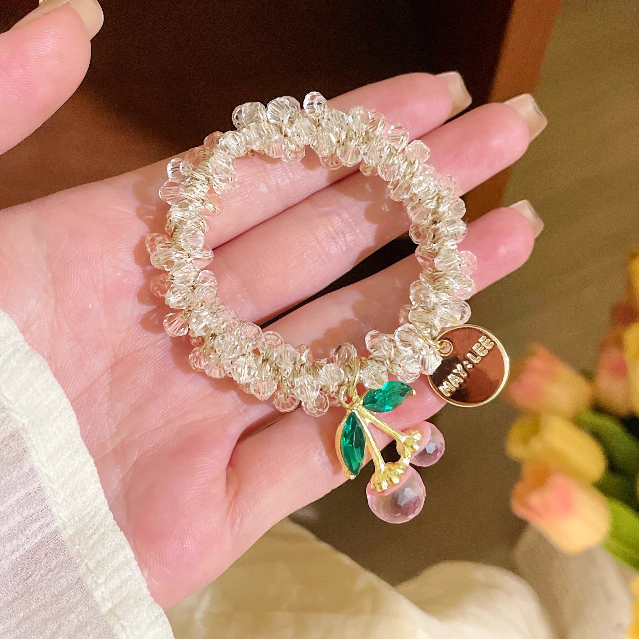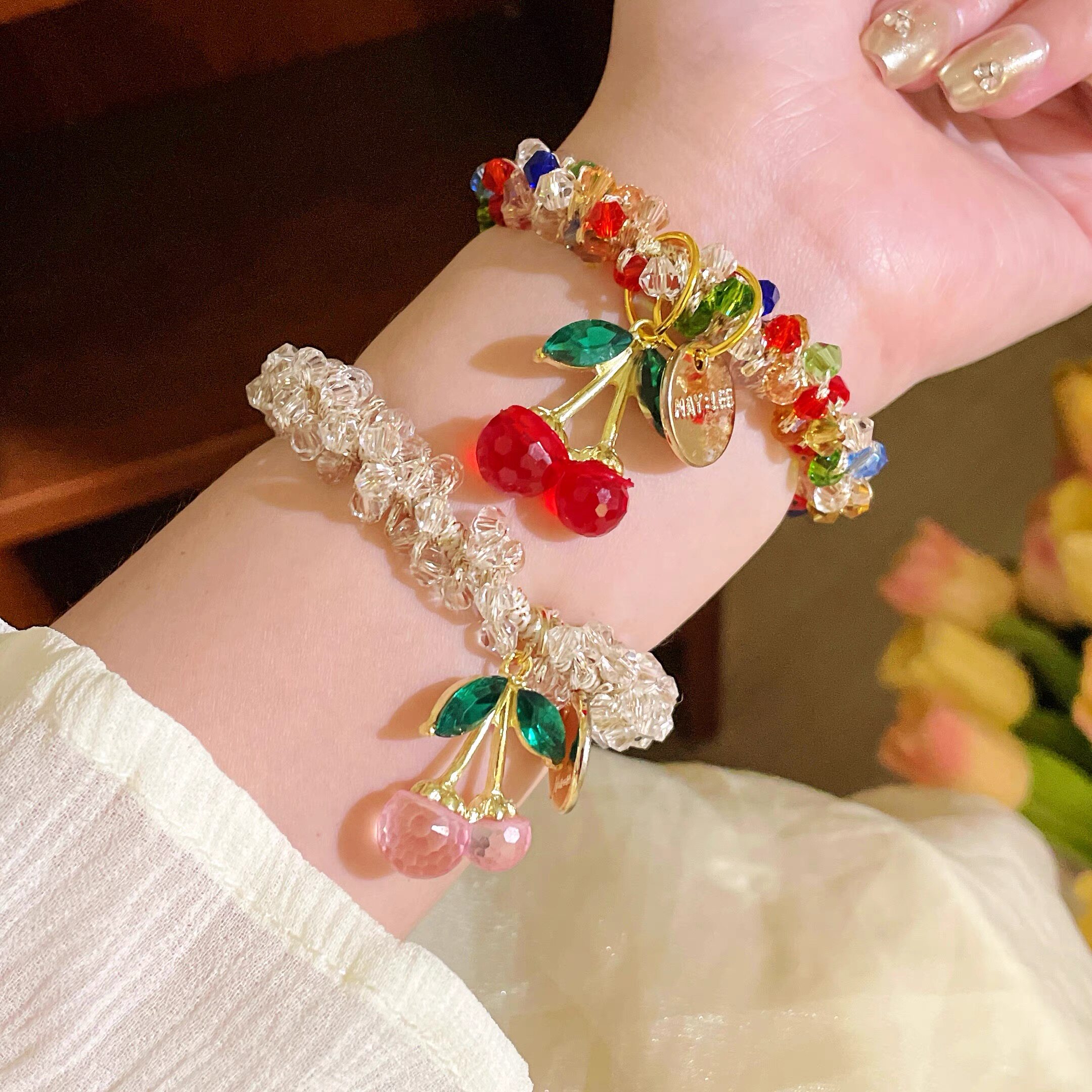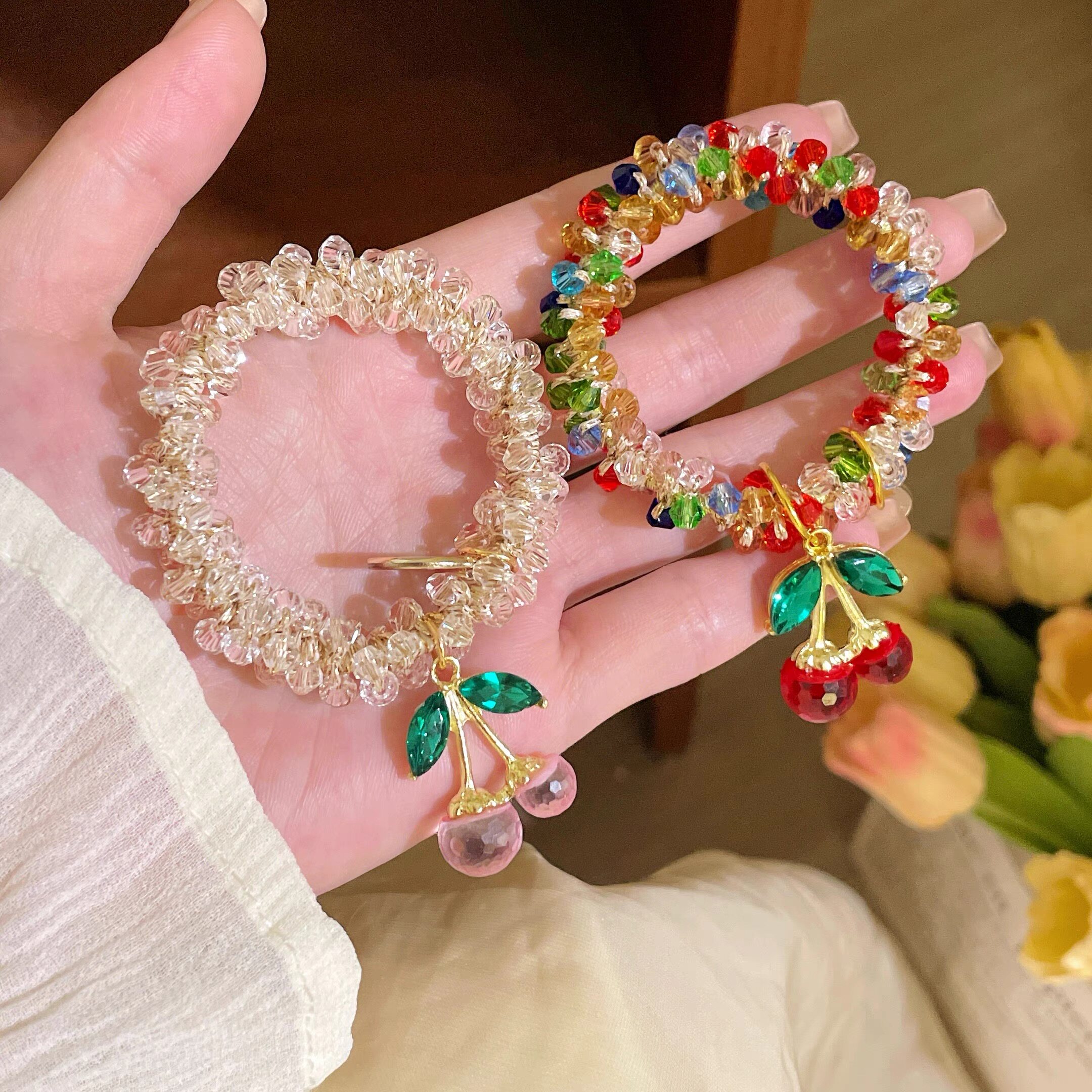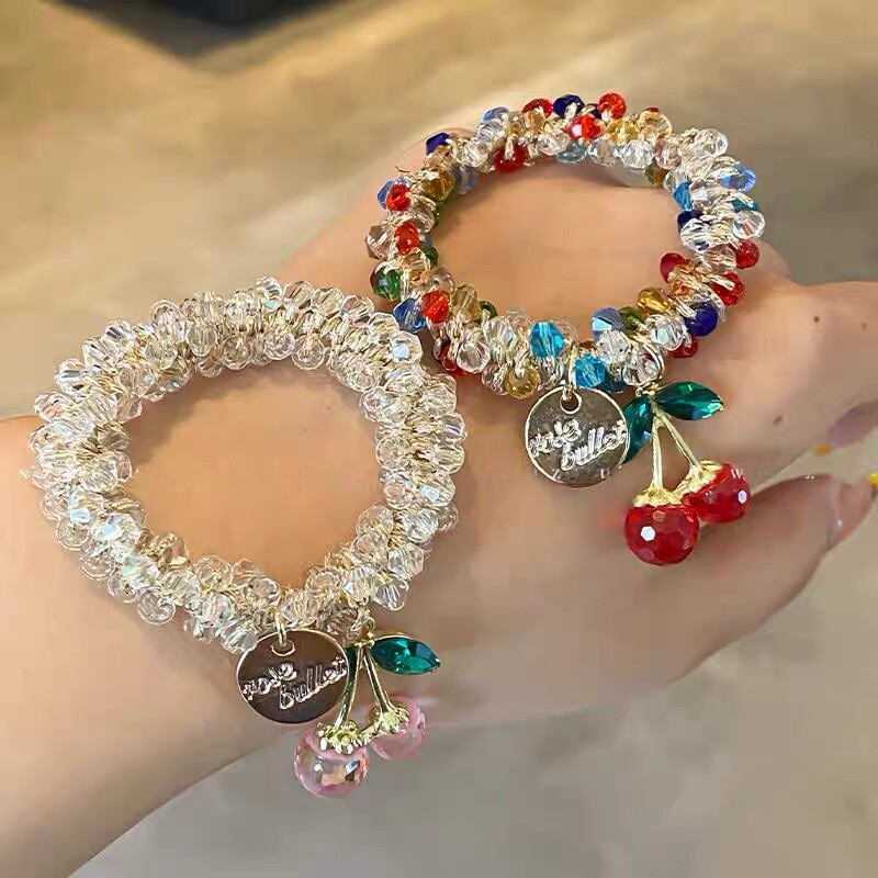 Korean Rhinestone Colorful Crystal Bracelet Dual-Use Hair Tie Headband Best Friend Hair Tie Cherry Elastic Band Ponytail Hair Accessory for Women