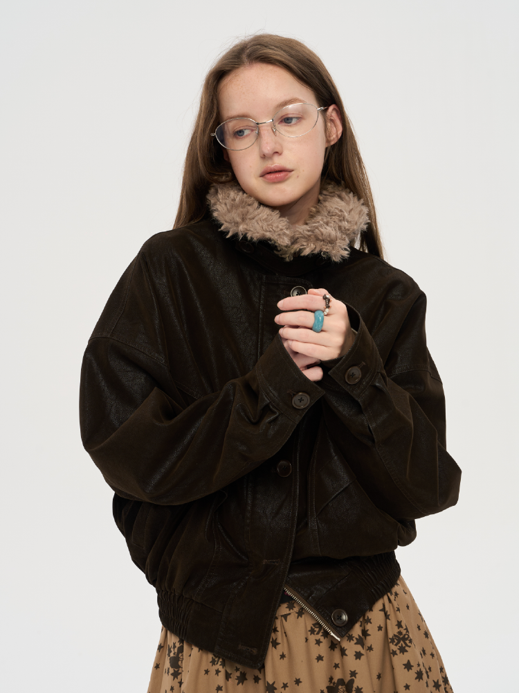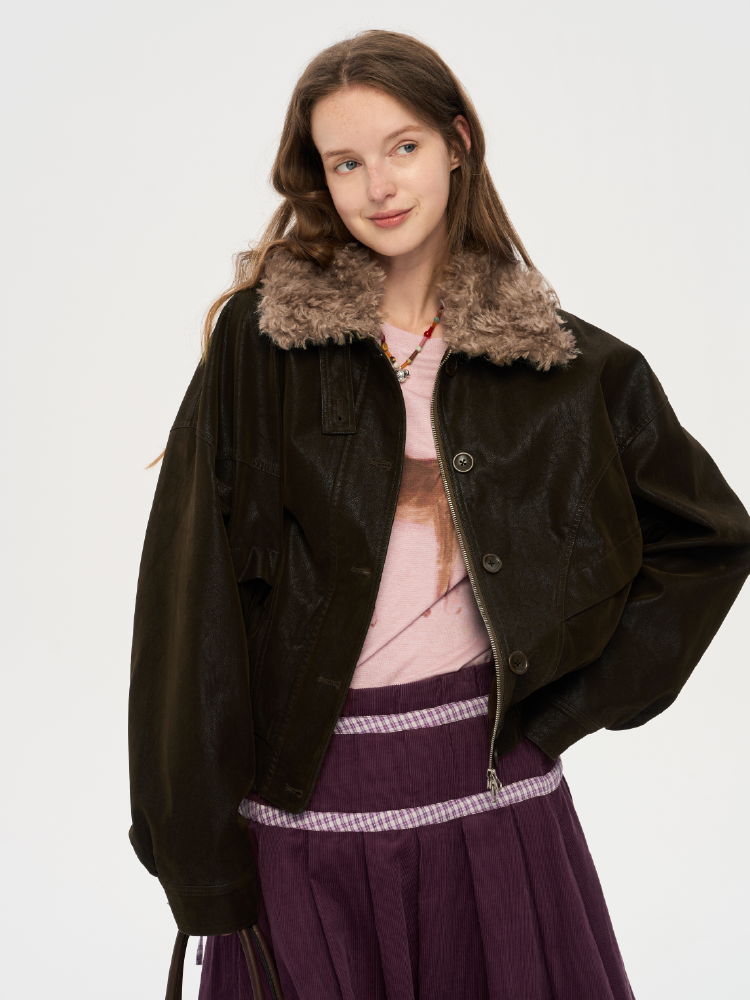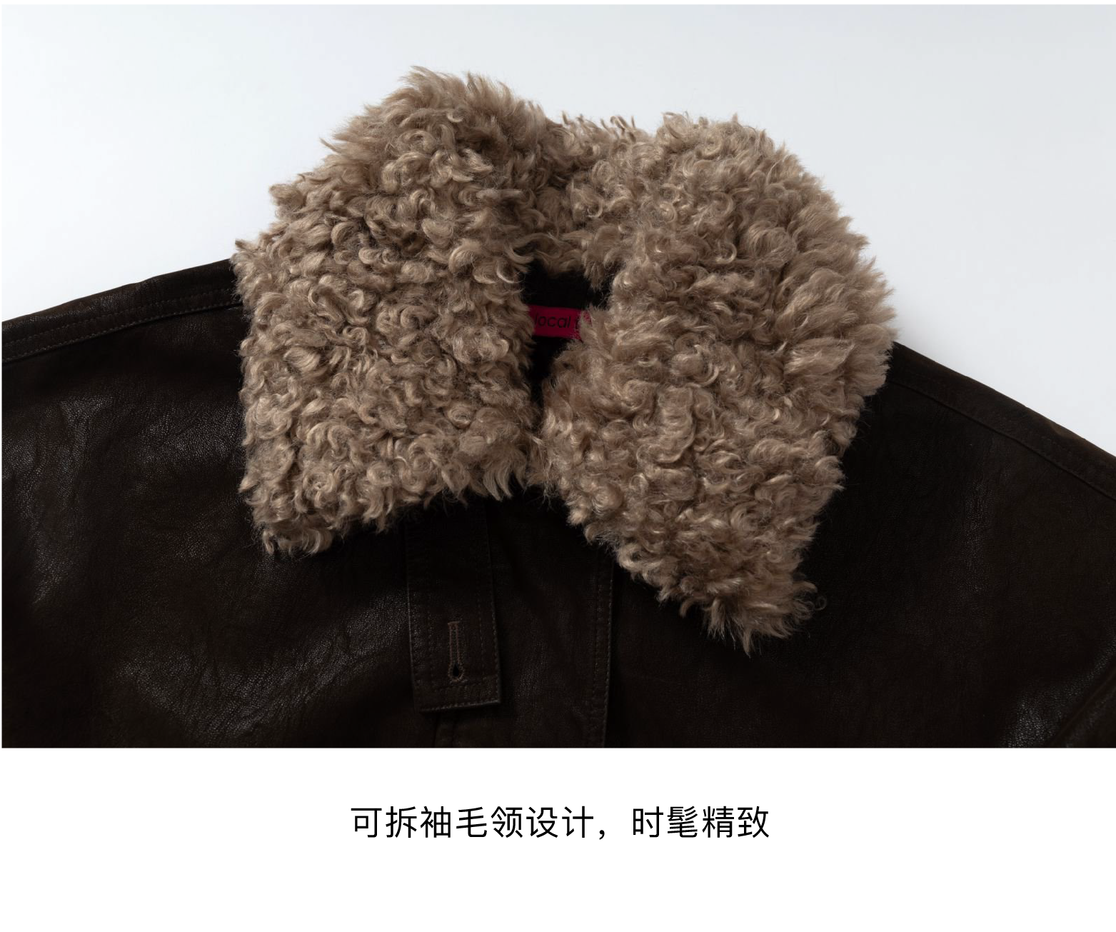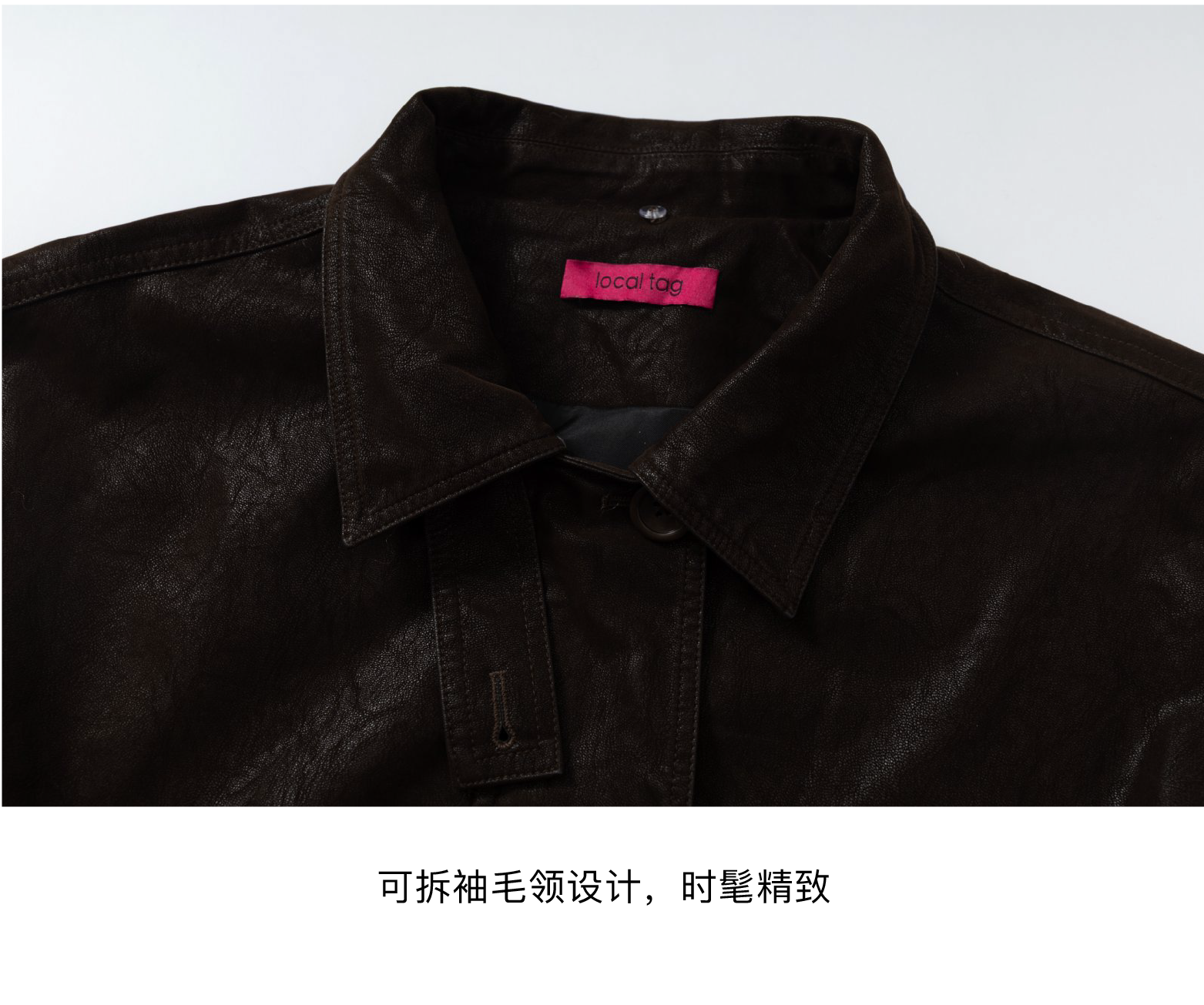 { Local Tag } Bol Farm Detachable Fur Collar Washed Leather Jacket Heavy-Duty Distressed Lapel Coat