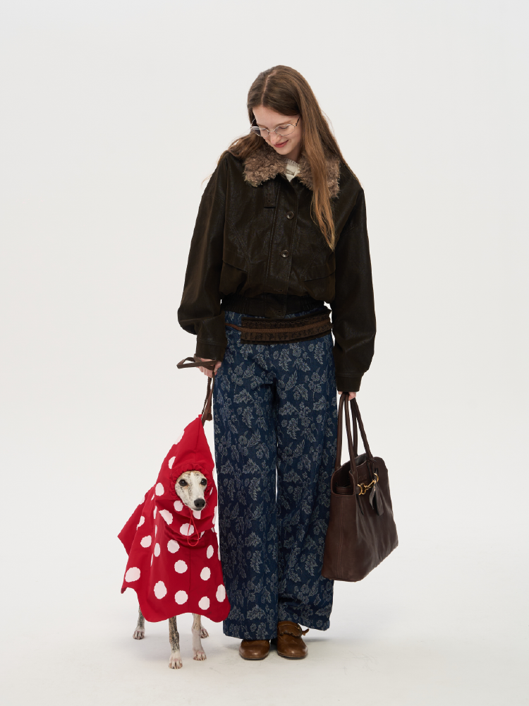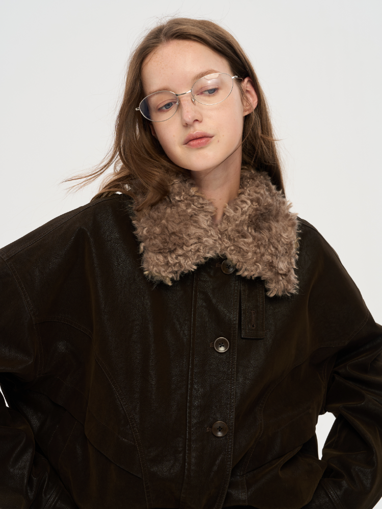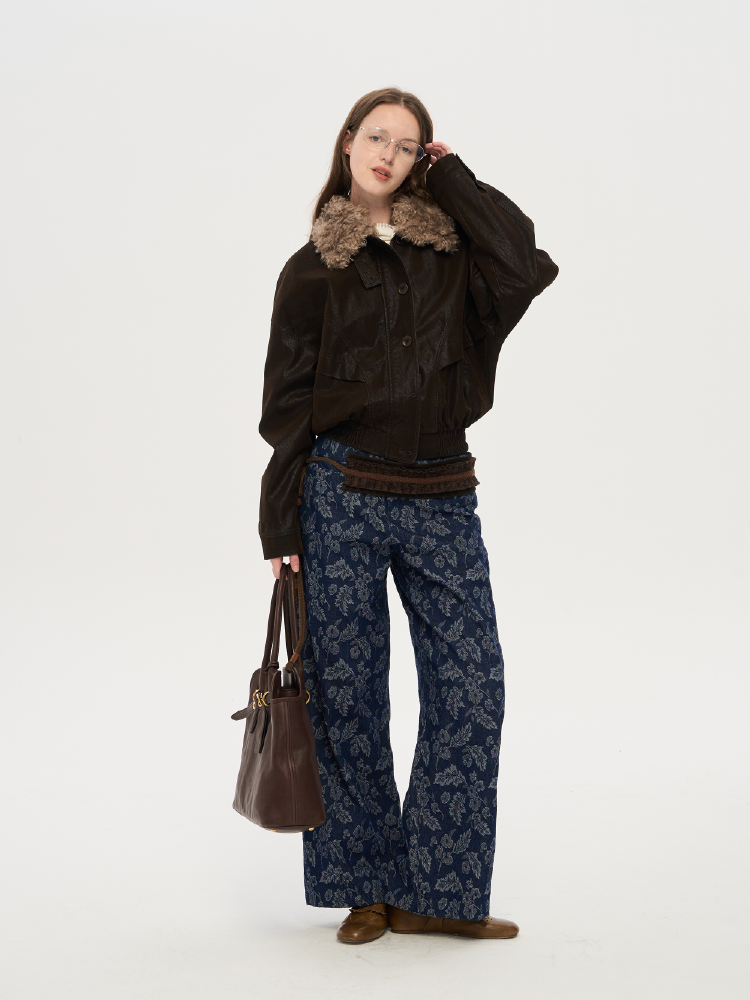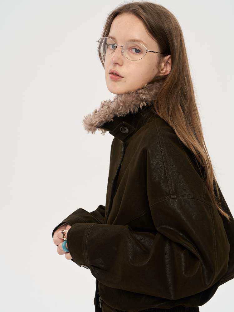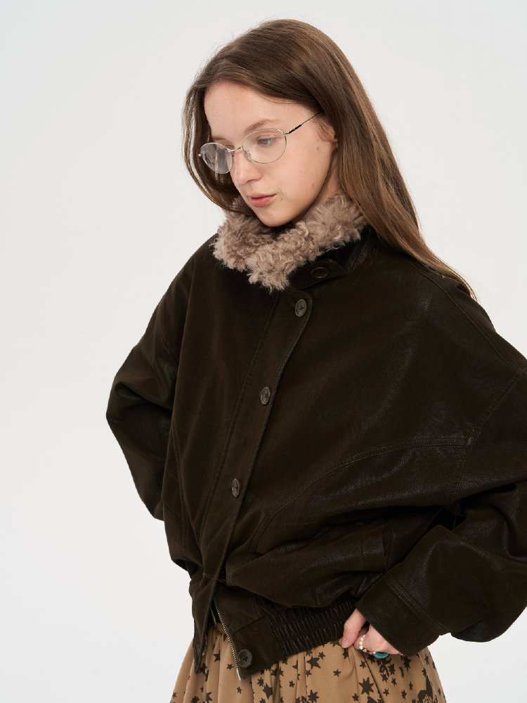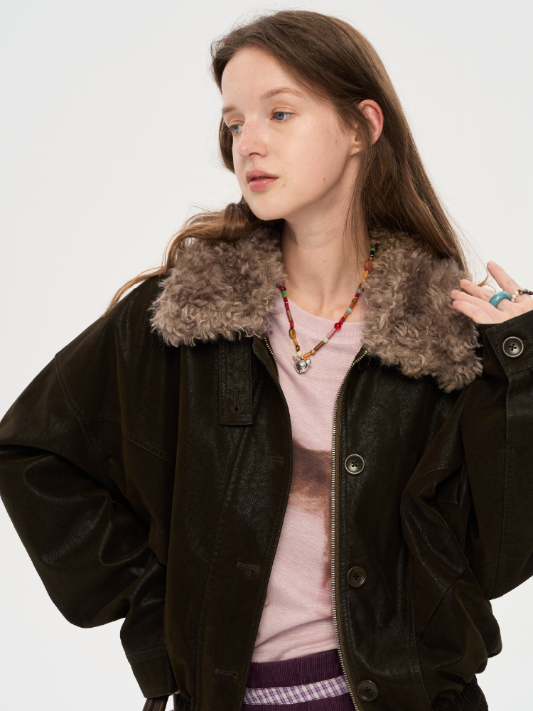 { Local Tag } Bol Farm Detachable Fur Collar Washed Leather Jacket Heavy-Duty Distressed Lapel Coat