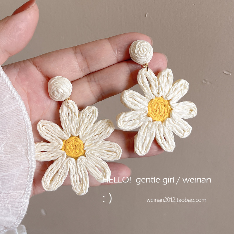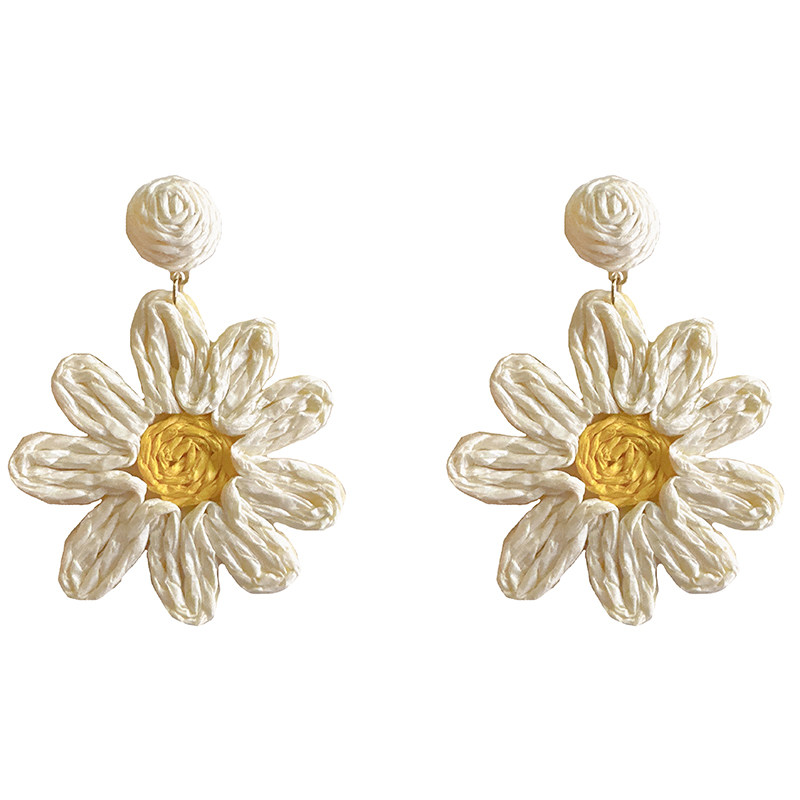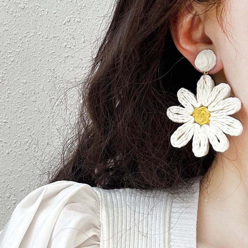 Exaggerated Milky White Raffia Woven Large Chrysanthemum Flower Earrings, Holiday Travel Photo Accessories, Earrings, Ear Pendants, Jewelry