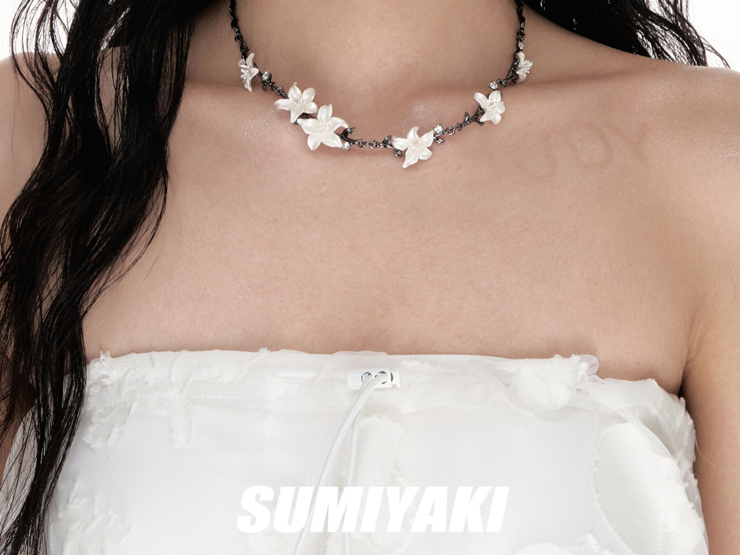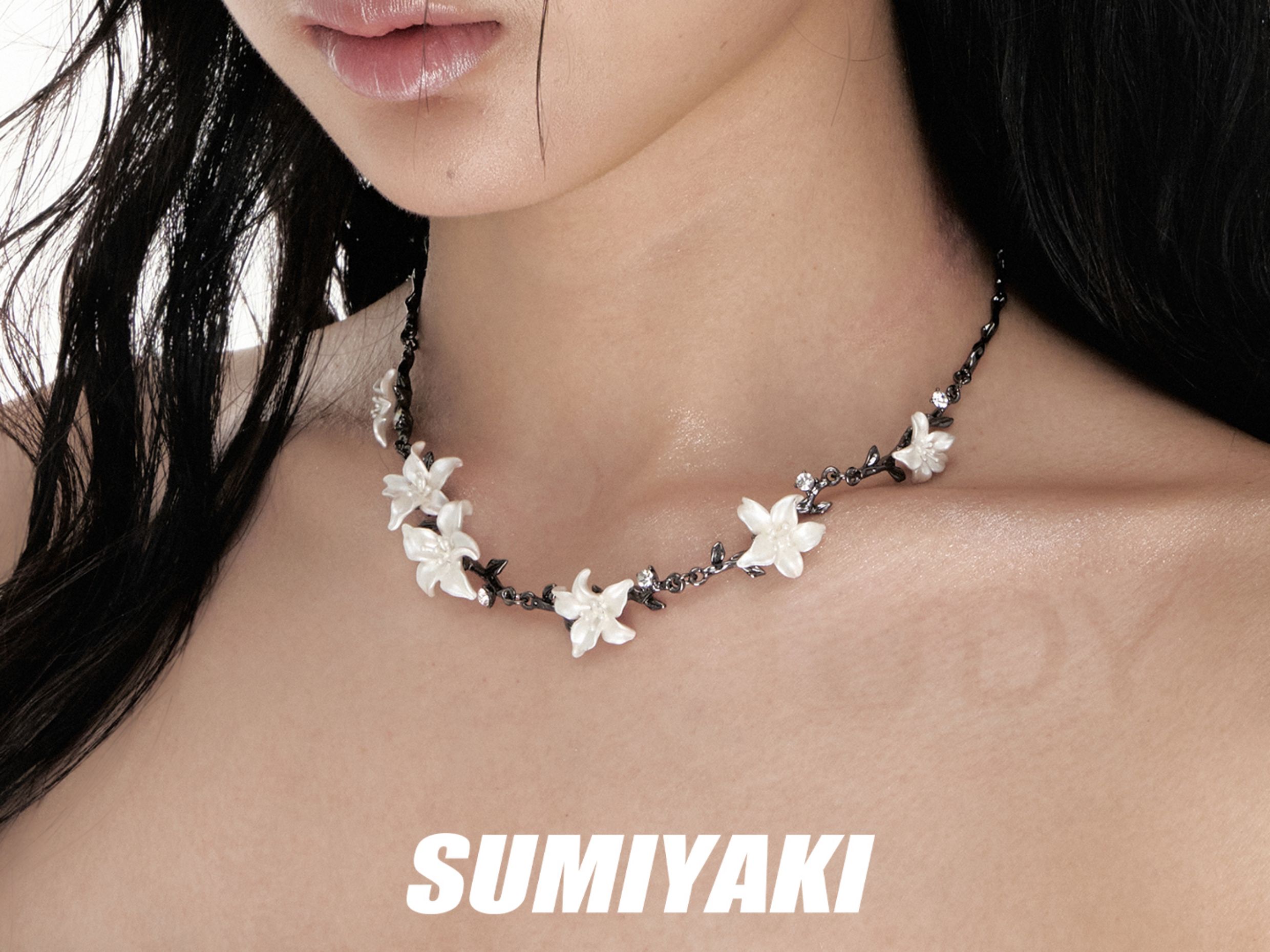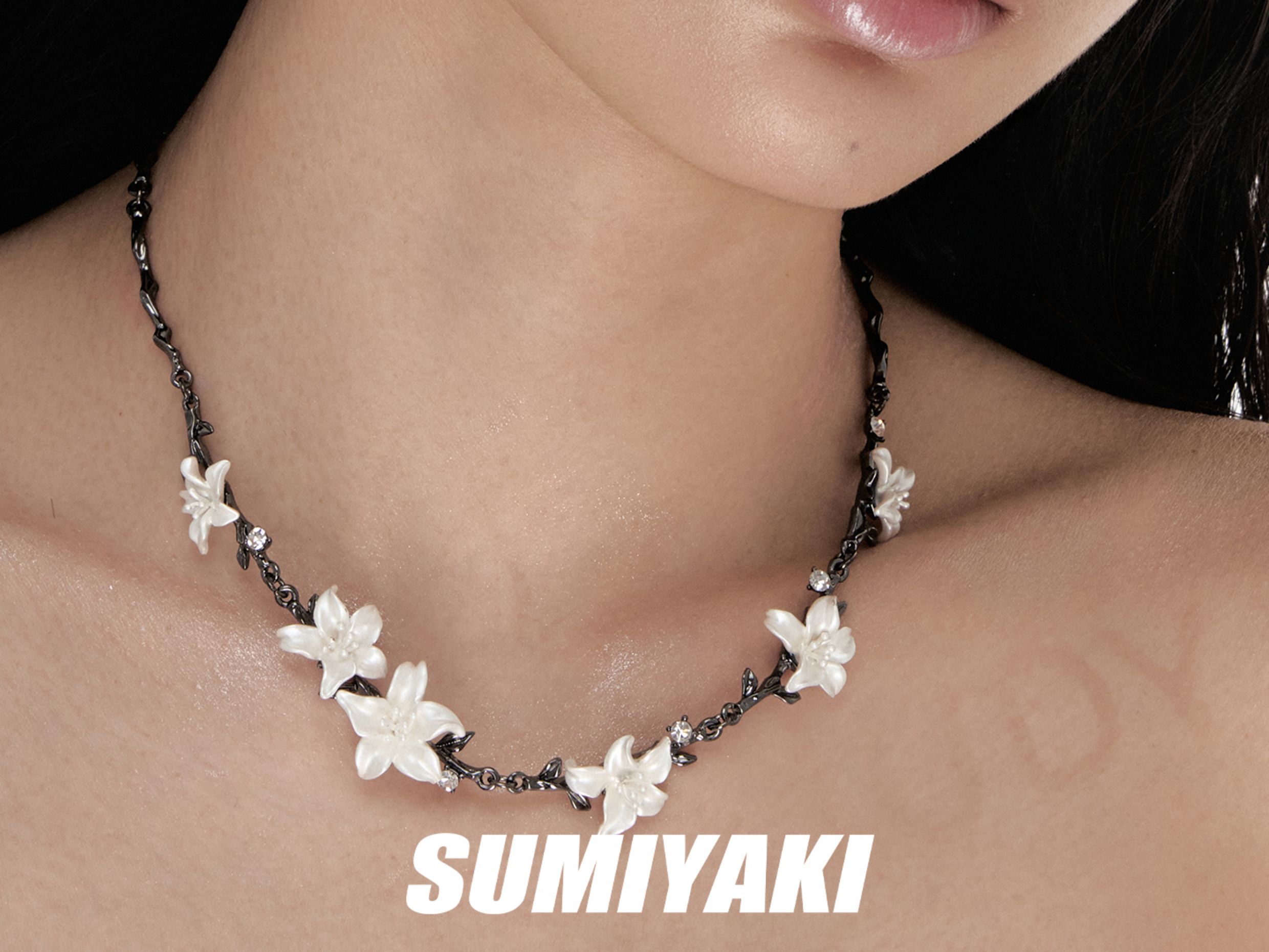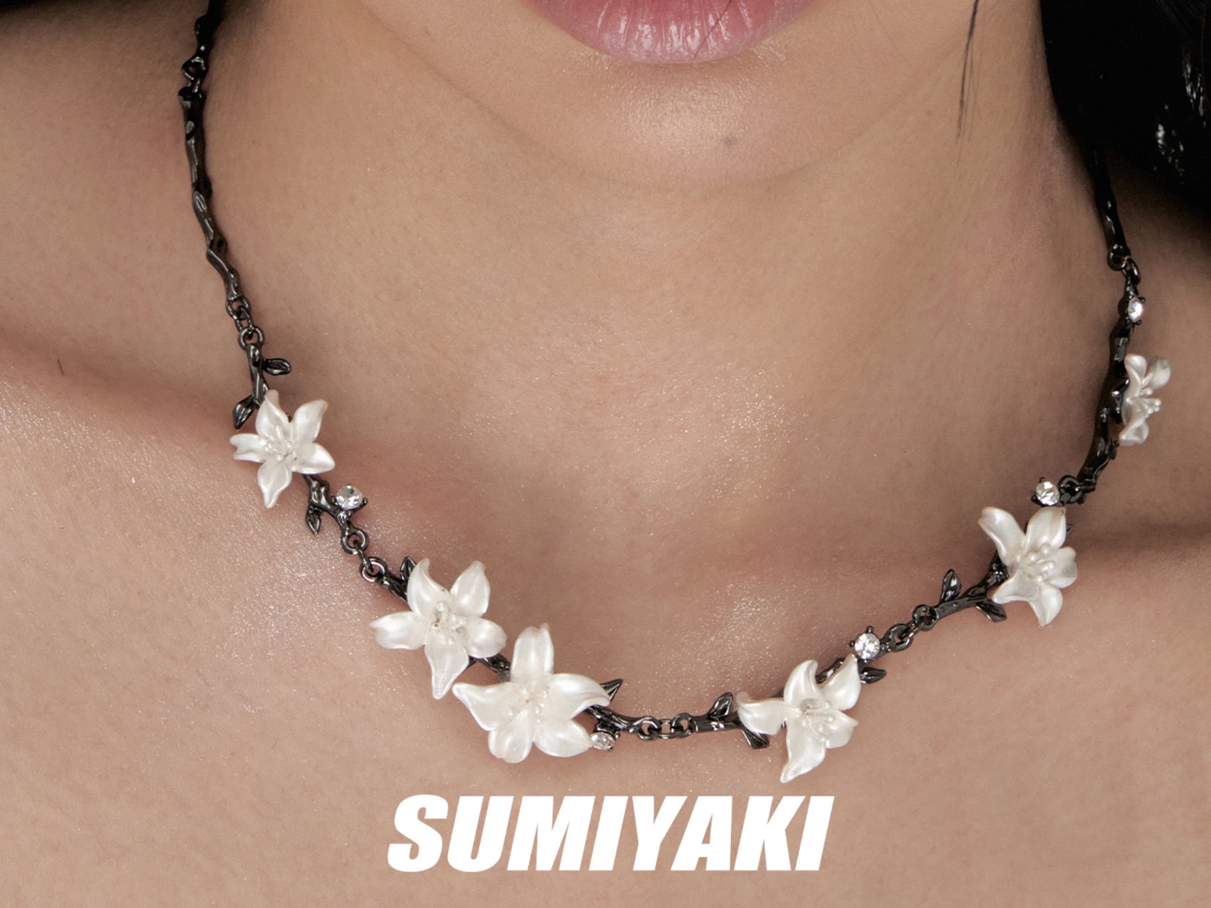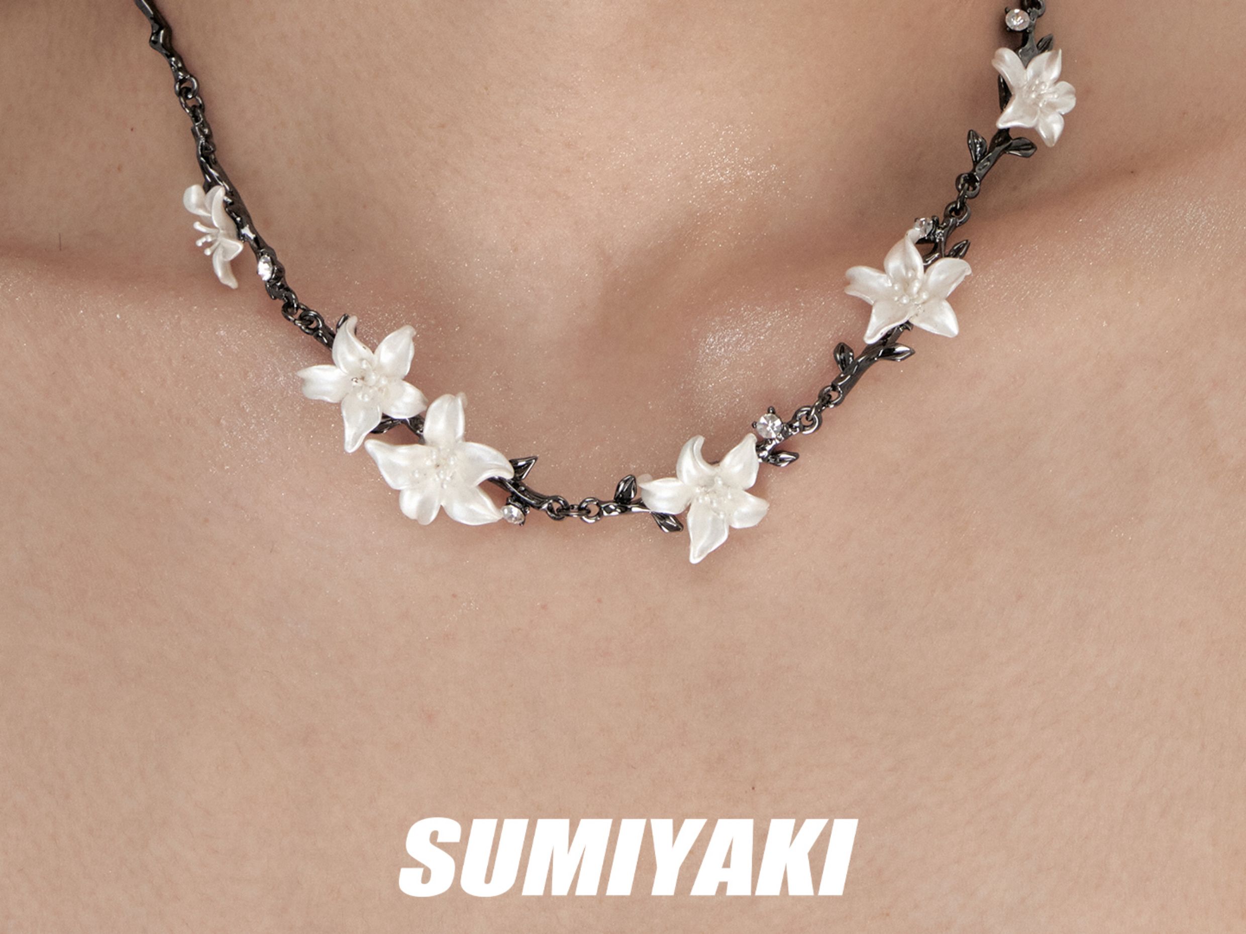 Sumiyaki Pale Whisper Series Pure White Cherry Blossom Necklace Niche Design Black and White Flower Dark Black Clavicle Chain