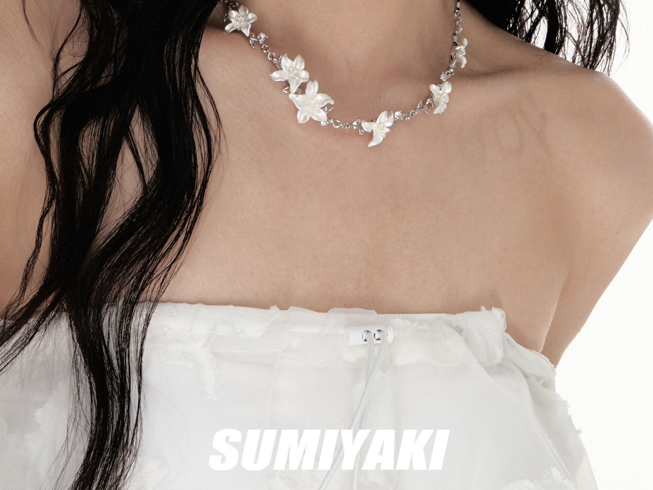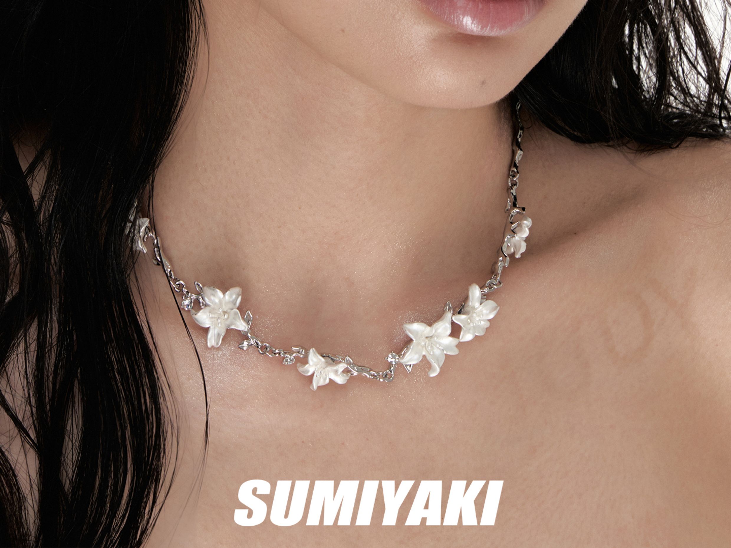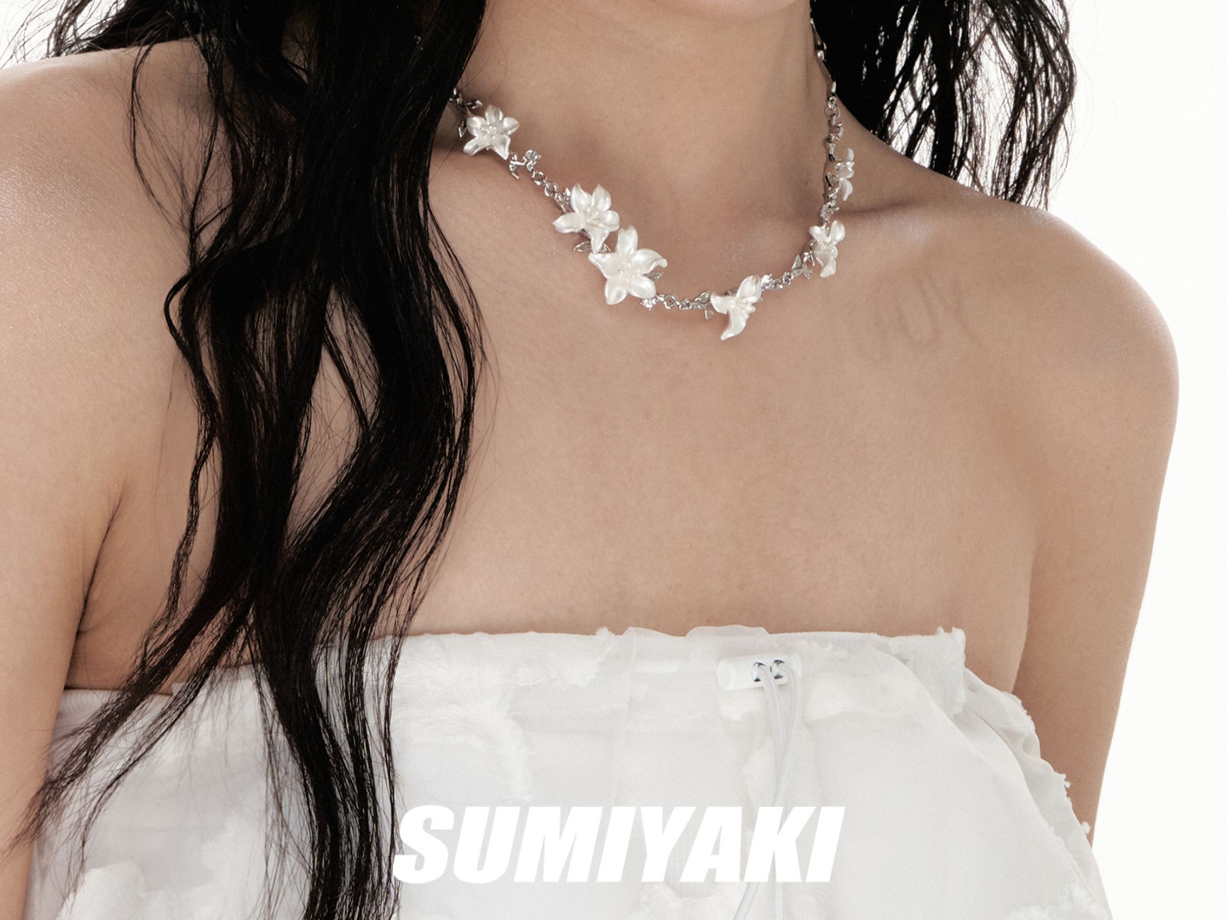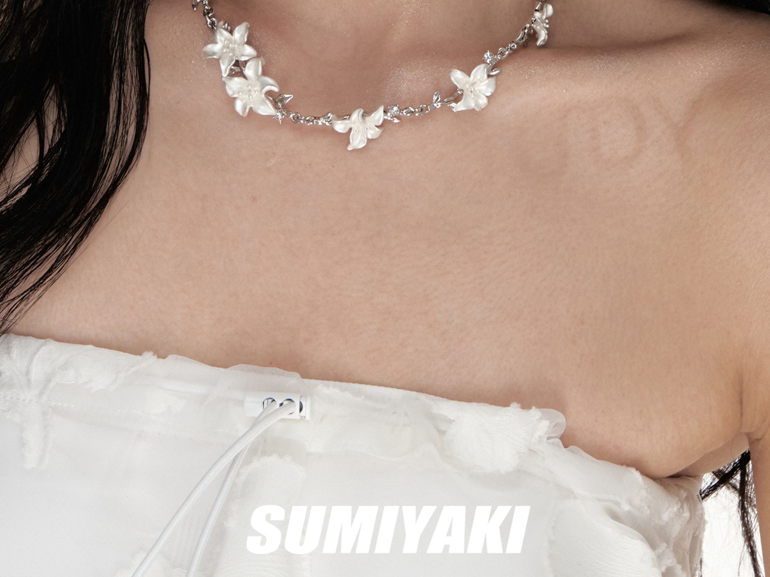 Sumiyaki Pale Whisper Series Pure White Cherry Blossom Necklace Niche Design Black and White Flower Dark Black Clavicle Chain