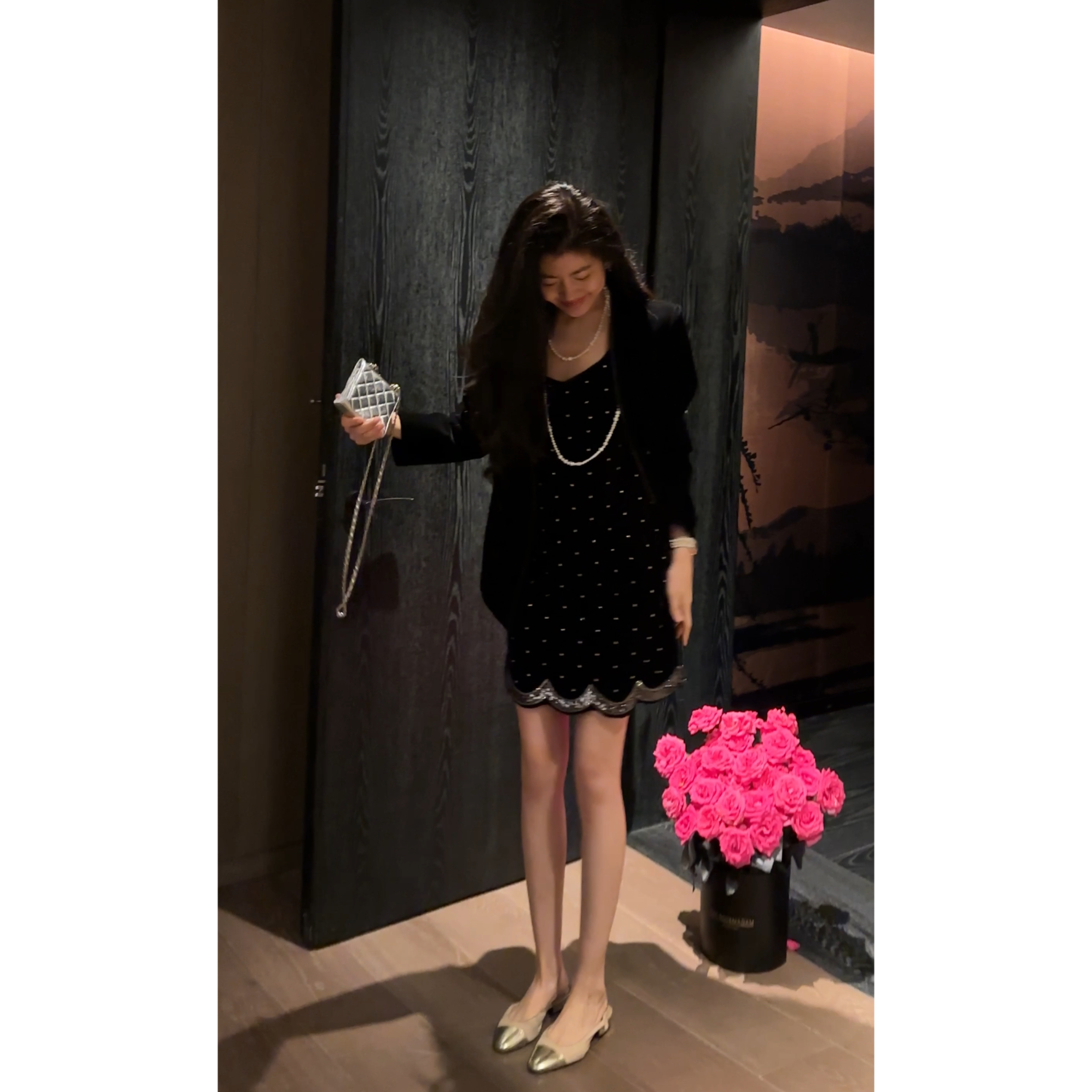 N.Cou 25 Autumn New Fashionable and Elegant Black Velvet Embroidered Wave Rhinestone Strap Dress