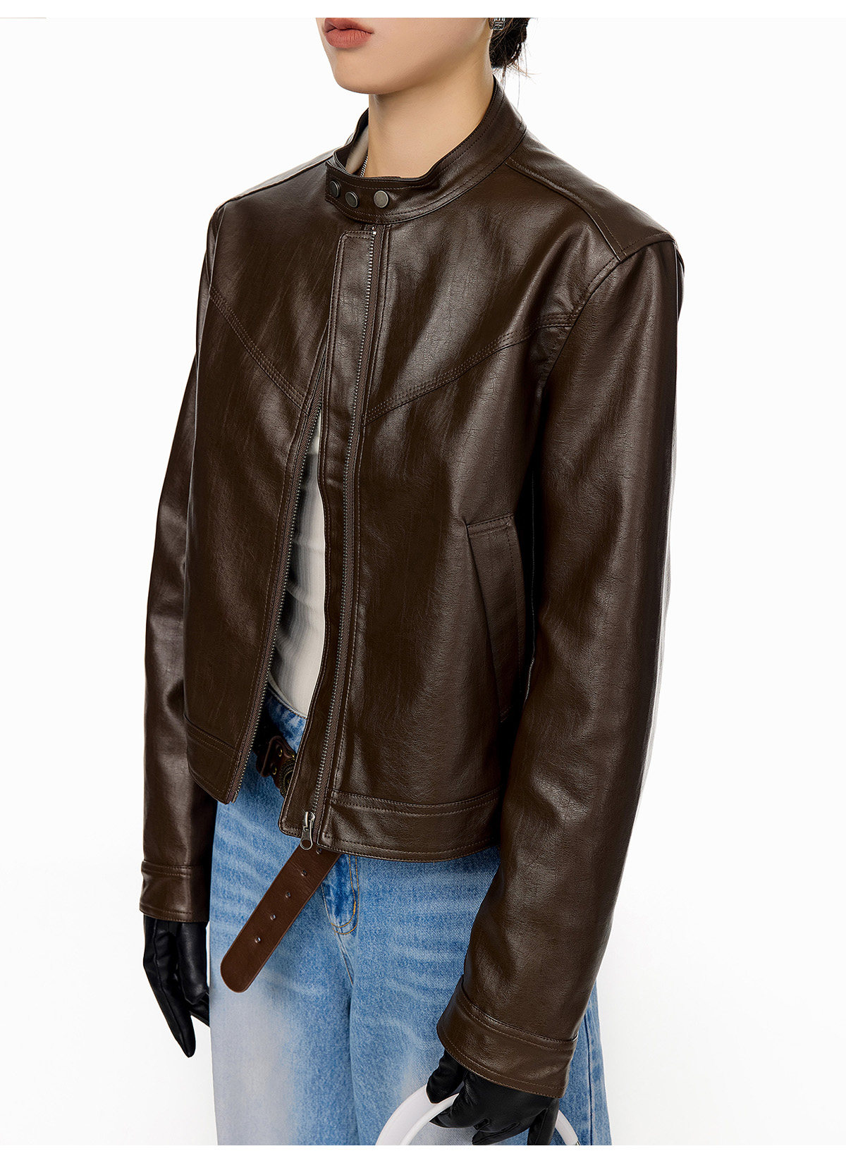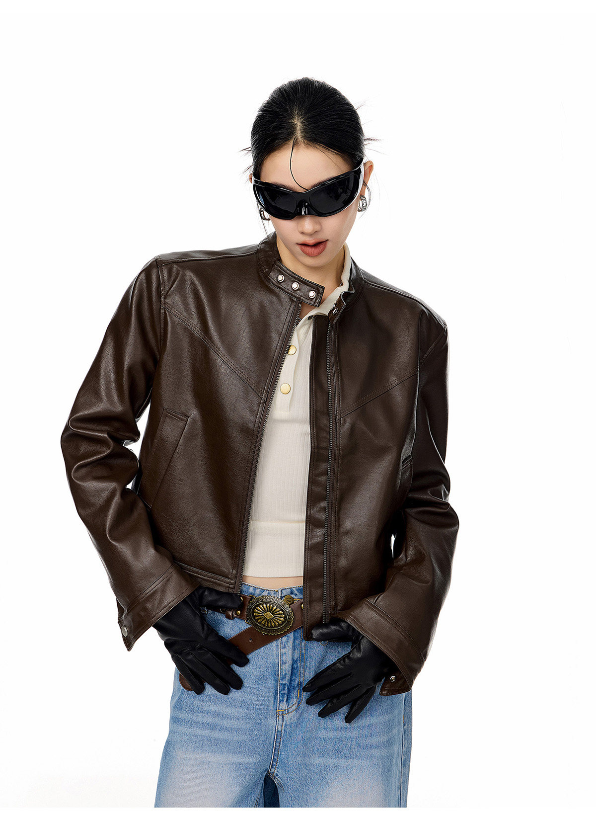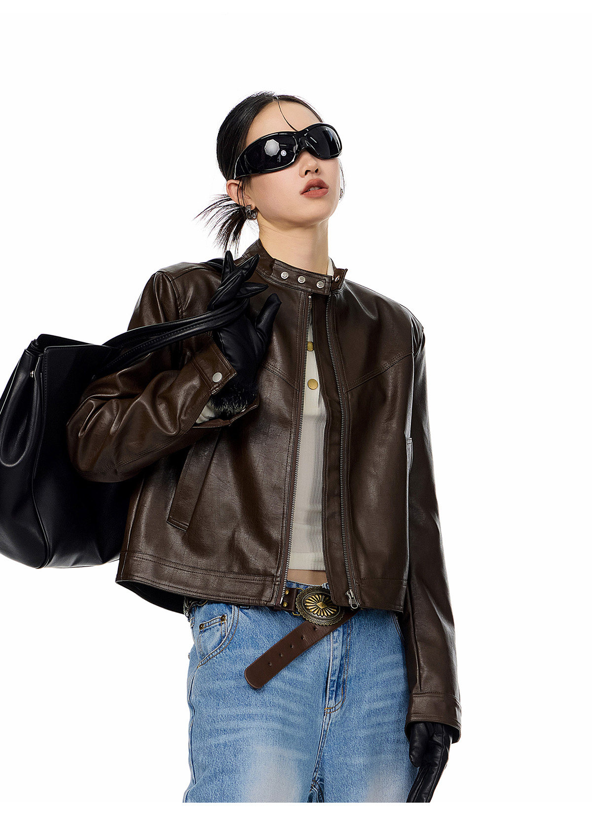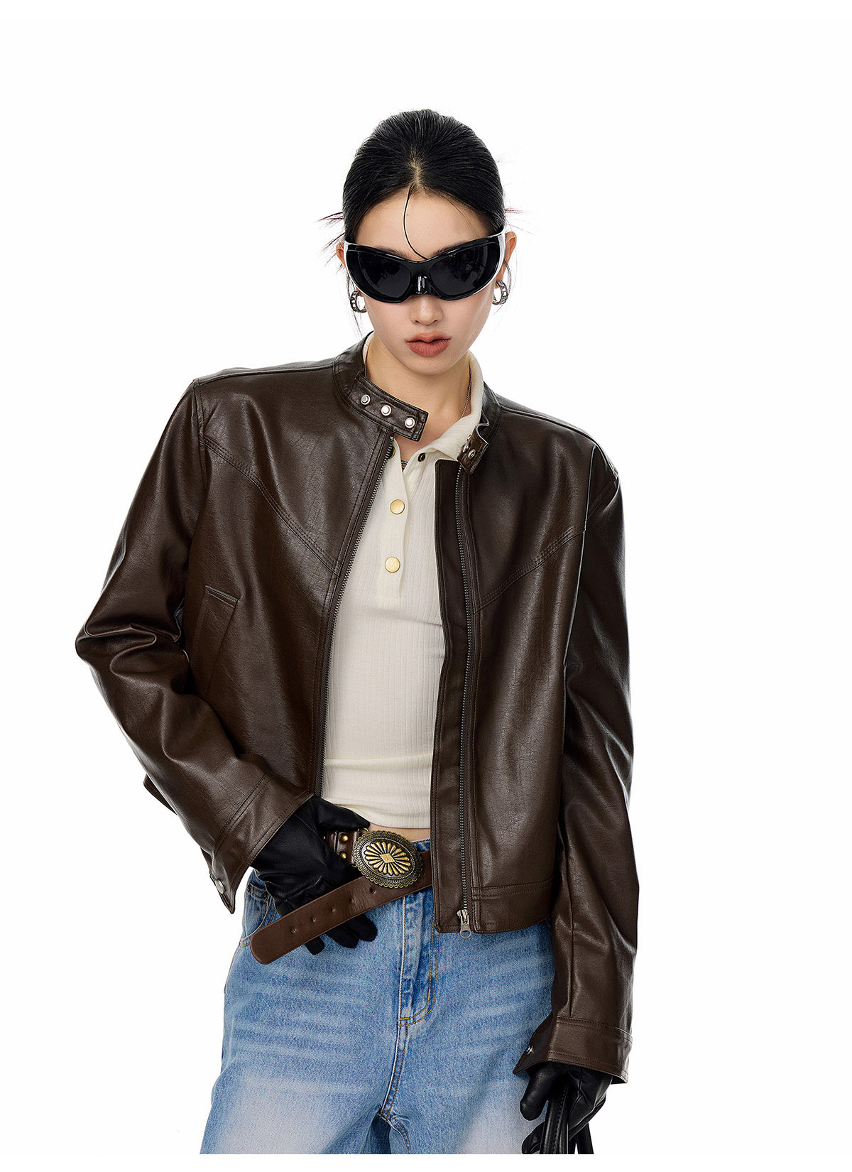 Ich Mode American Retro Brown Stand-Up Collar Leather Jacket for Women, New Spring Motorcycle Leather Jacket Short Top