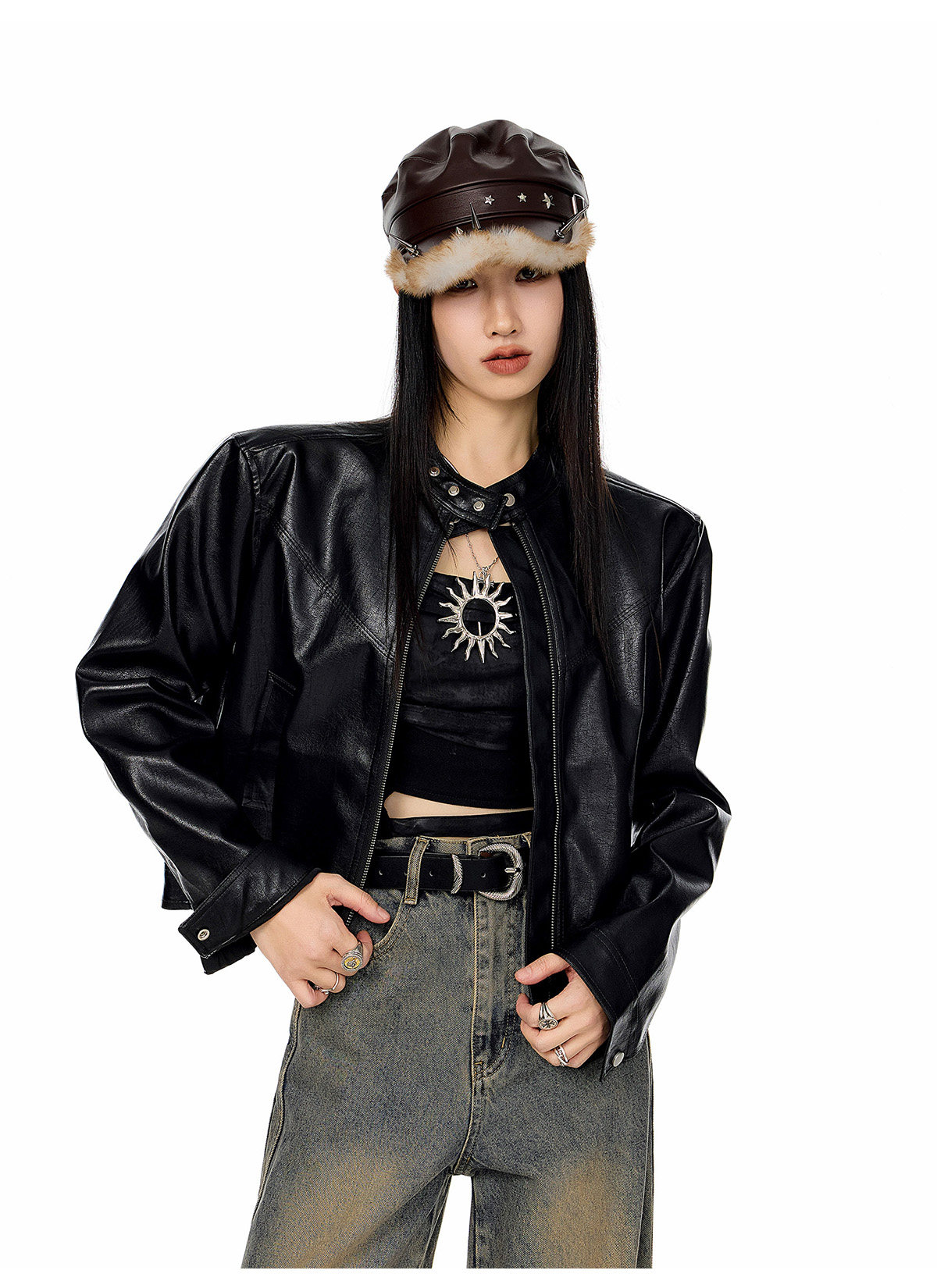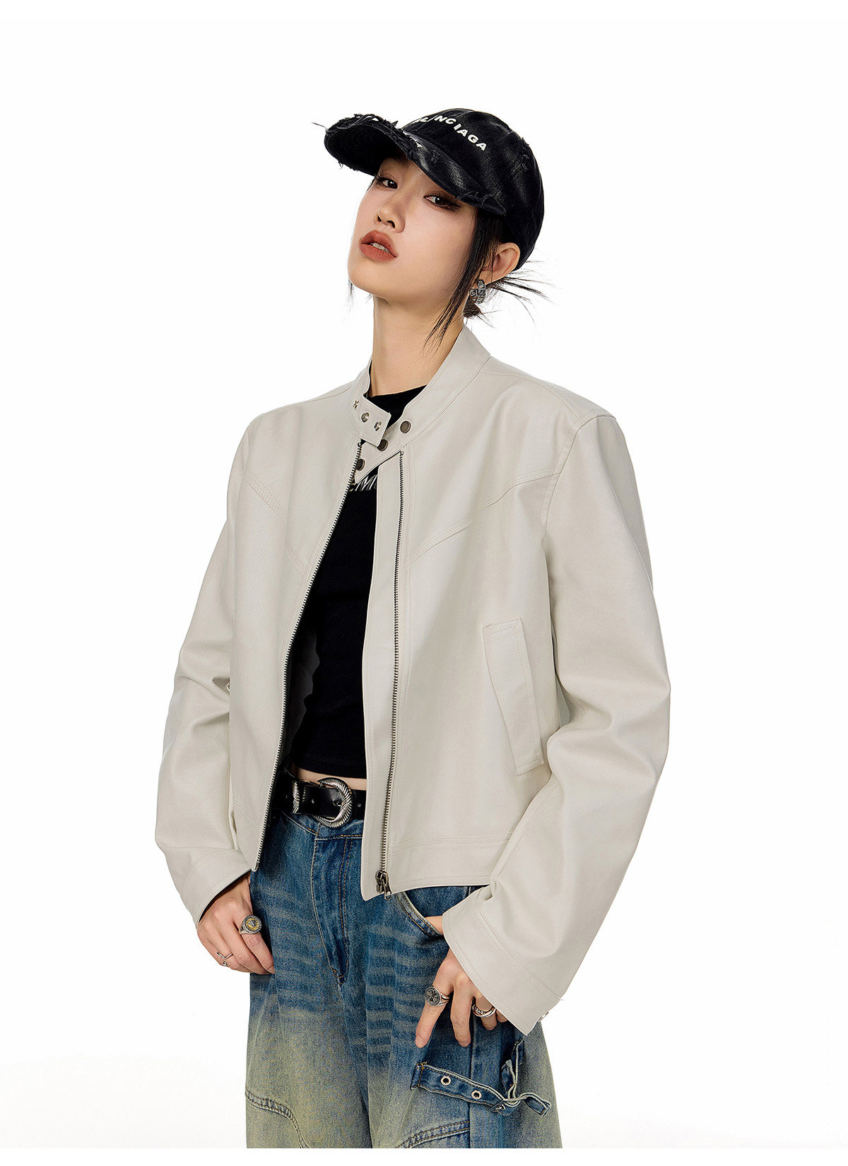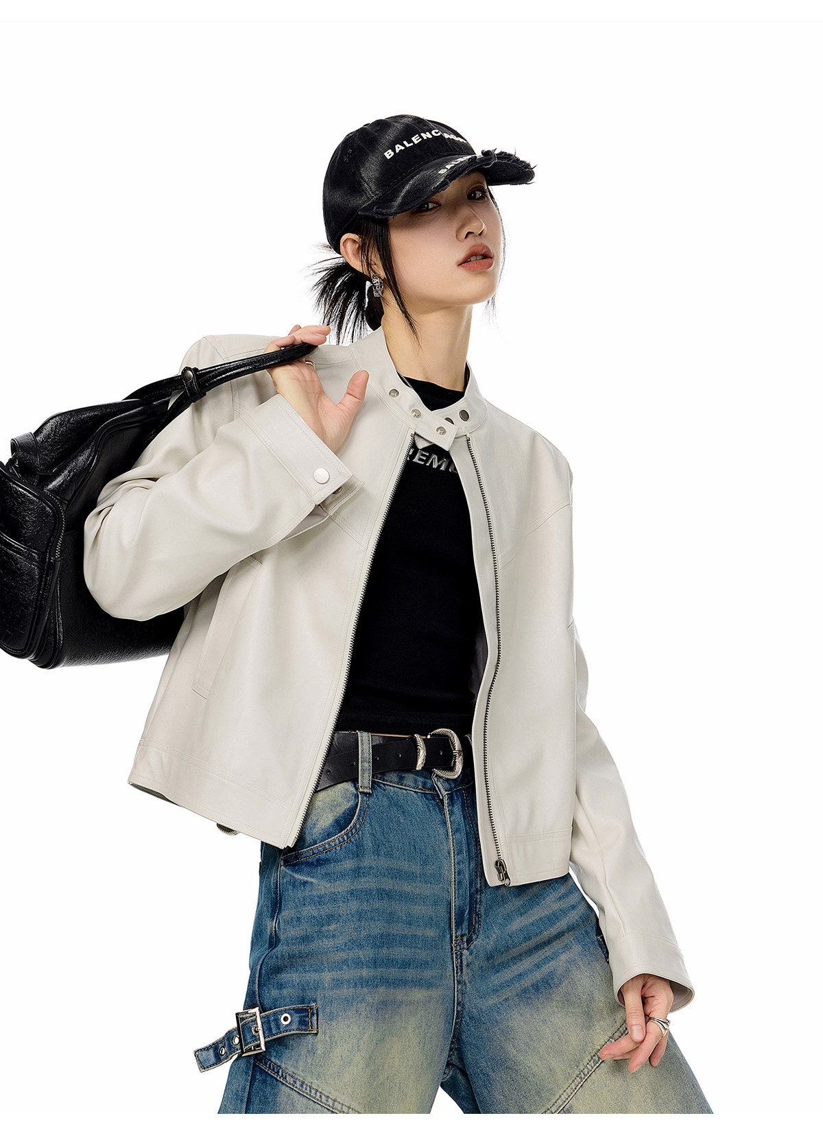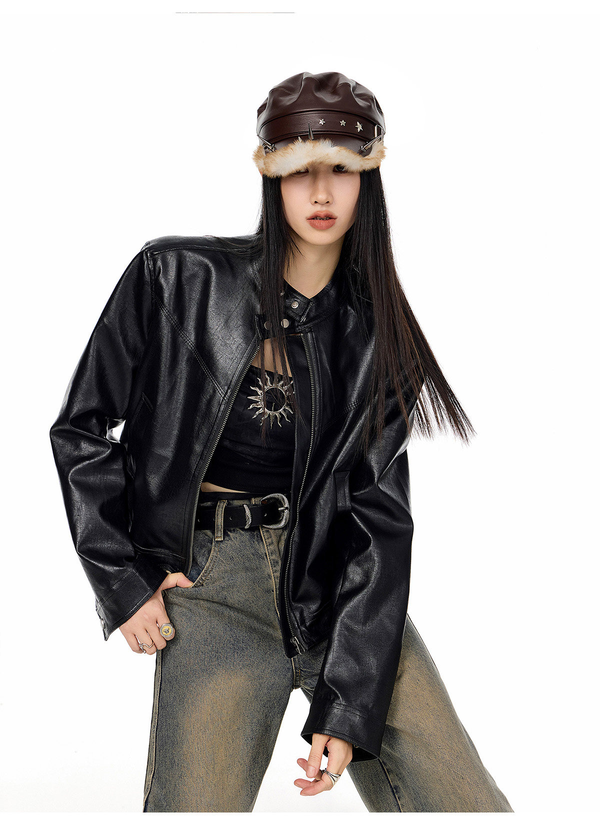 Ich Mode American Retro Brown Stand-Up Collar Leather Jacket for Women, New Spring Motorcycle Leather Jacket Short Top