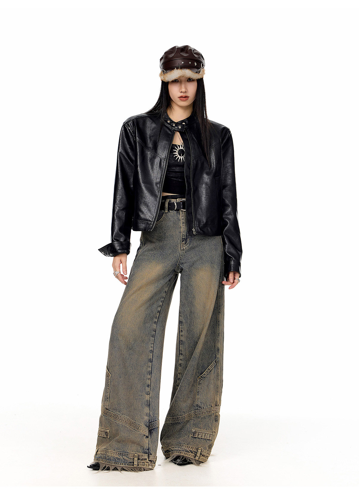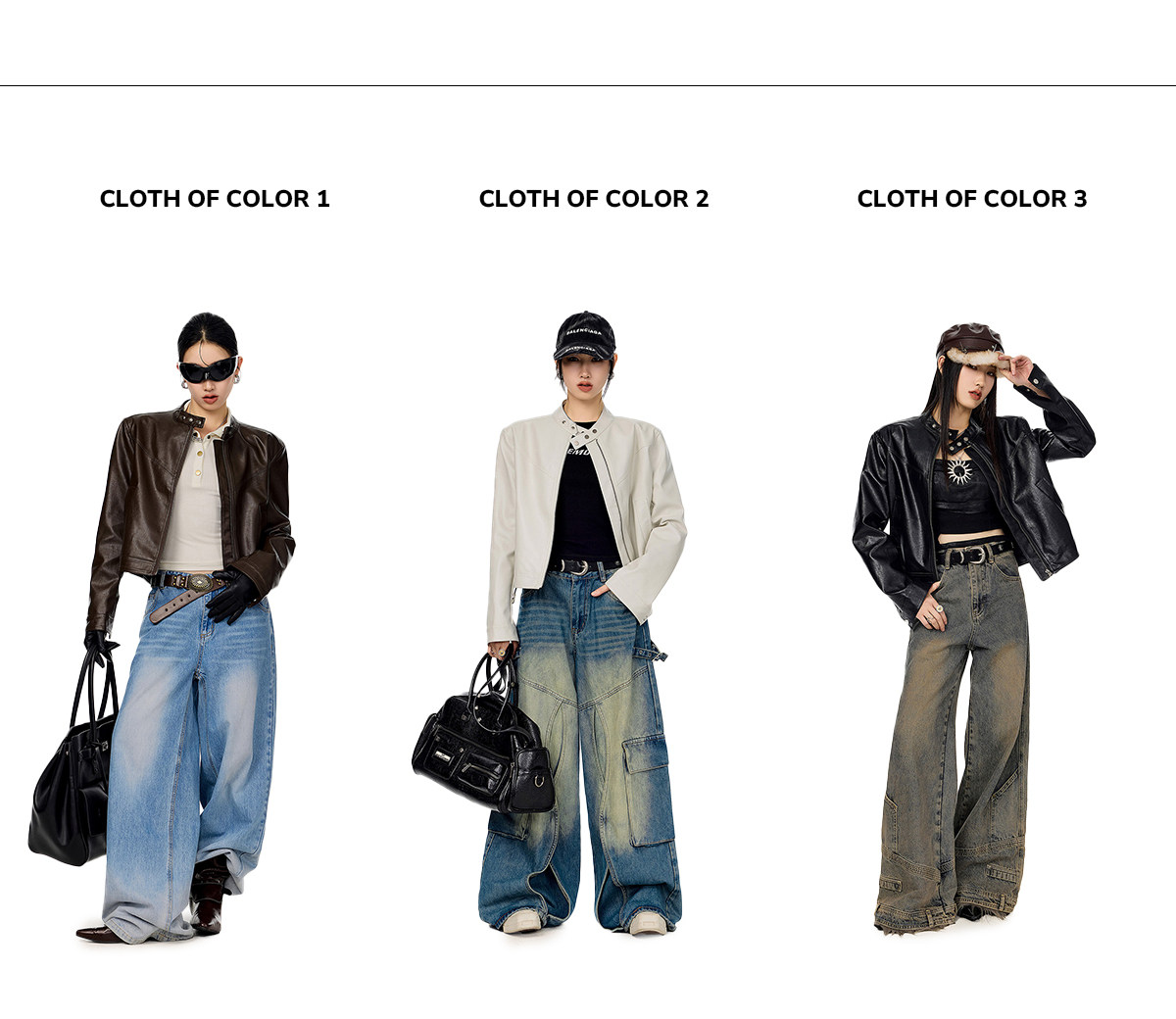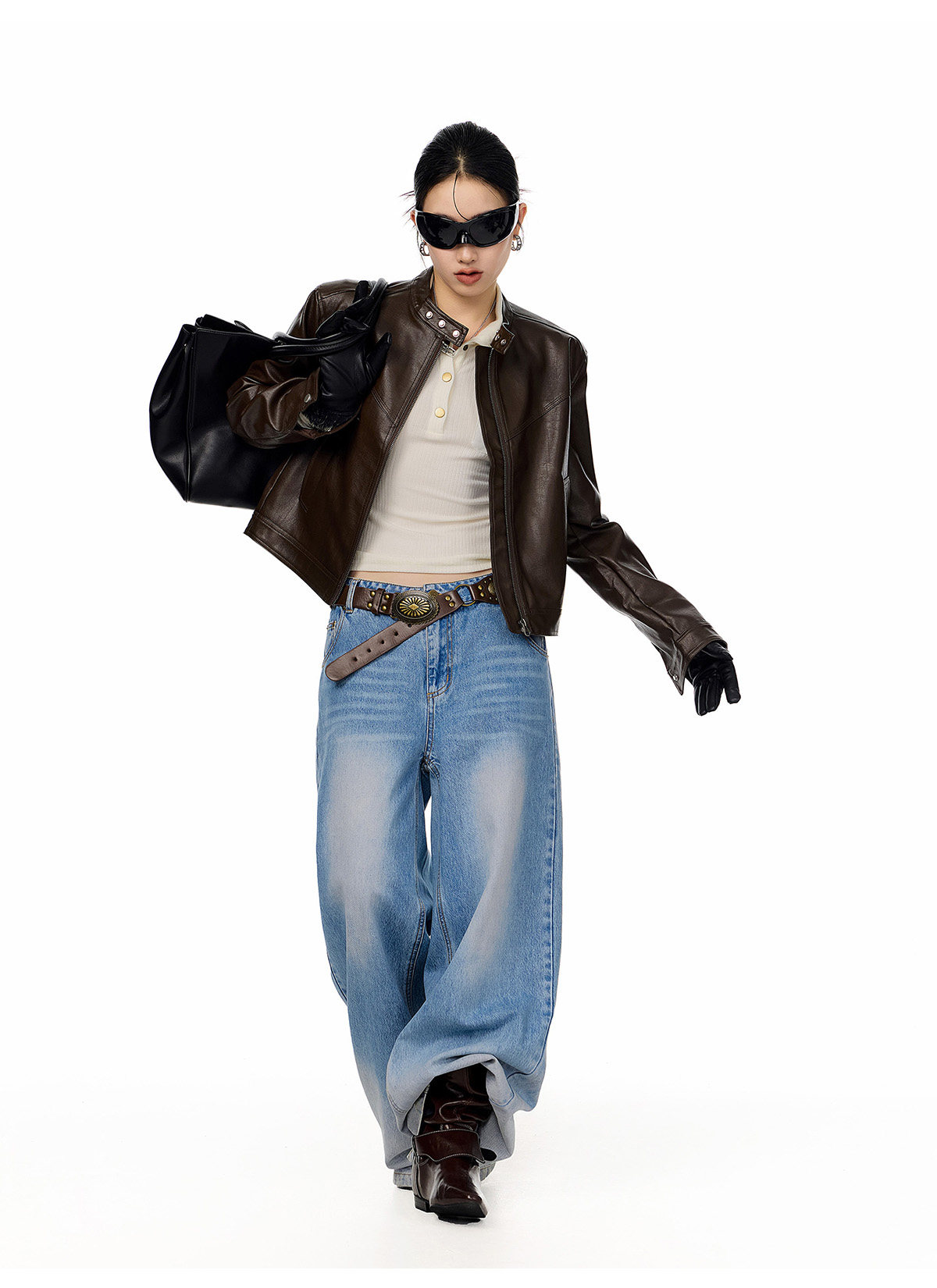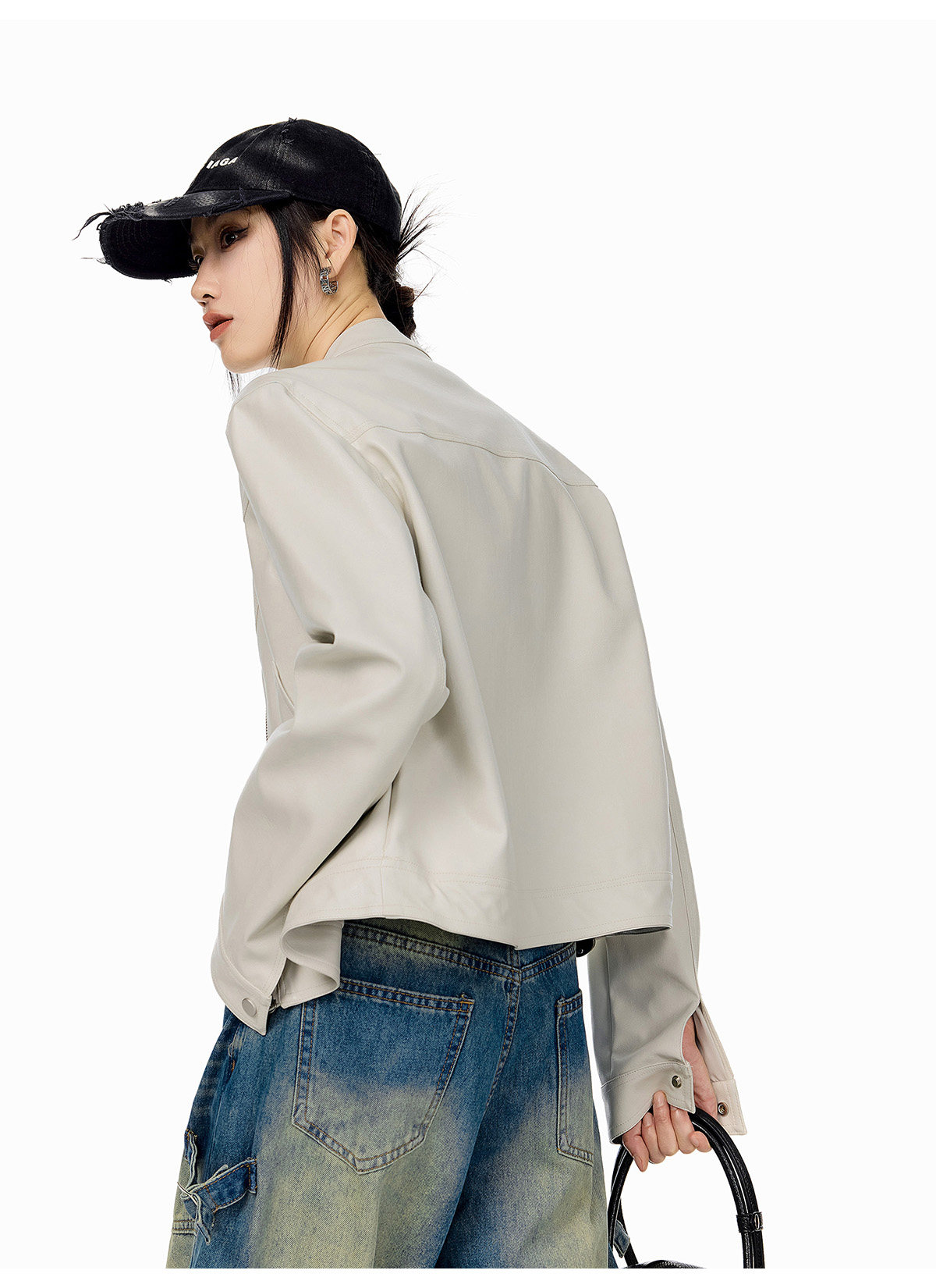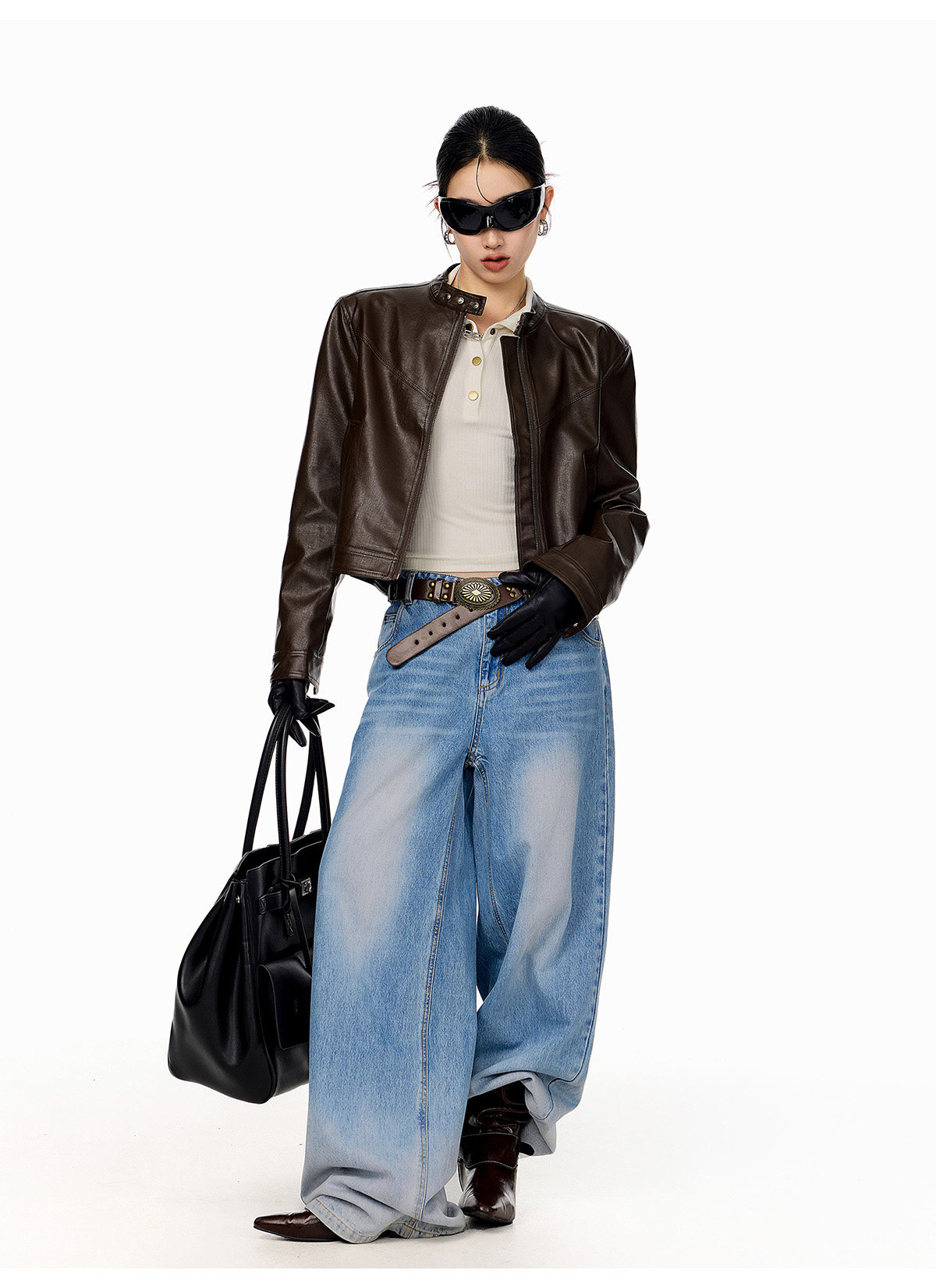 Ich Mode American Retro Brown Stand-Up Collar Leather Jacket for Women, New Spring Motorcycle Leather Jacket Short Top