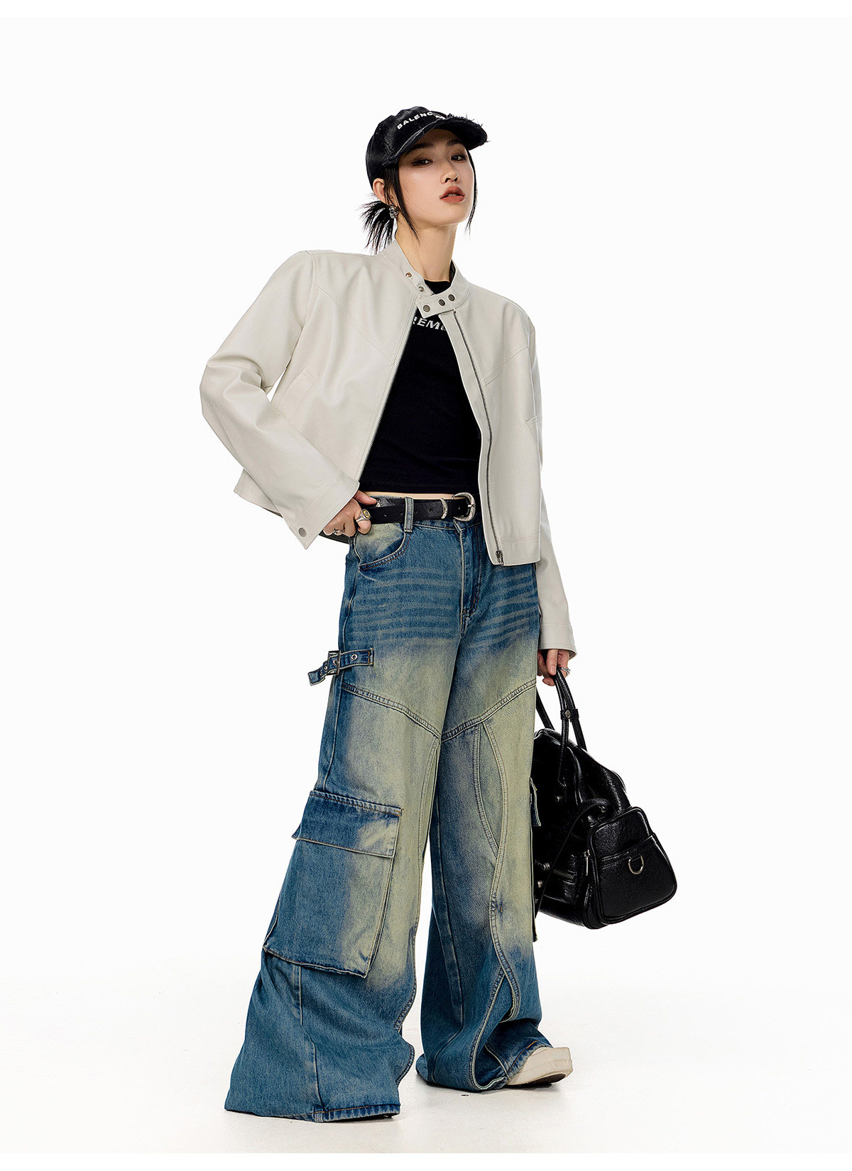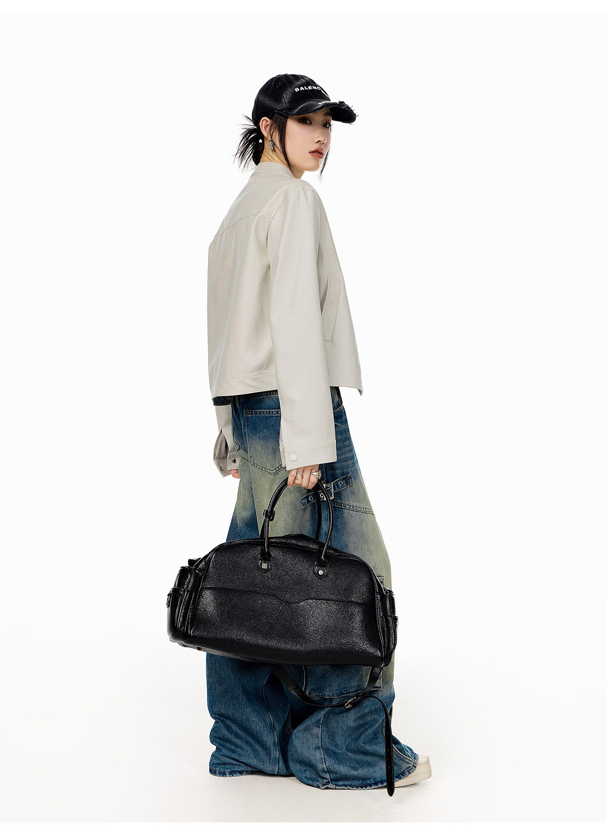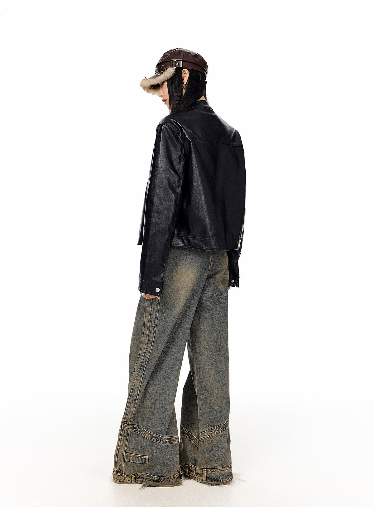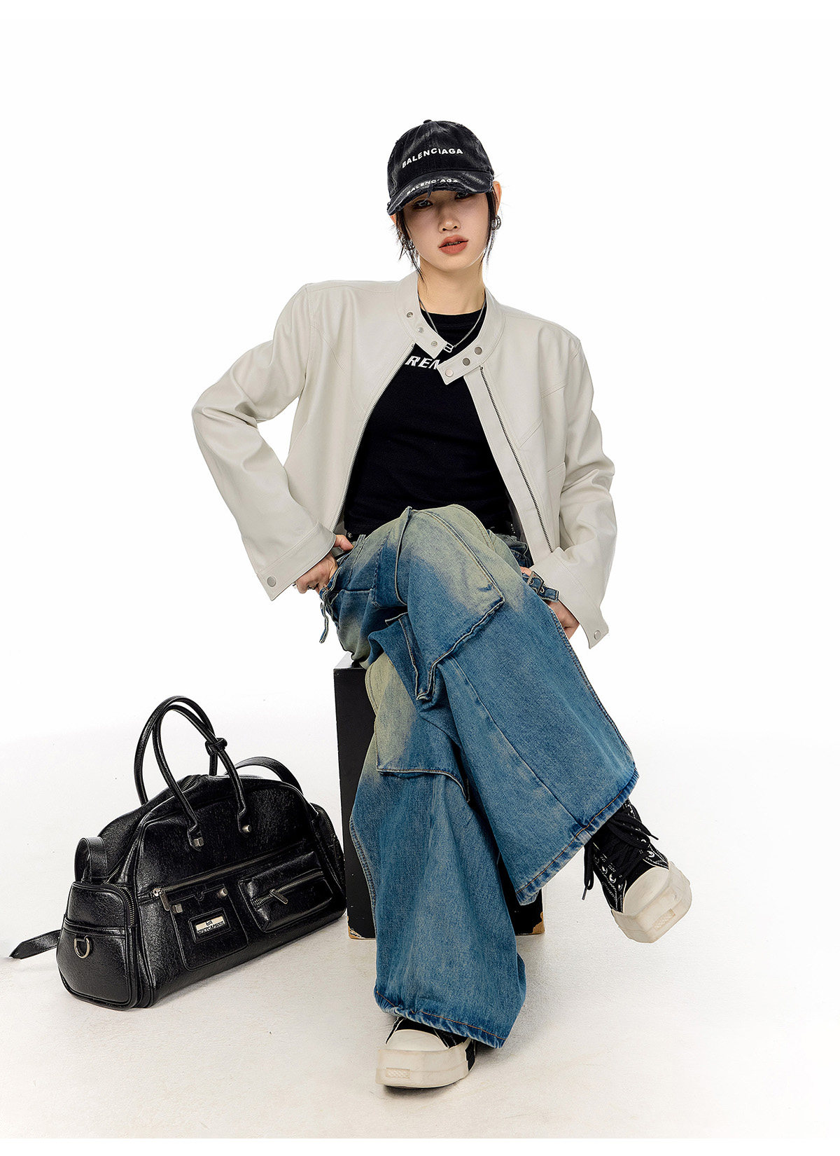 Ich Mode American Retro Brown Stand-Up Collar Leather Jacket for Women, New Spring Motorcycle Leather Jacket Short Top