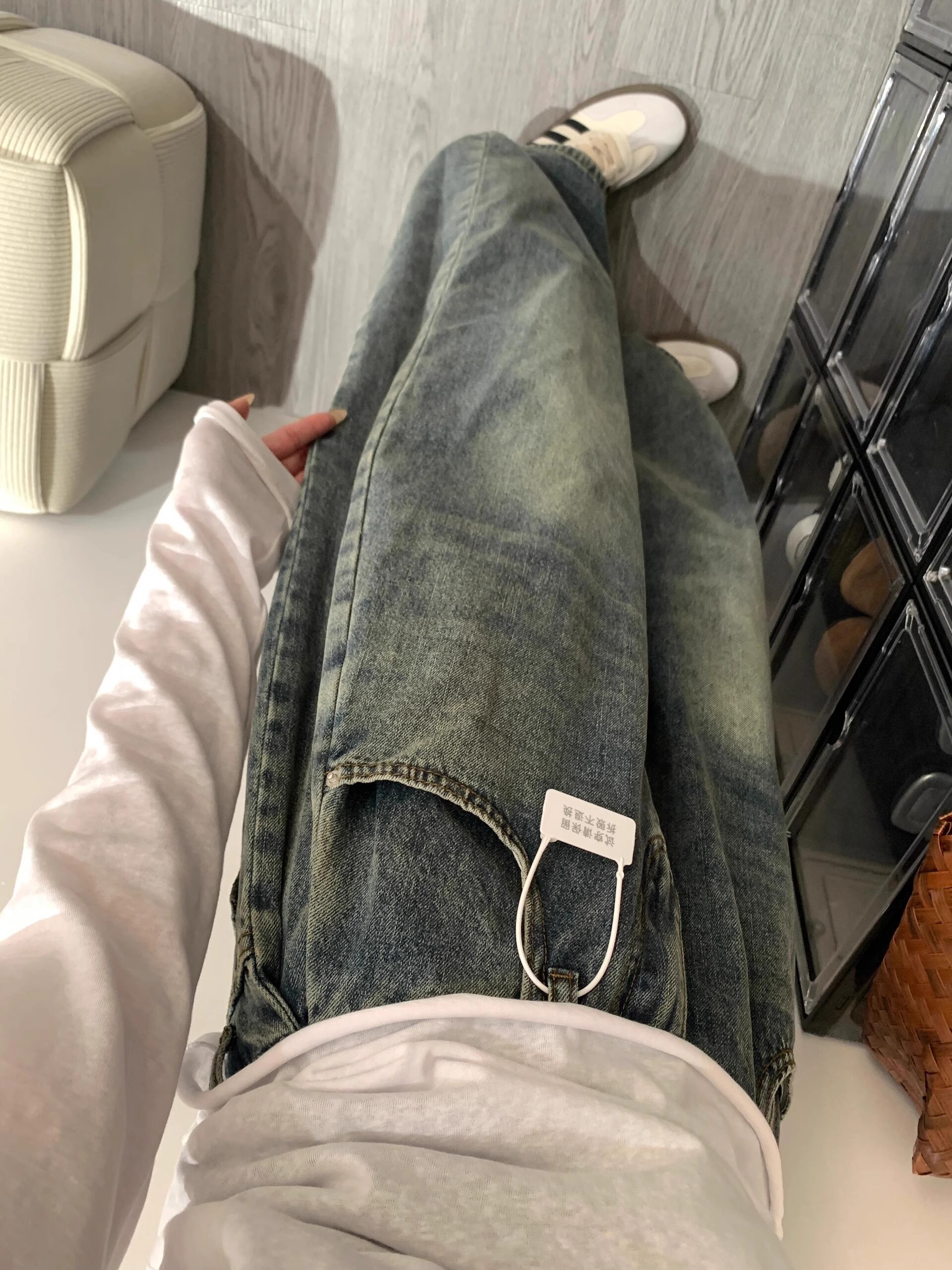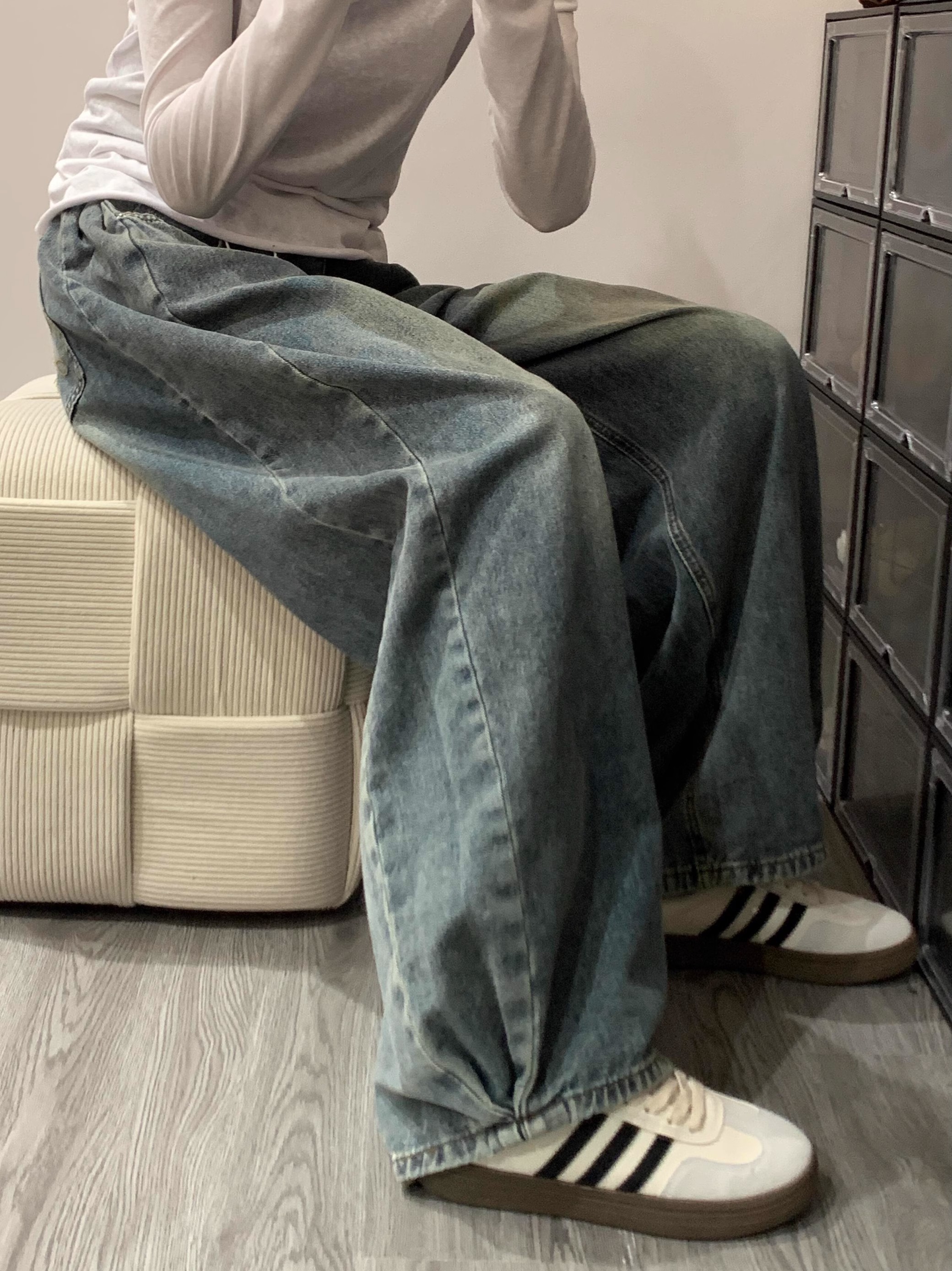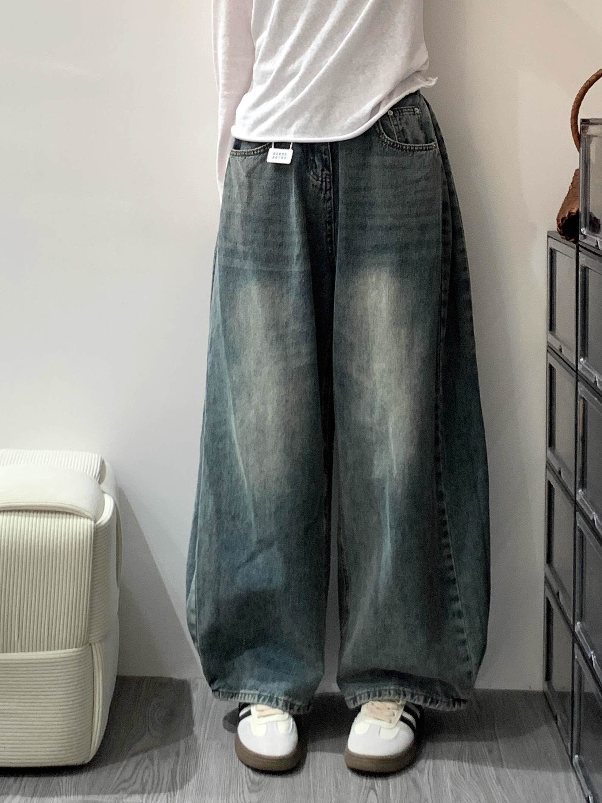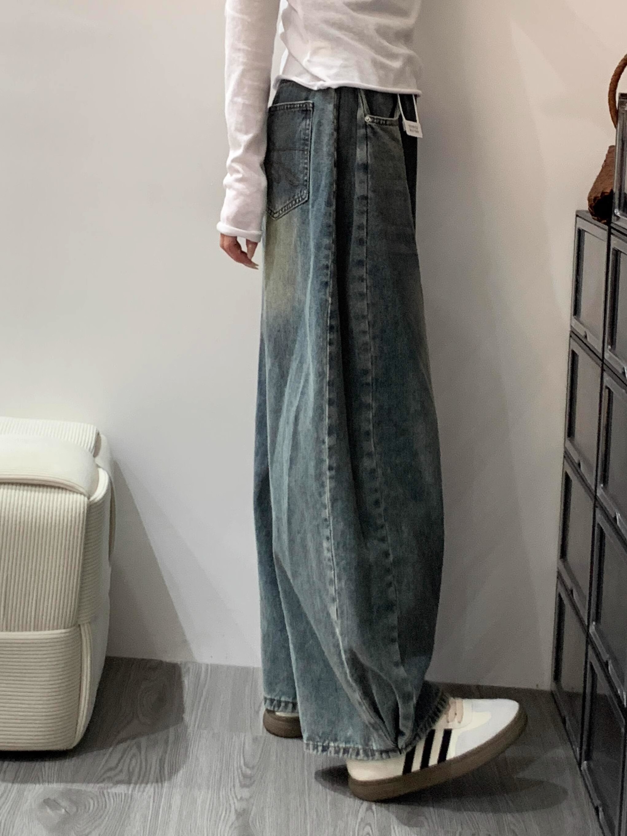 Vintage Washed Distressed Scimitar Jeans for Women, Autumn Plus Size, High-Waisted, Loose, Slimming, Wide-Leg Pants