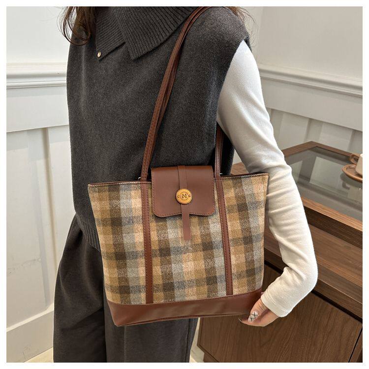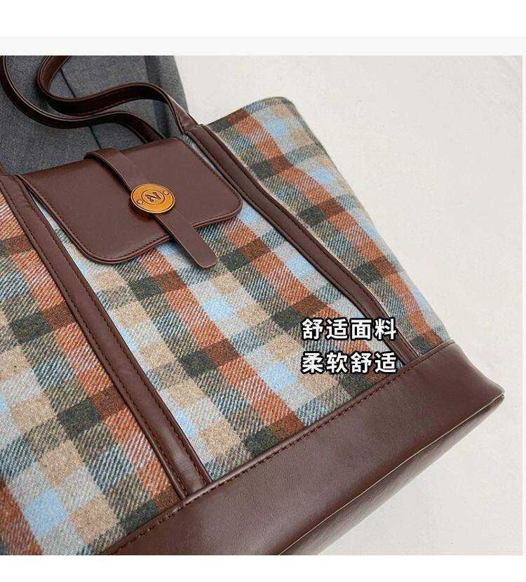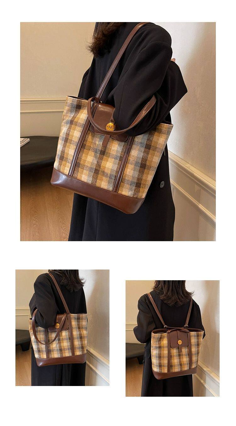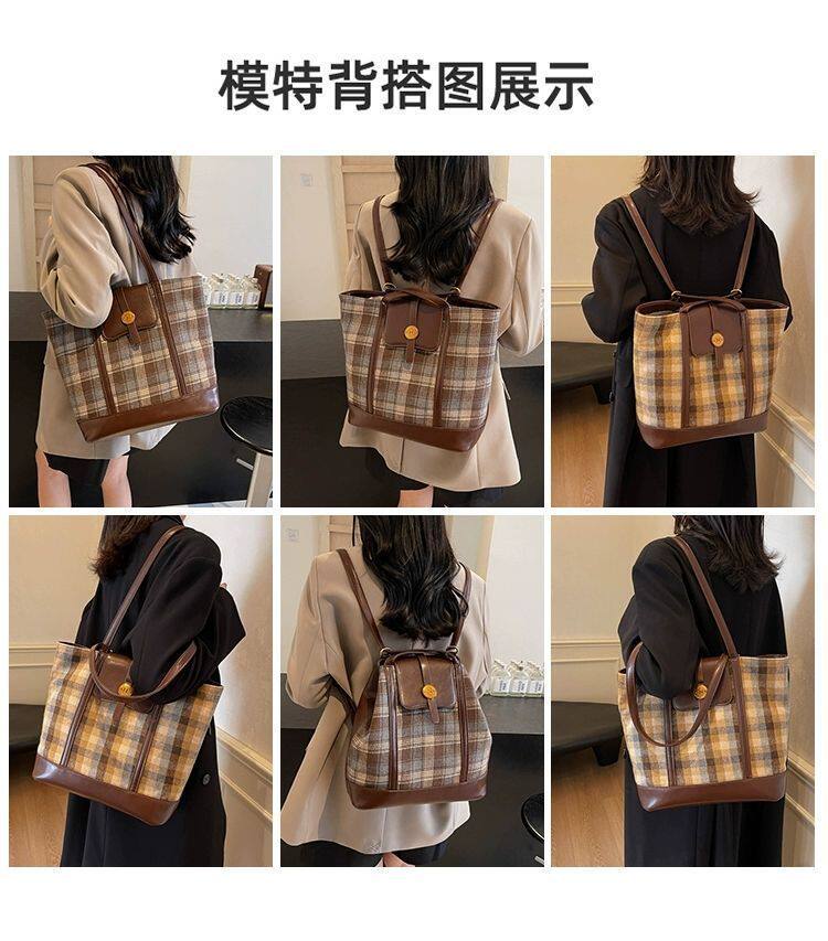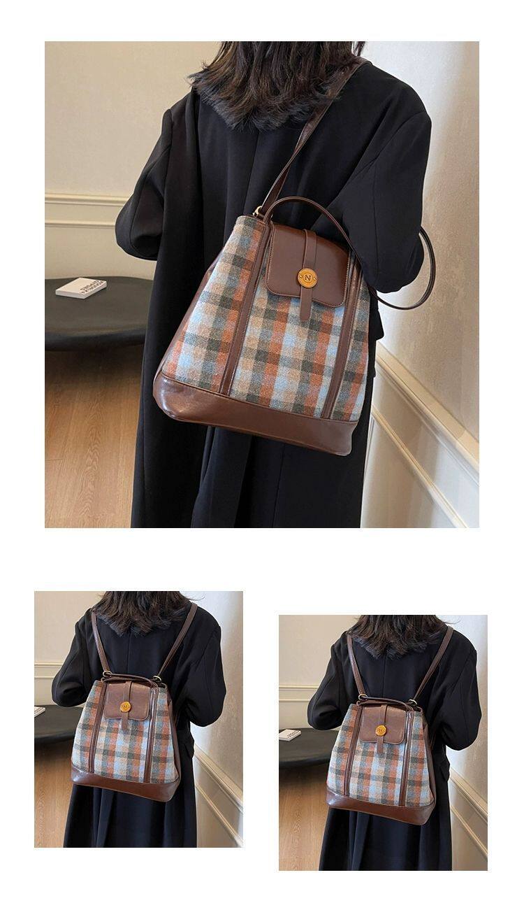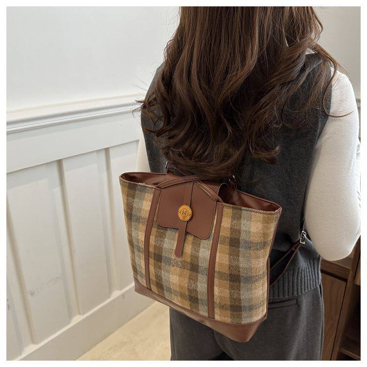 College Class Commute Backpack Woolen Plaid Large Capacity Bag Women's Autumn 2024 New Trendy Retro Tote Bag