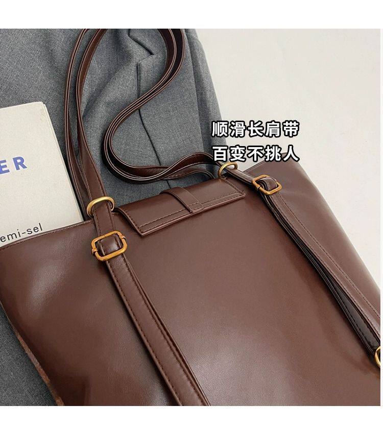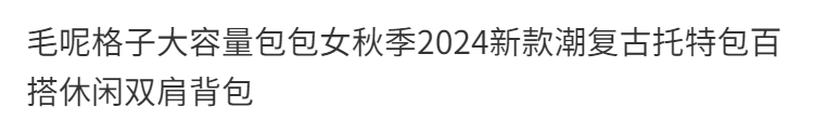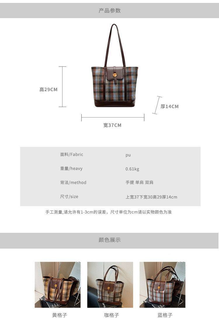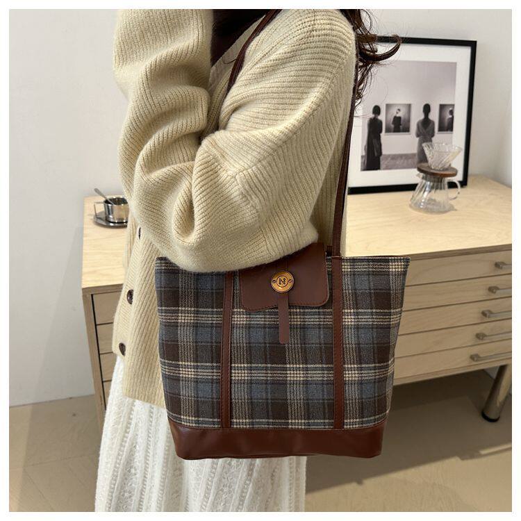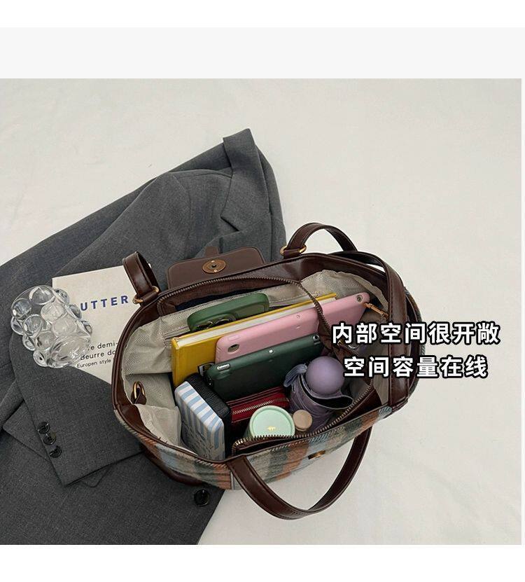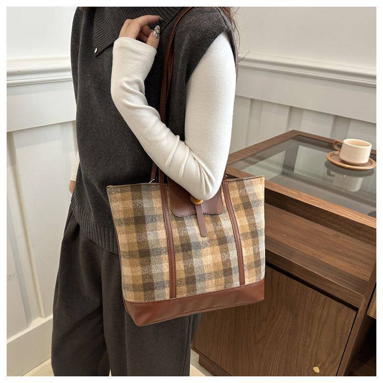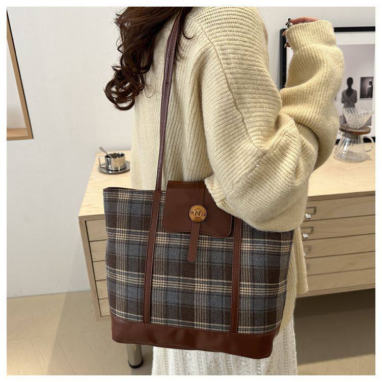 College Class Commute Backpack Woolen Plaid Large Capacity Bag Women's Autumn 2024 New Trendy Retro Tote Bag