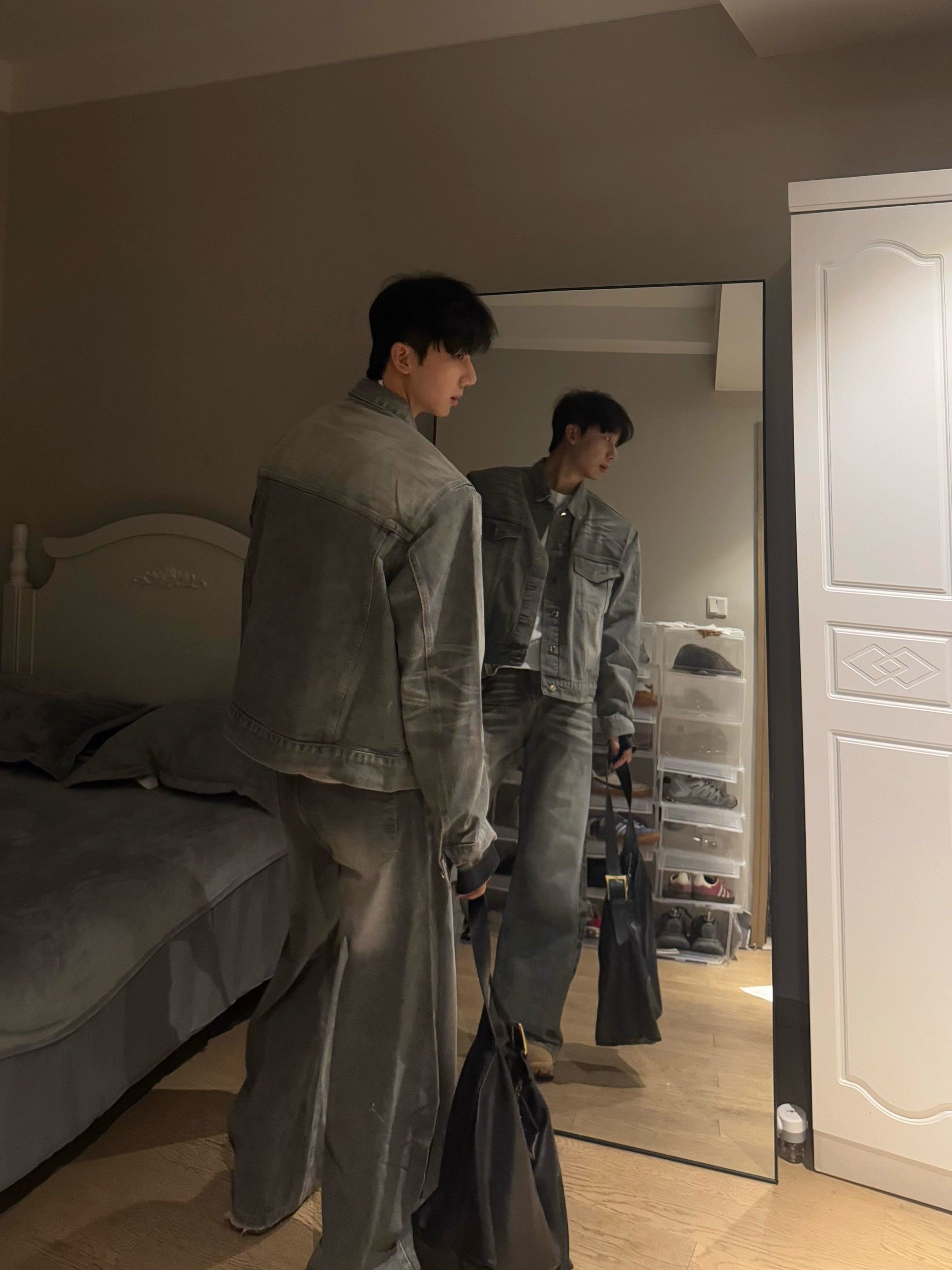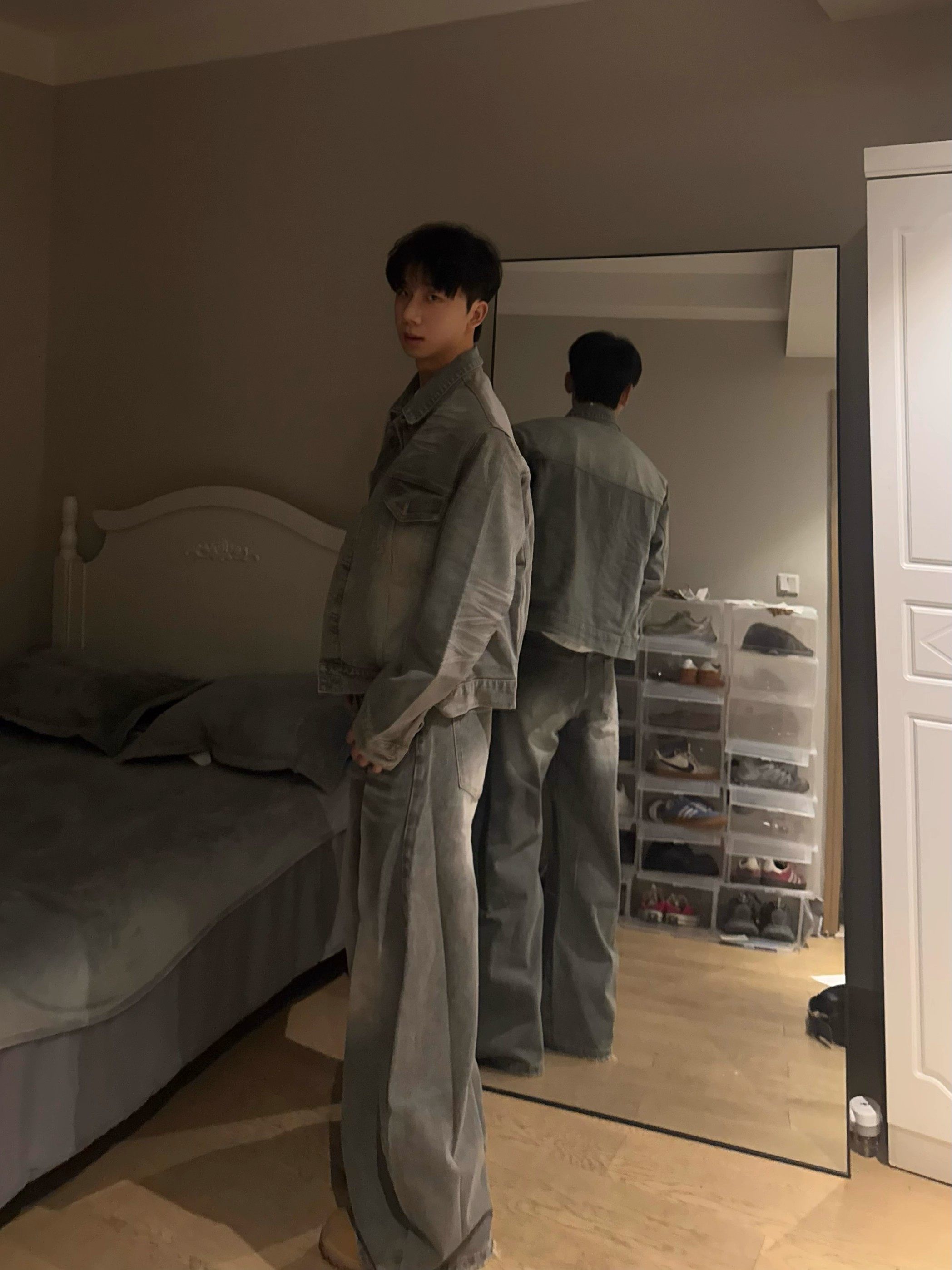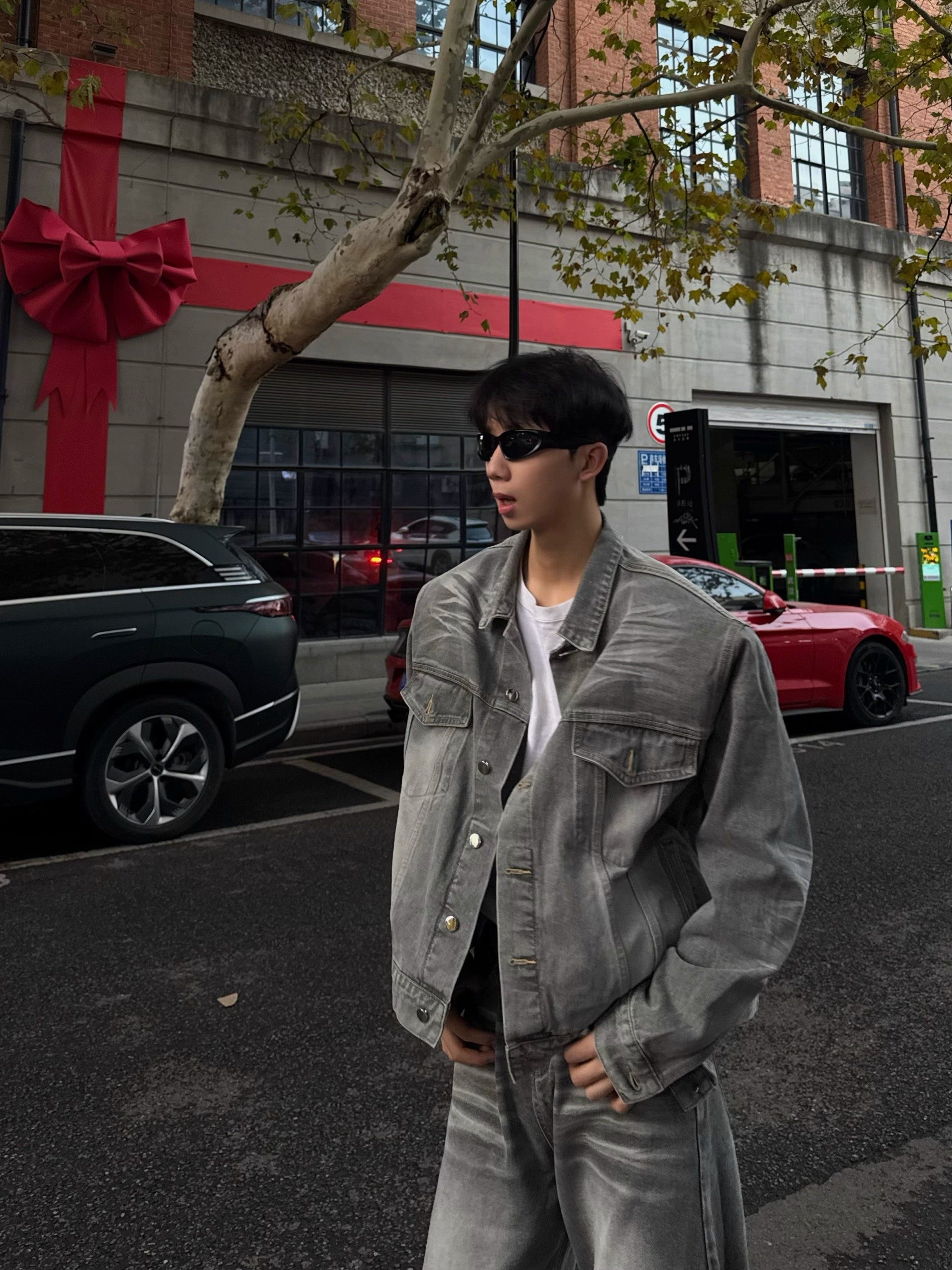 American Retro Washed Vintage Smoke Gray Denim Jacket for Men and Women, Loose Fit, Versatile Shoulder-Padded Jacket, Men's Two-Piece Set