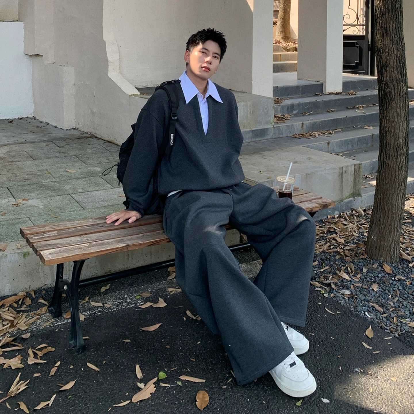 Autumn American-Style Trendy Brand High-End Fake Two-Piece Striped Collar Sweatshirt Men's Fashion Casual Long Pants Set