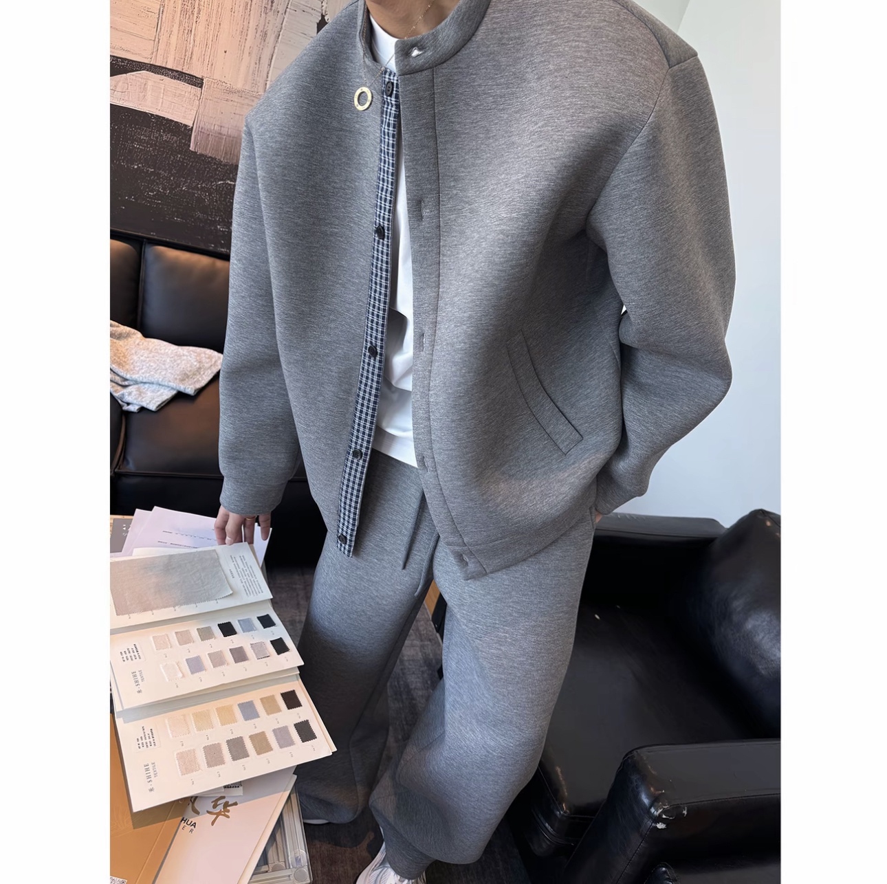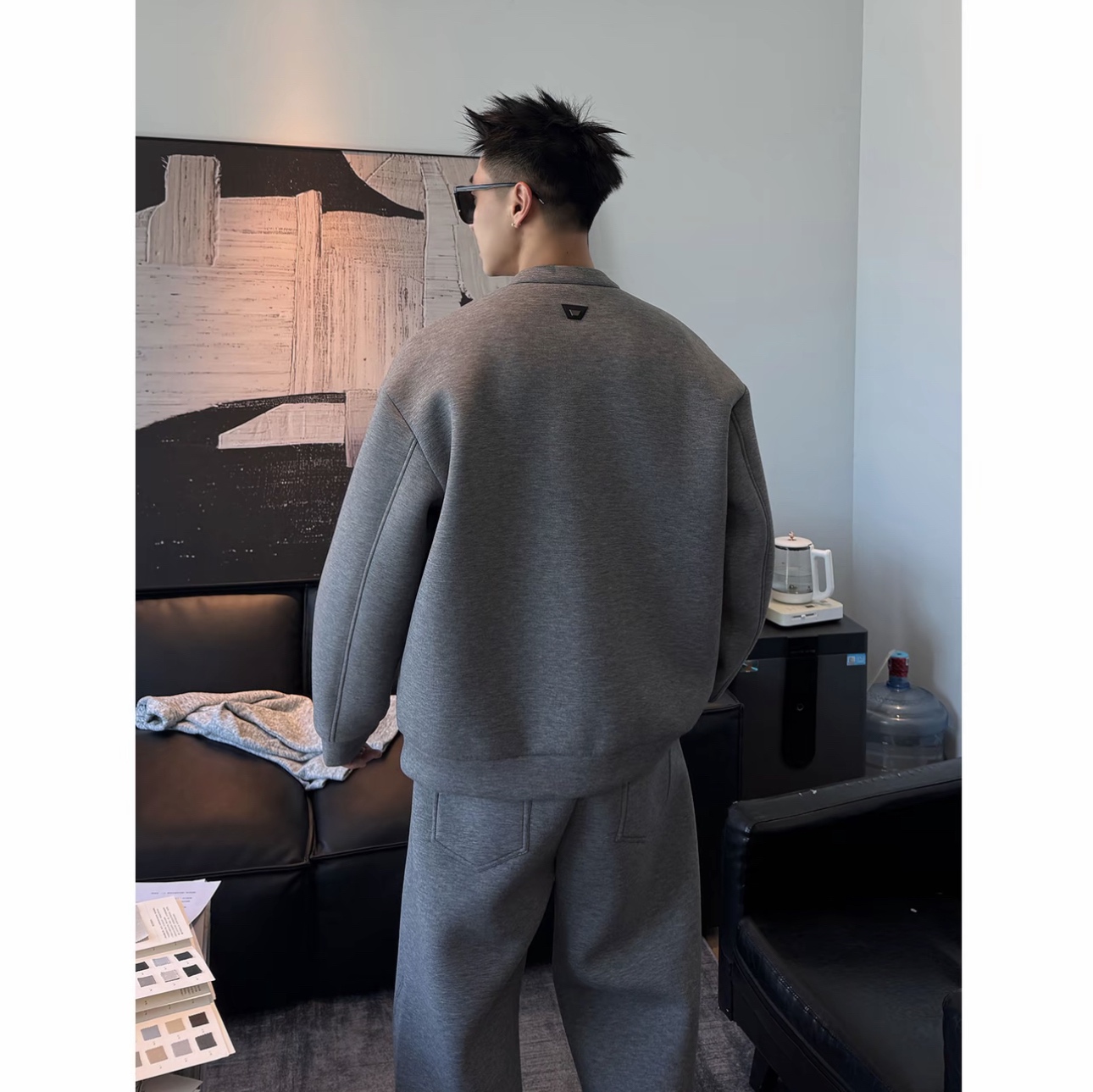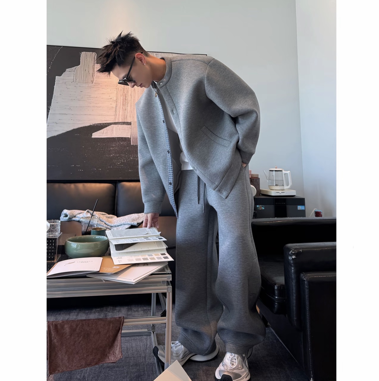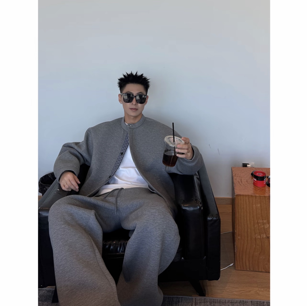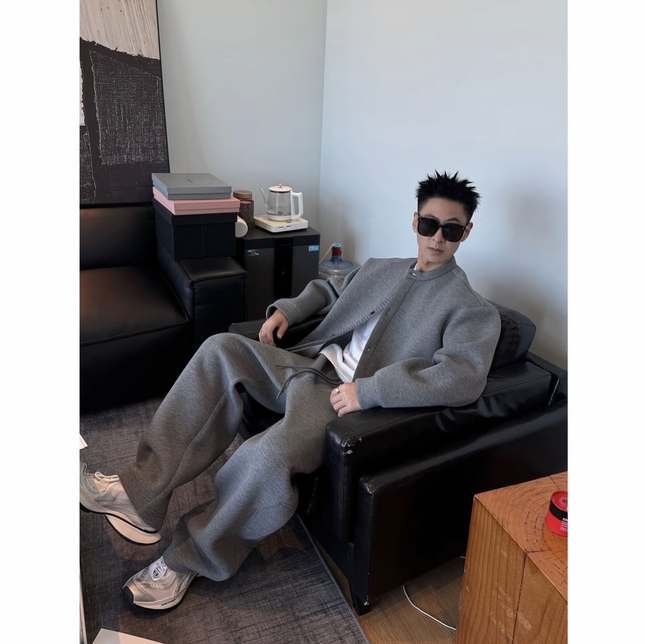Autumn Relaxed Style Outfit: Men's Gray Heavyweight Faux Two-Piece Cardigan Sweatshirt and Wide-Leg Sweatpants Set, Trendy