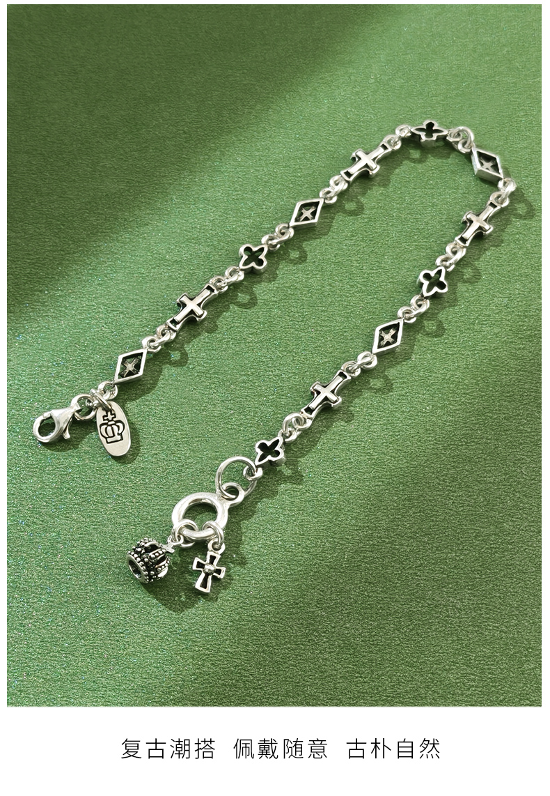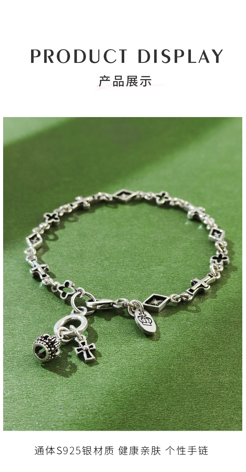 Shishangmei Awakening 925 Silver Vintage Cross Bracelet Crown Niche Unisex Trendy Jewelry Gift for Men and Women