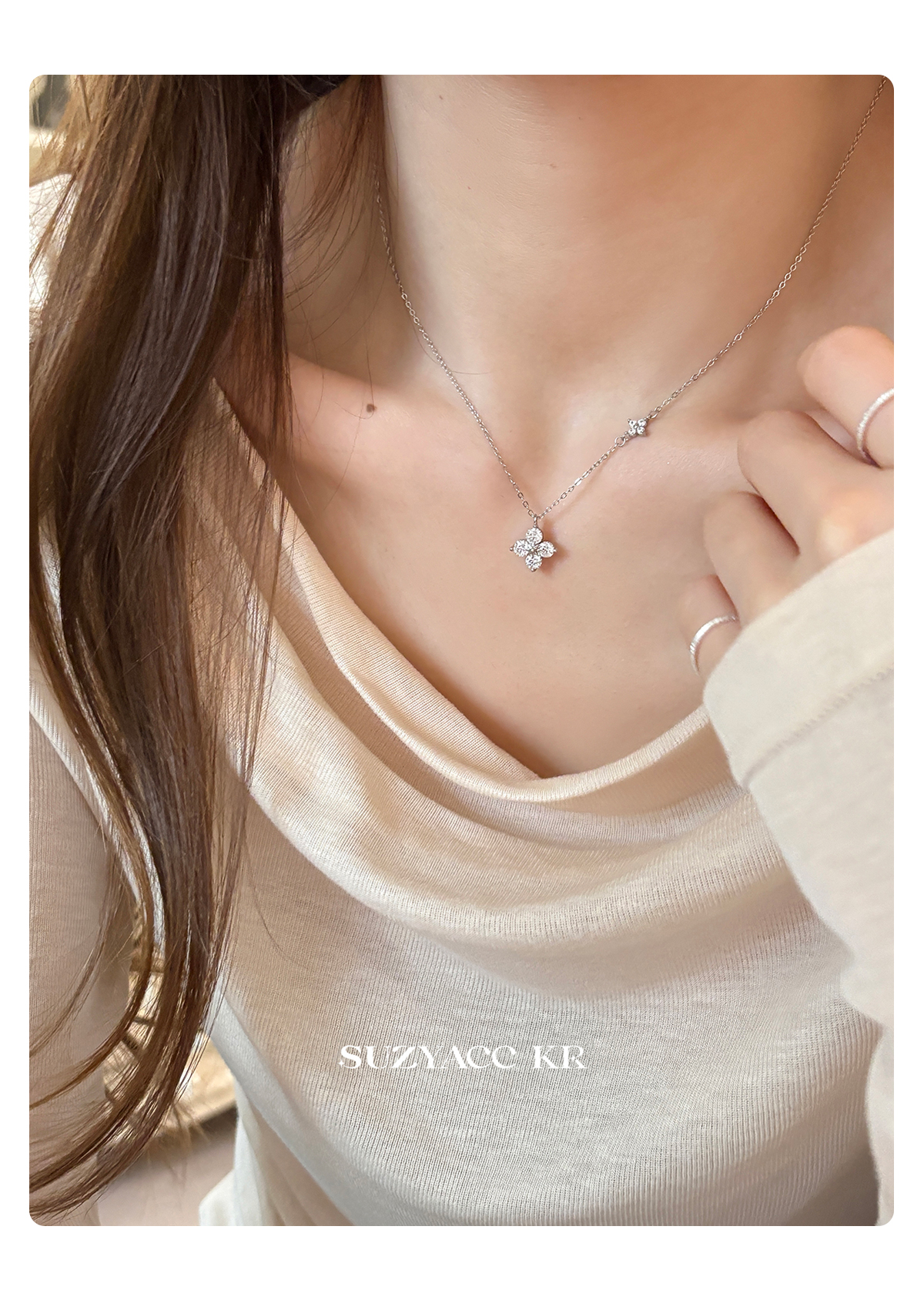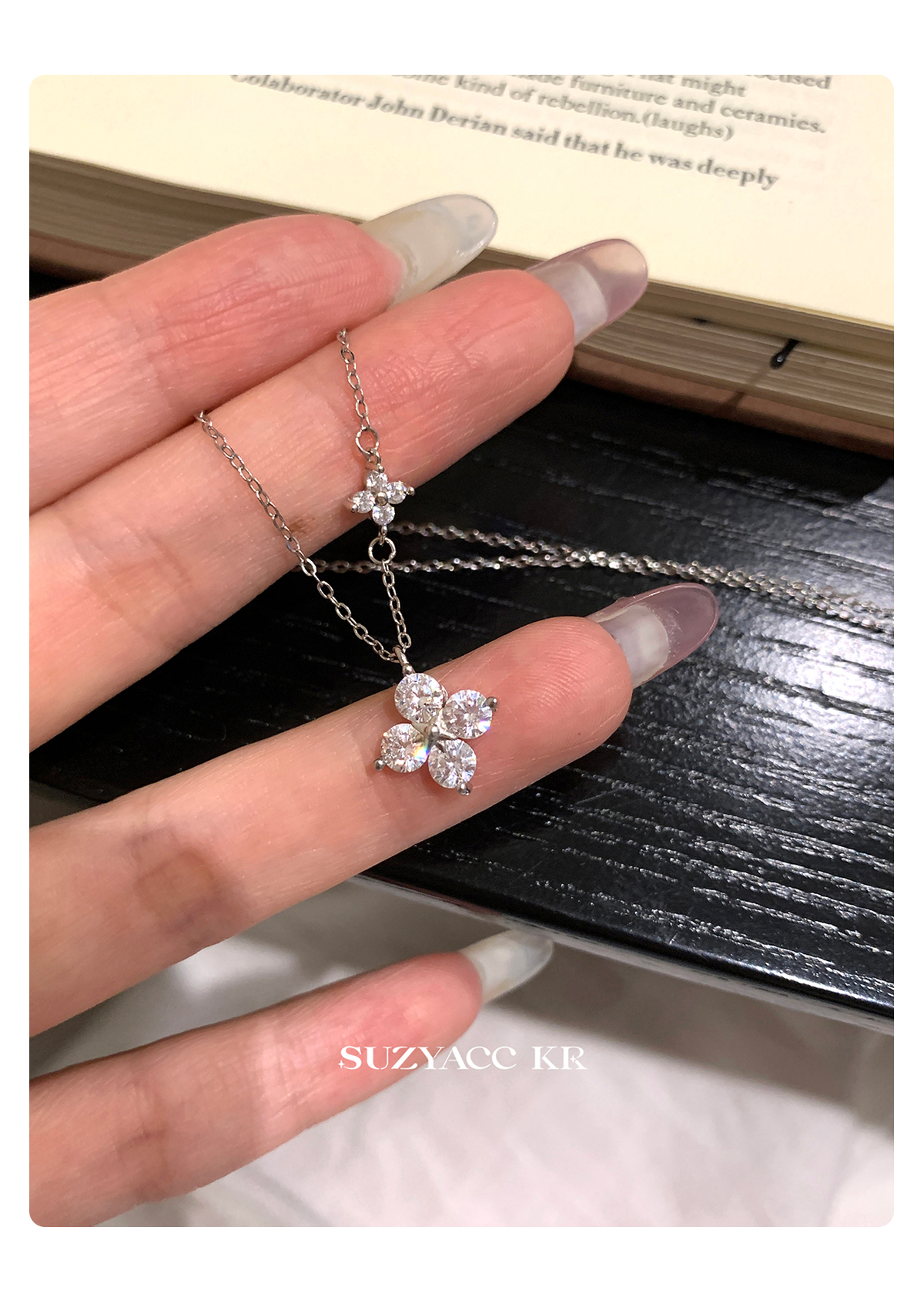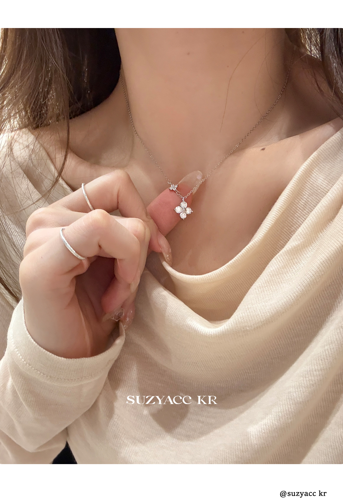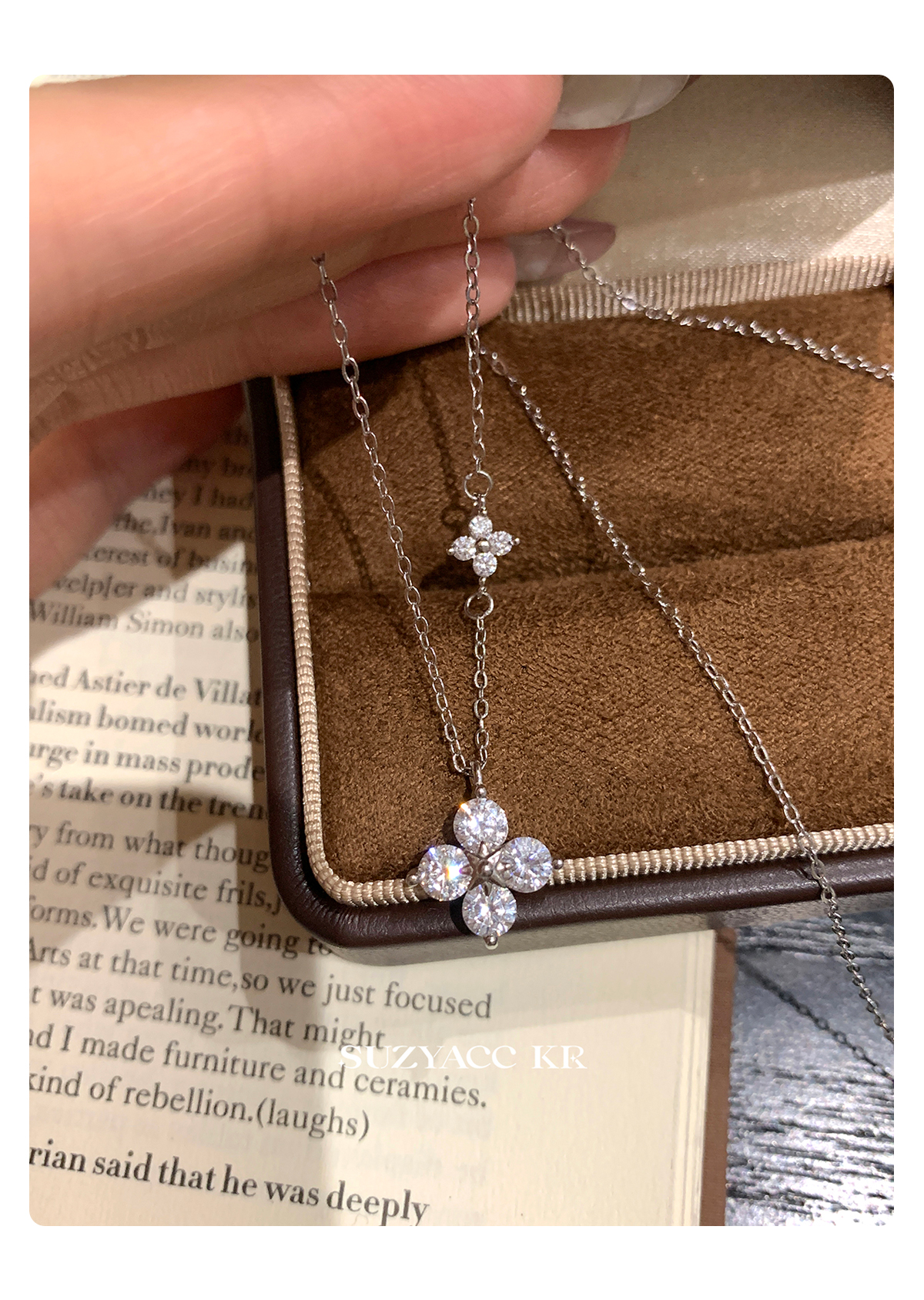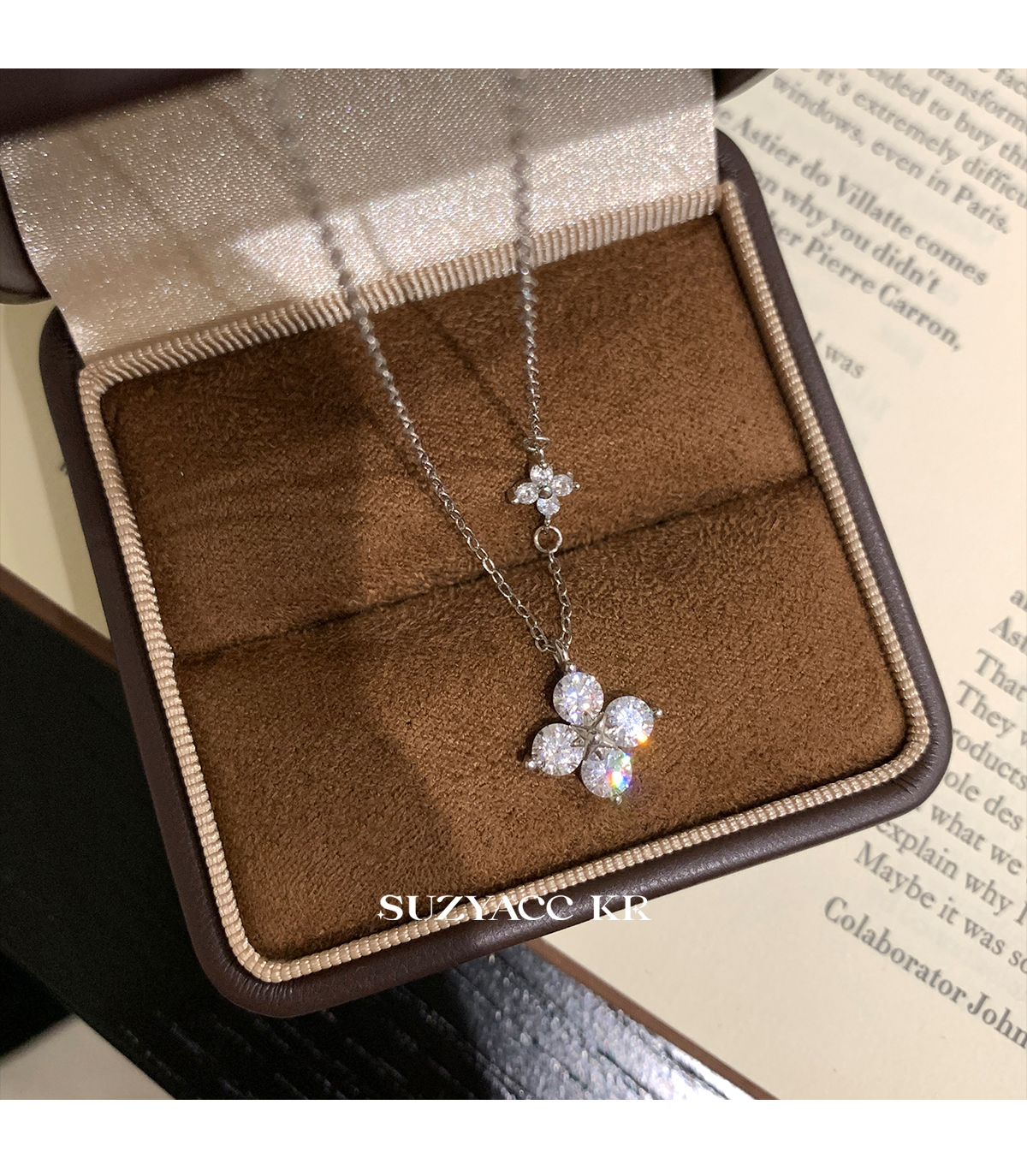Suzyacc Kr 999 Pure Silver Four-Leaf Clover Synthetic Zircon Necklace Light Luxury Elegant High-End Sweater Chain Clavicle Chain