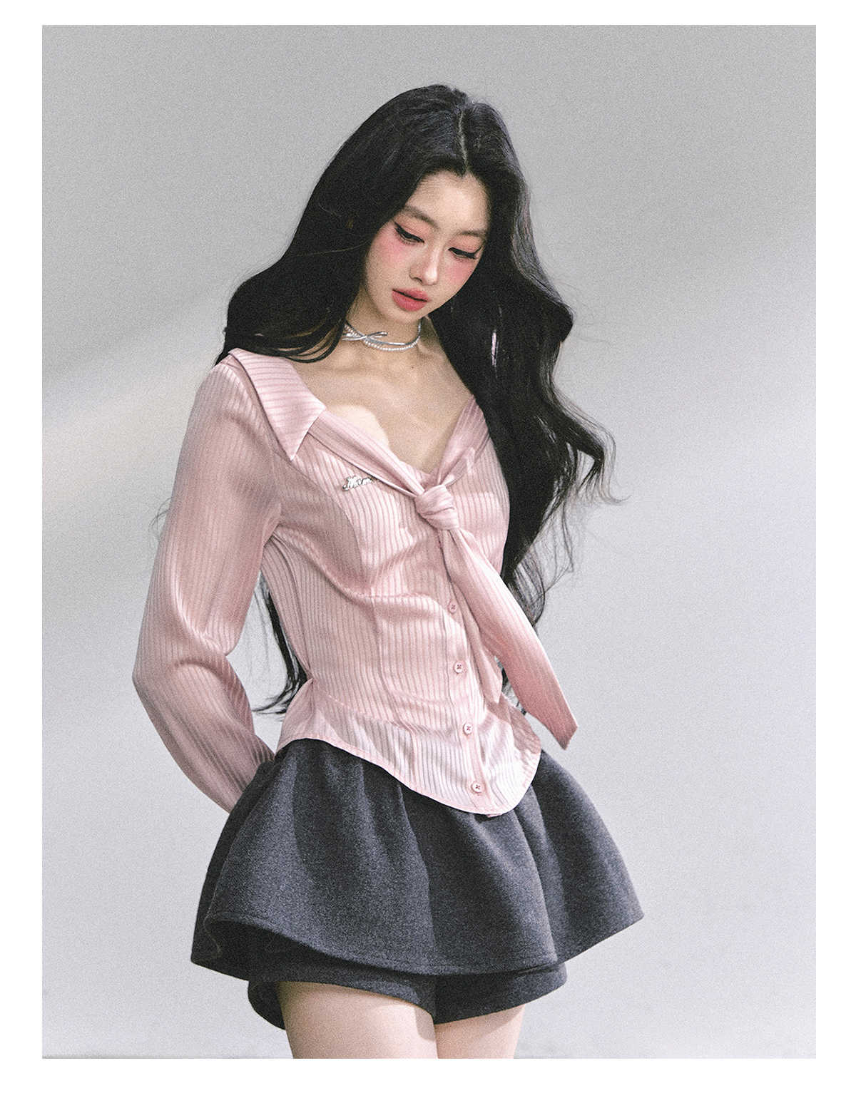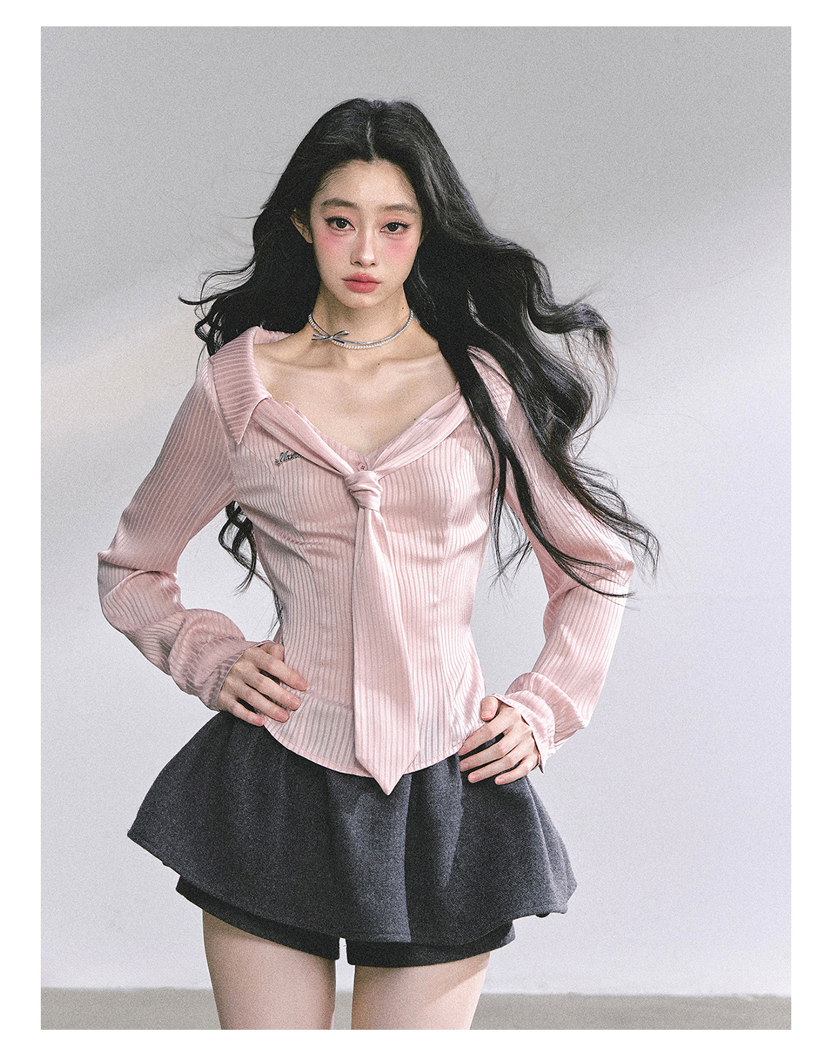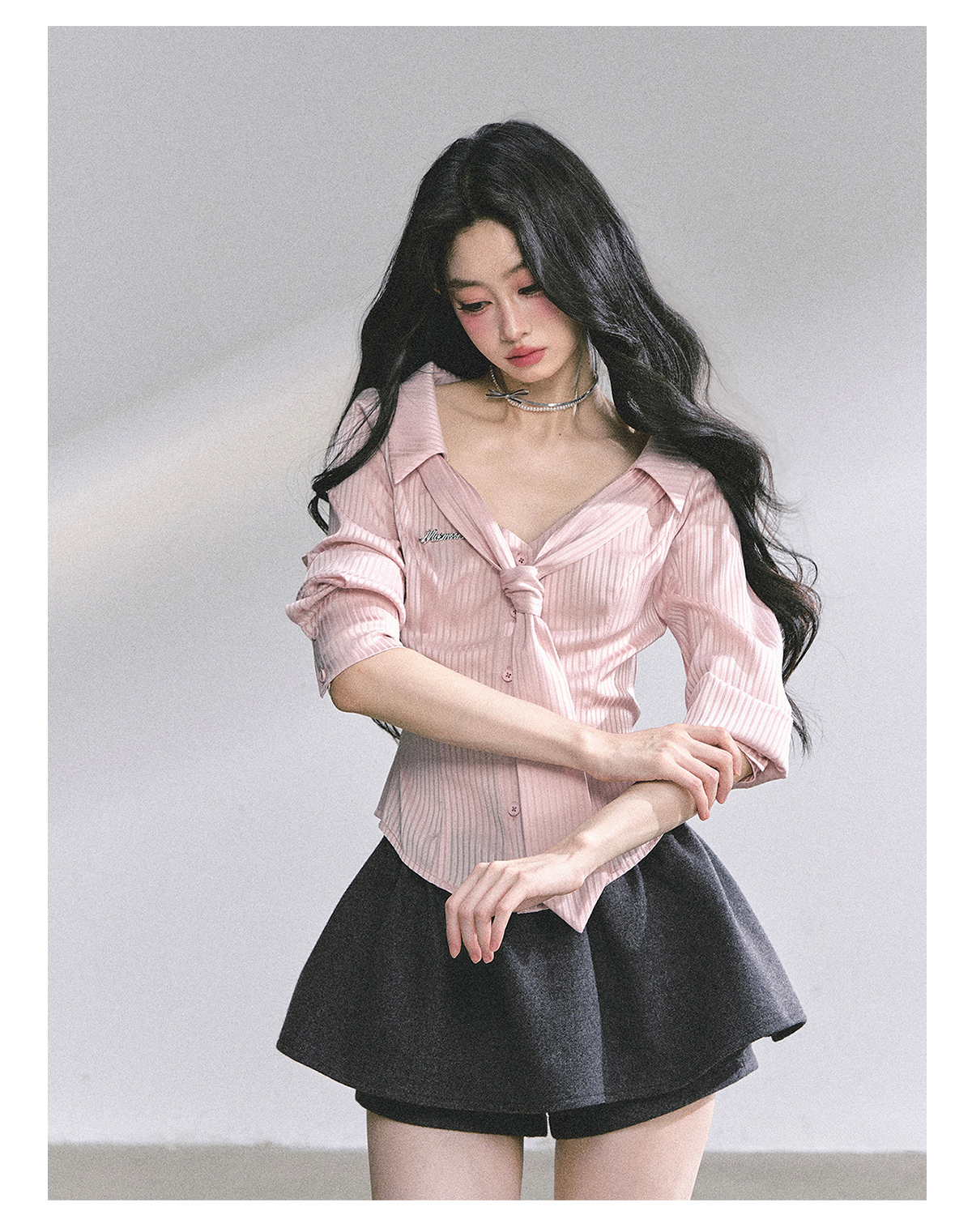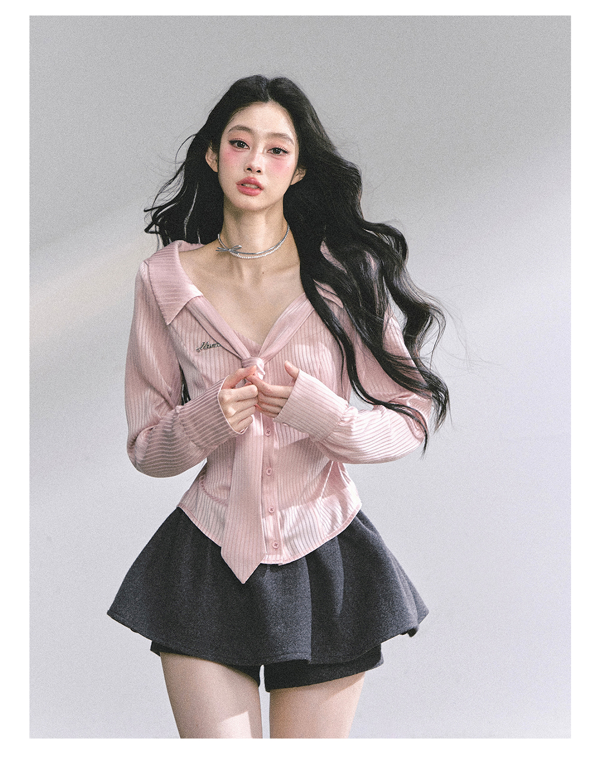 Shao Ye Yankou College % High-End French-Style Polo Collar Striped Shirt for Women, Autumn Waist-Cinching Slimming Sweet Top
