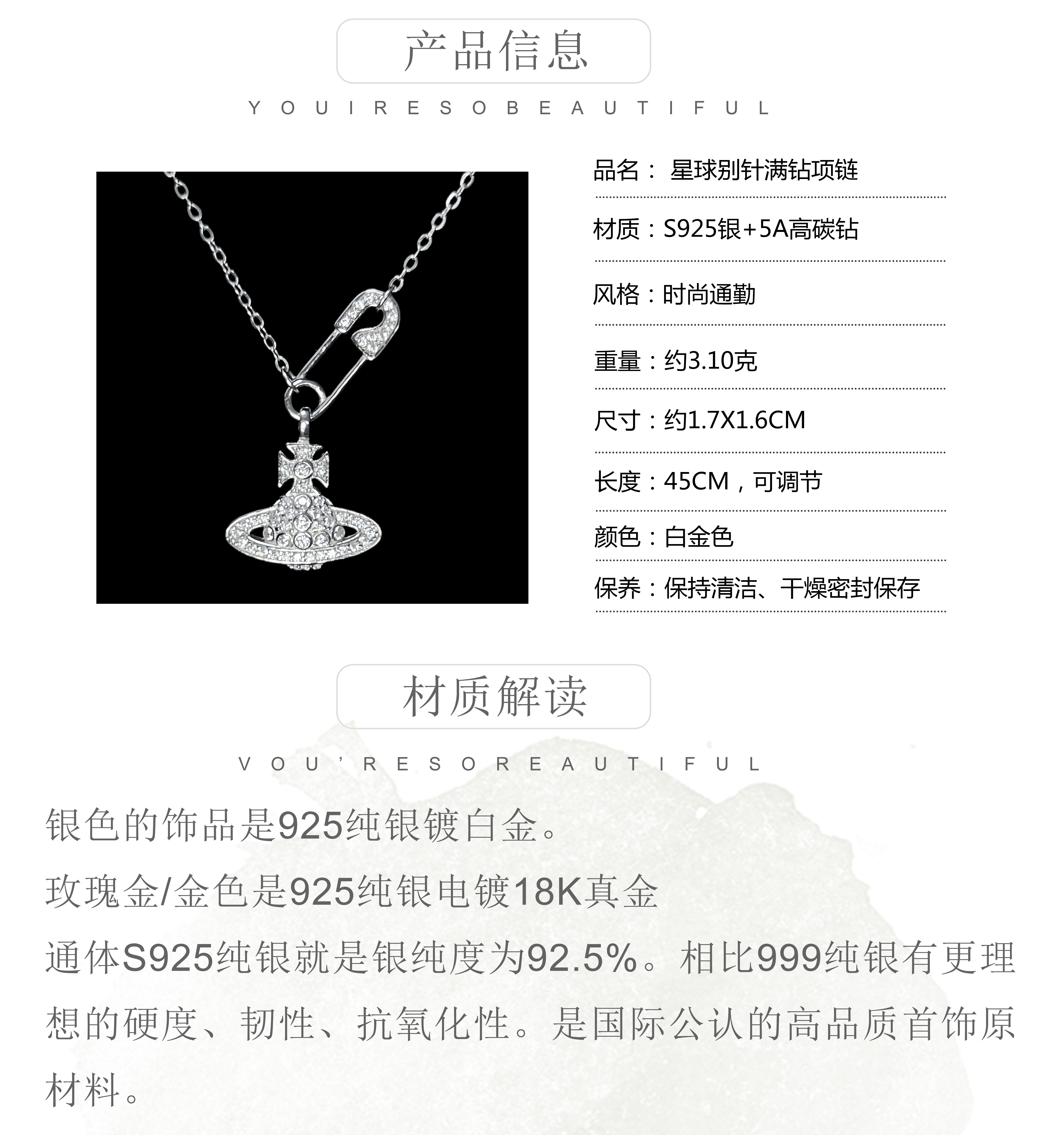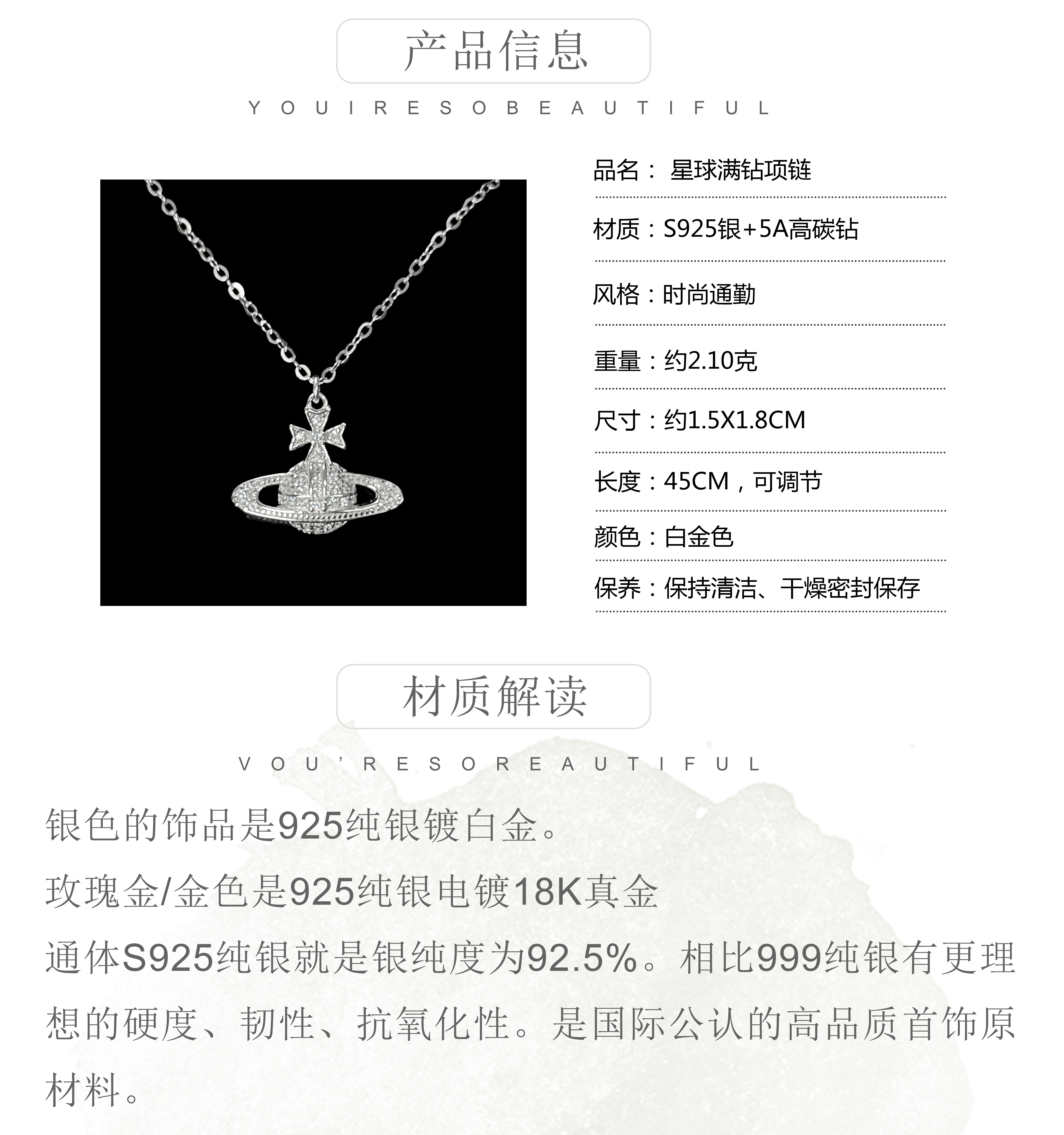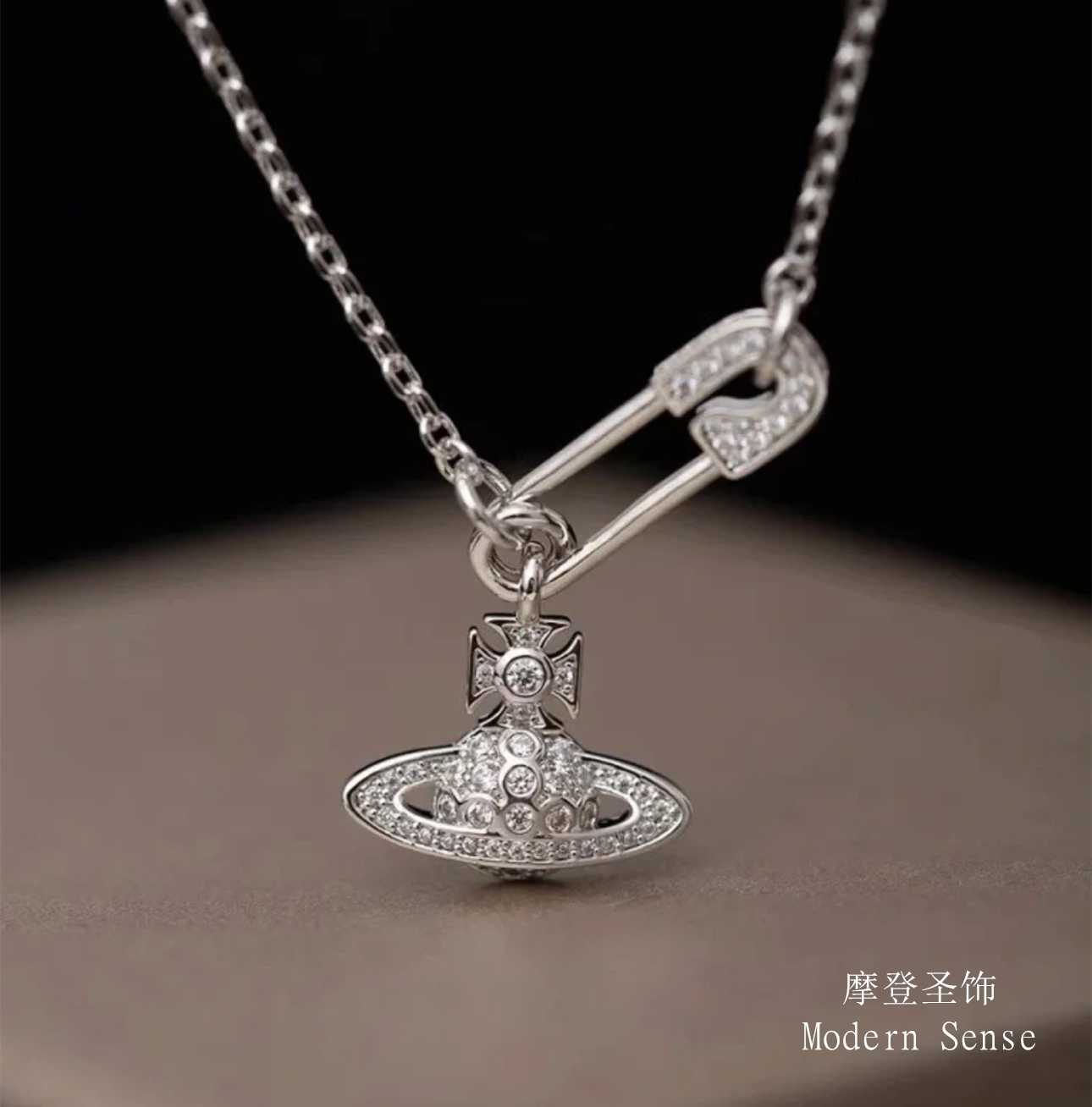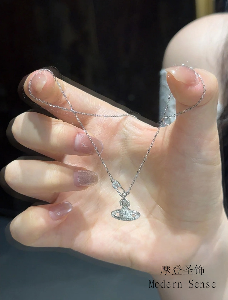 Modern Jewelry S925 Sterling Silver Saturn Pin Full Diamond Necklace Women's Clavicle Chain Valentine's Day Birthday Gift for Best Friend