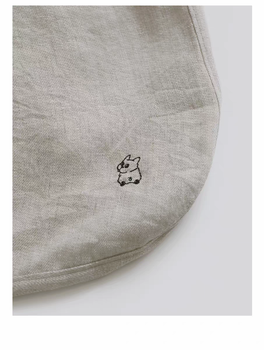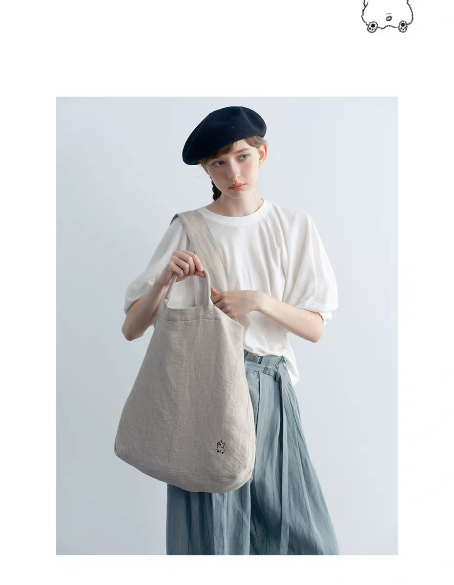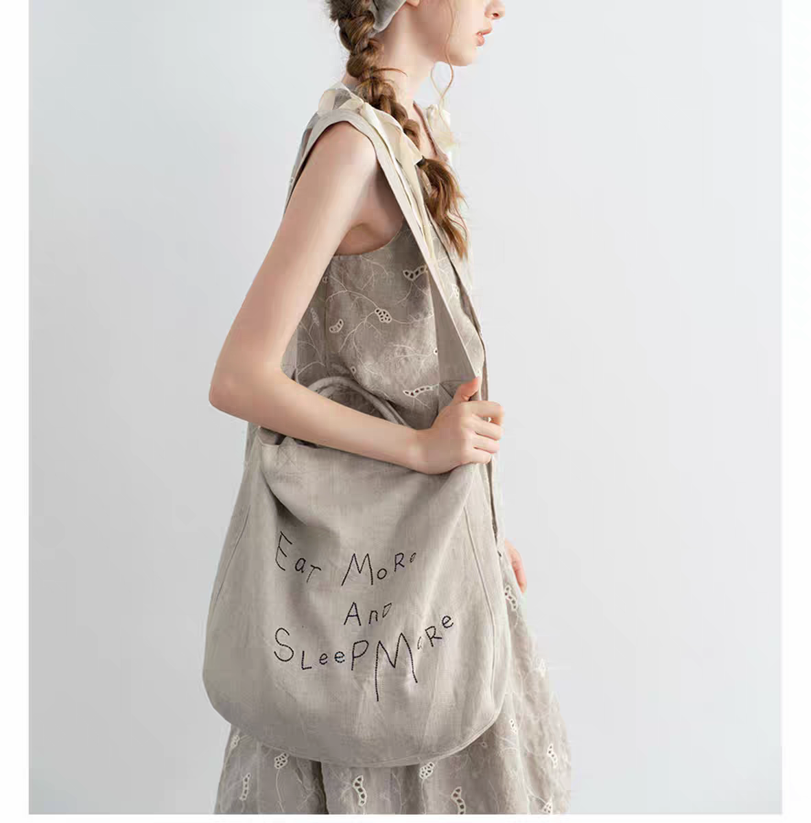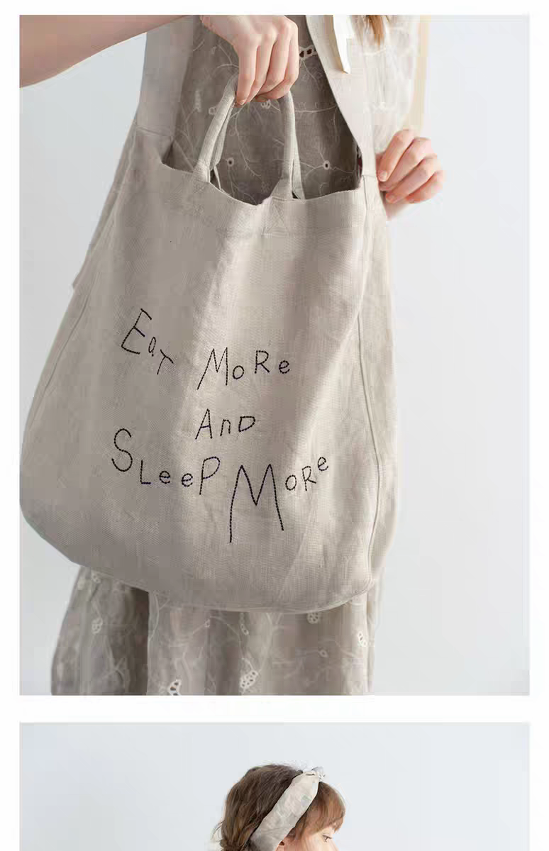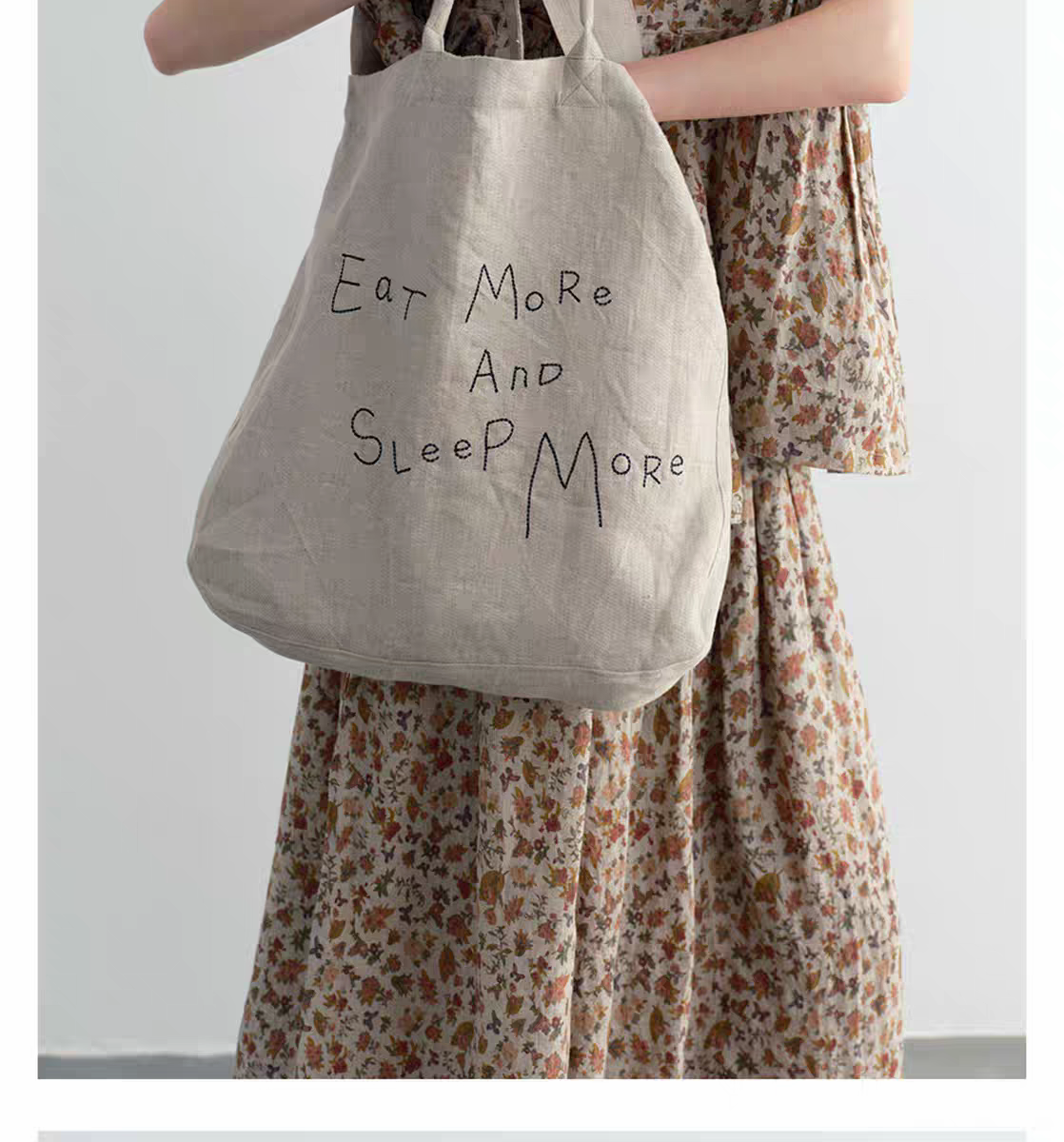 Pigige Bigigr "Eat More, Sleep More" Japanese-Style Heavy Linen Embroidered Dual-Use Cloth Bag Sp0027
