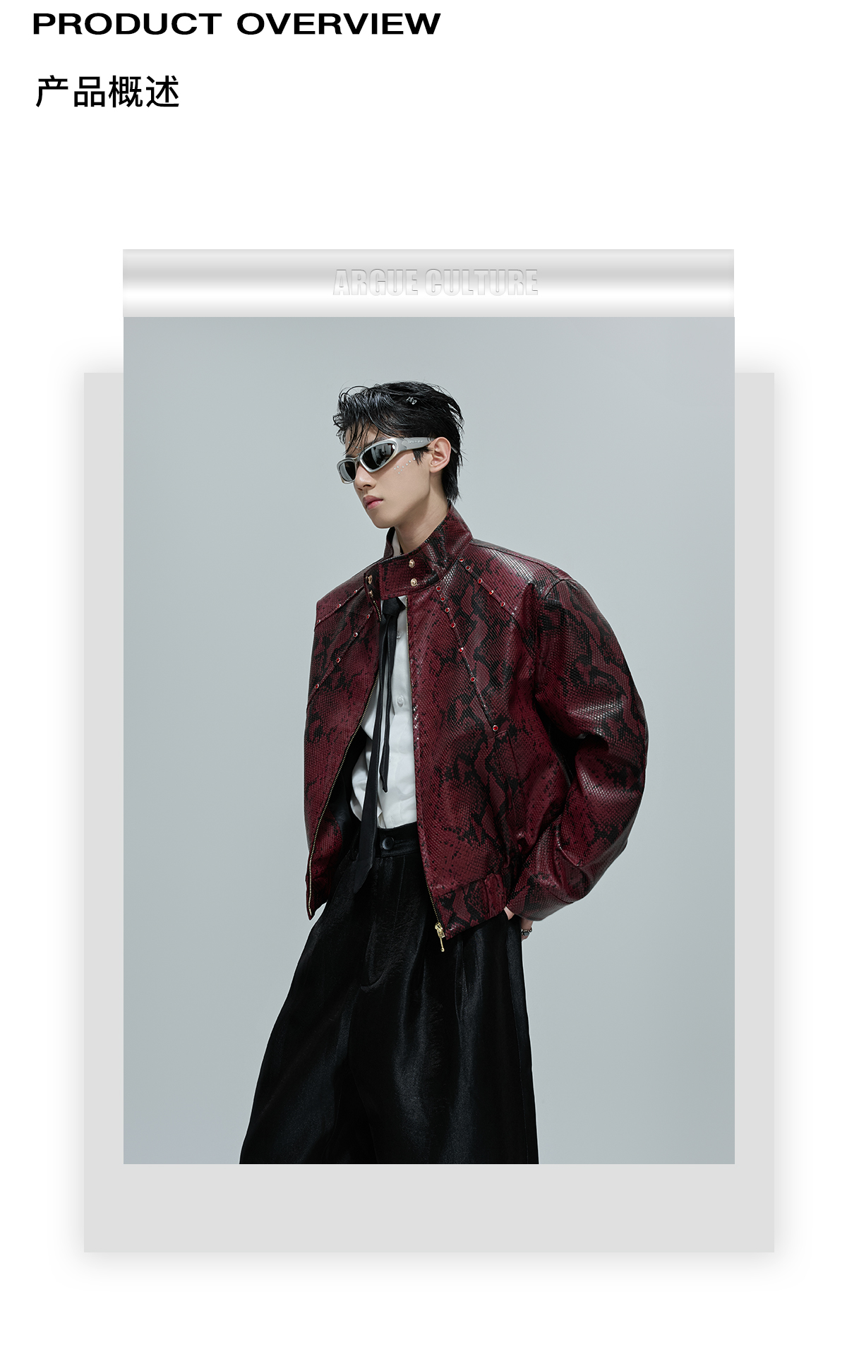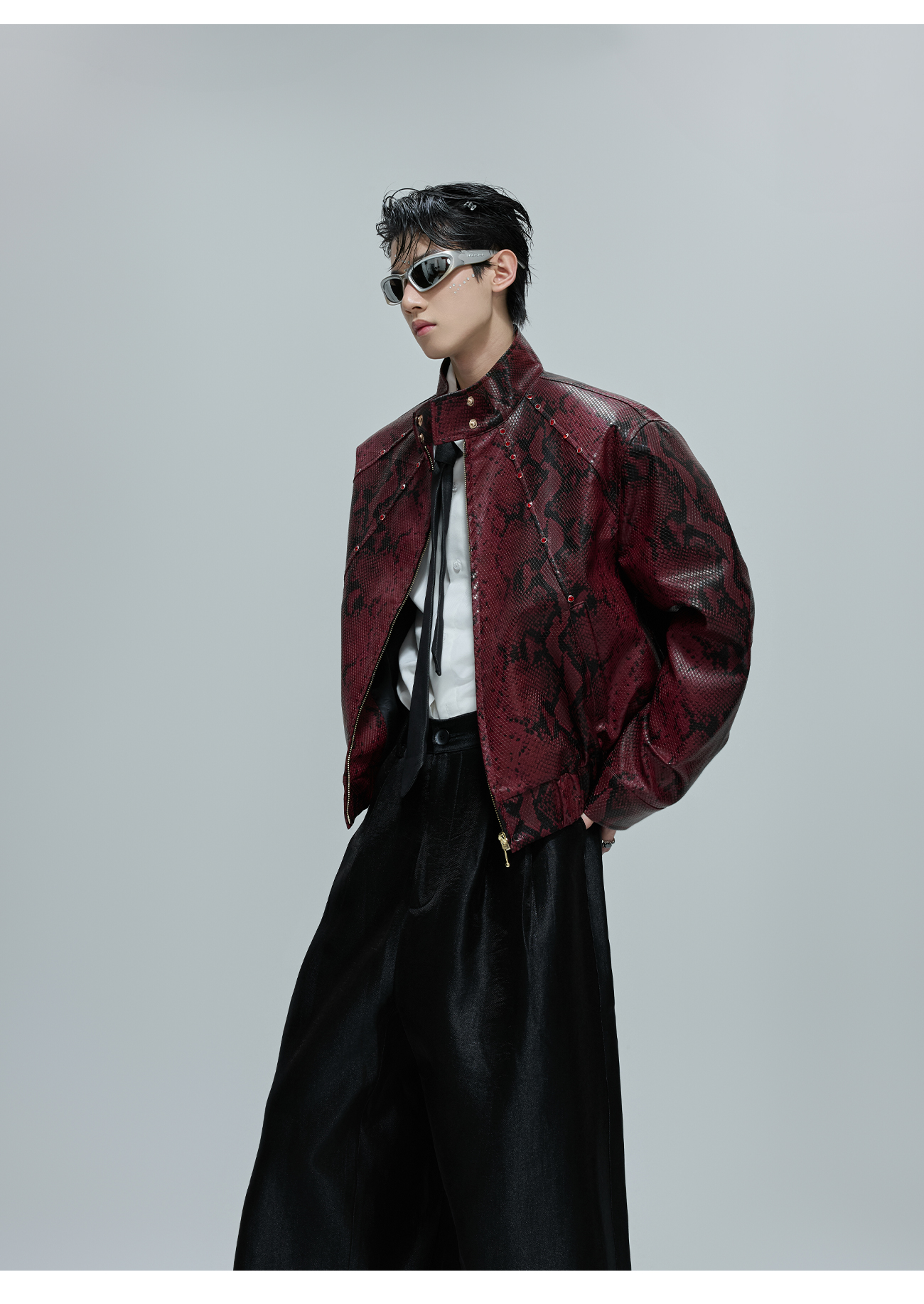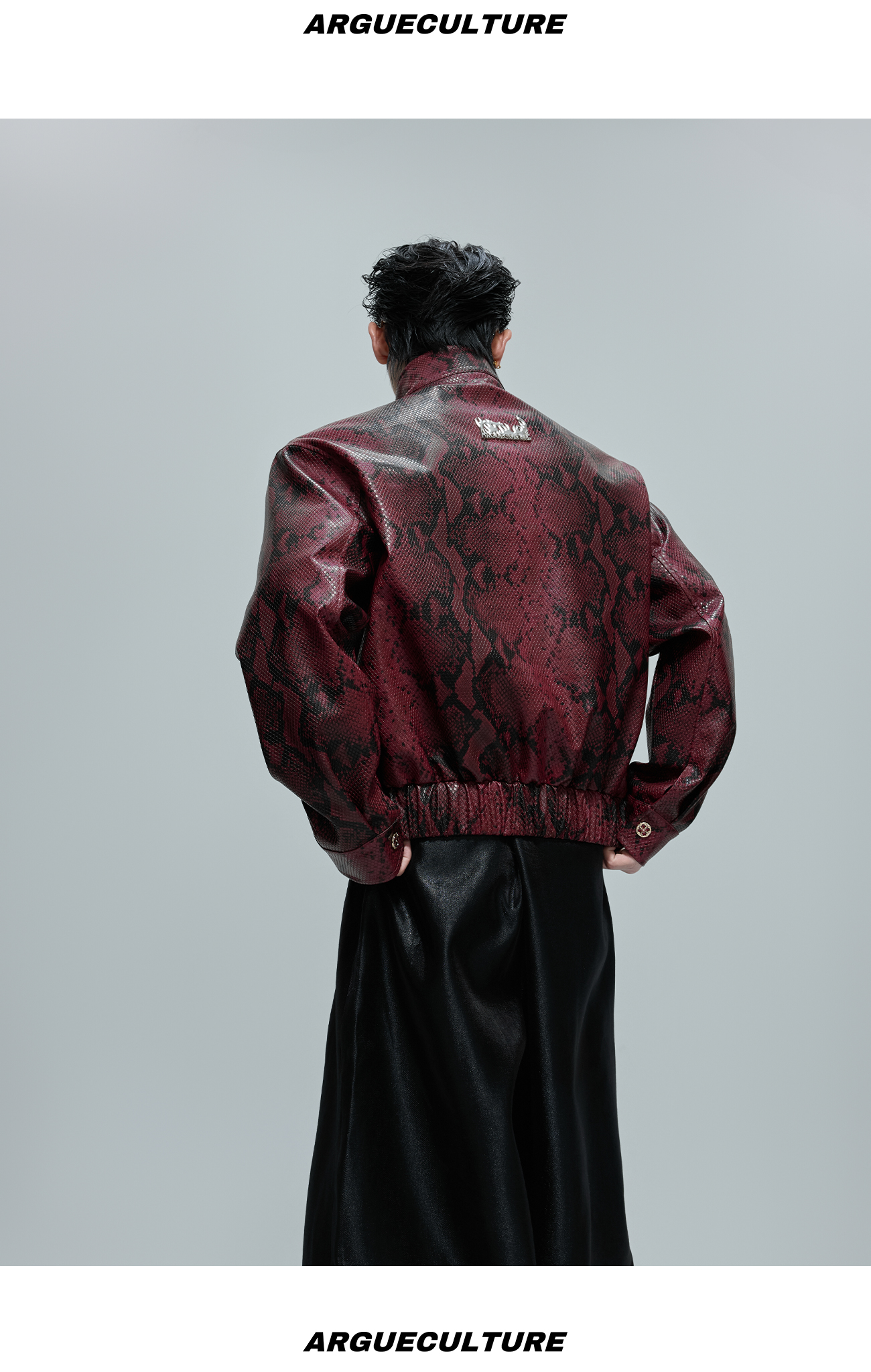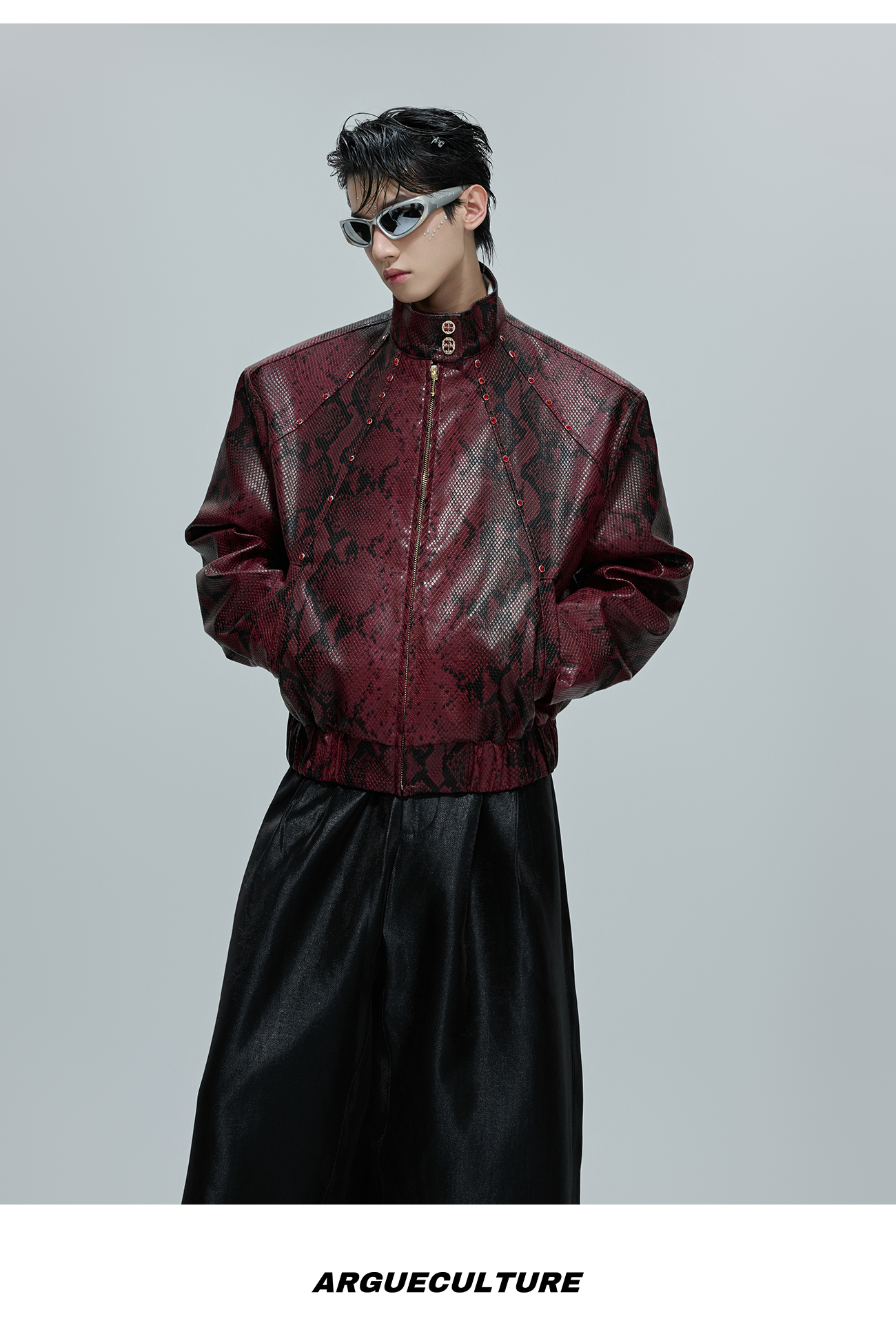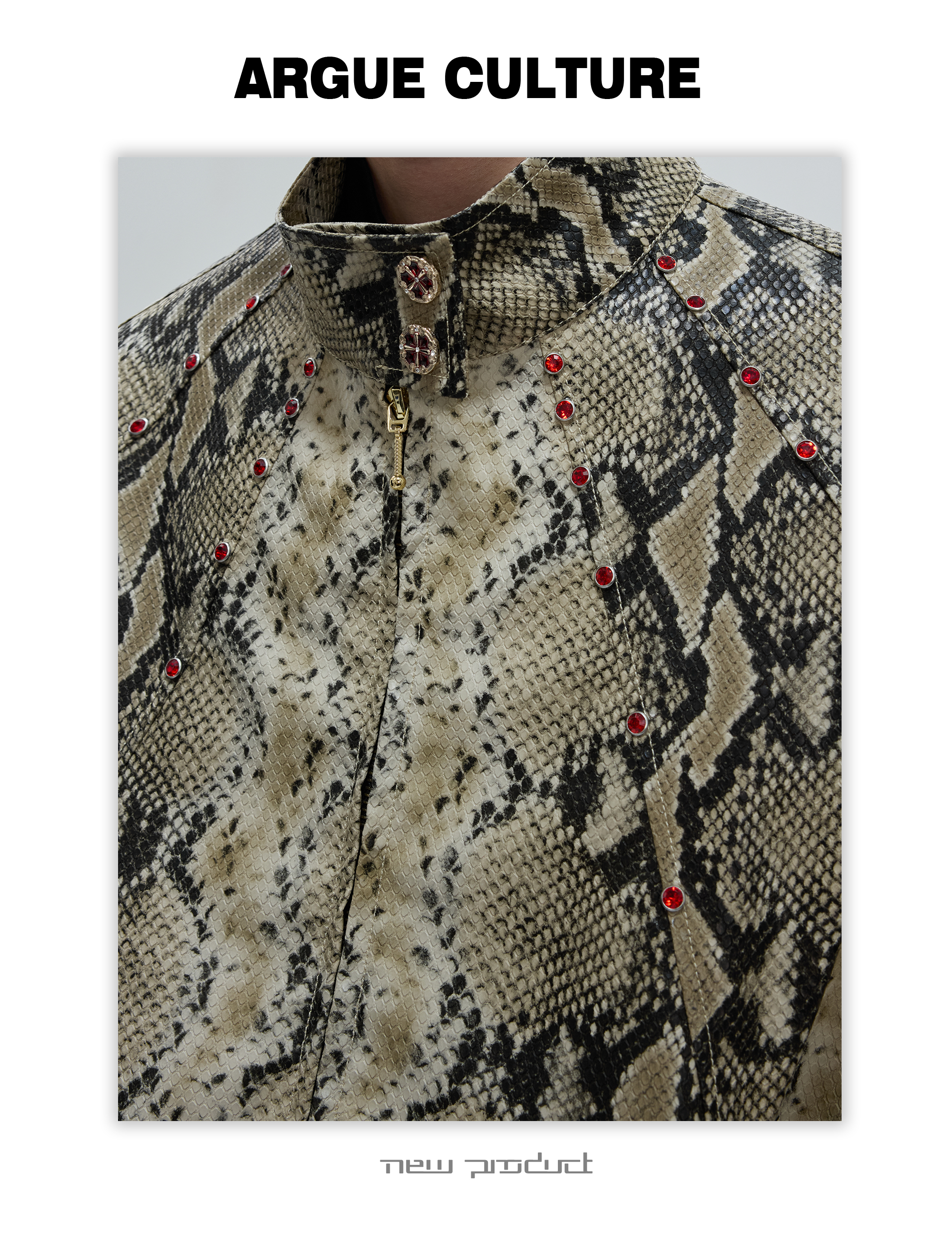 Argue Culture Niche Blood Python Texture Leather Jacket with Gem Embellishments, Stand Collar, Short Style, Autumn