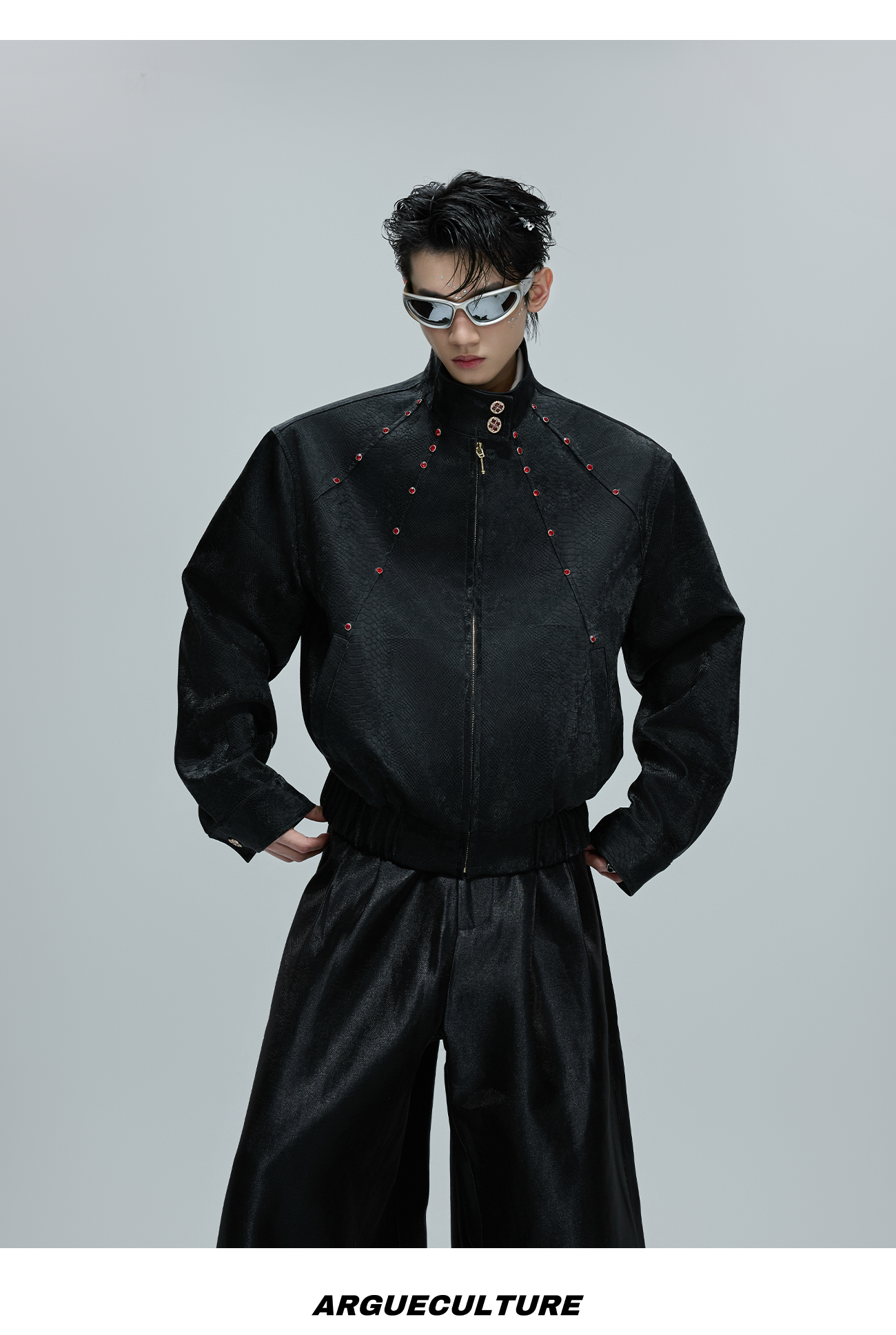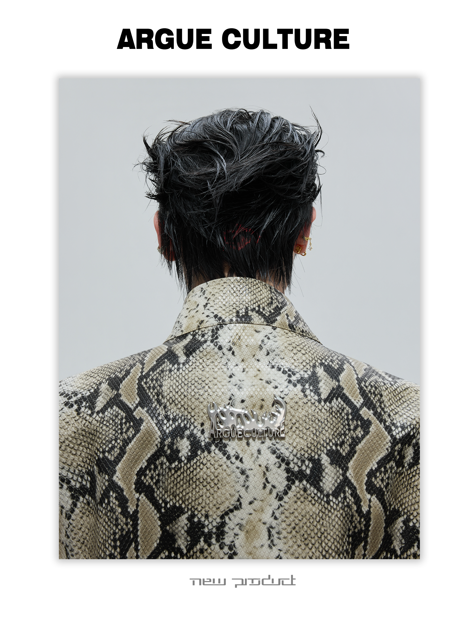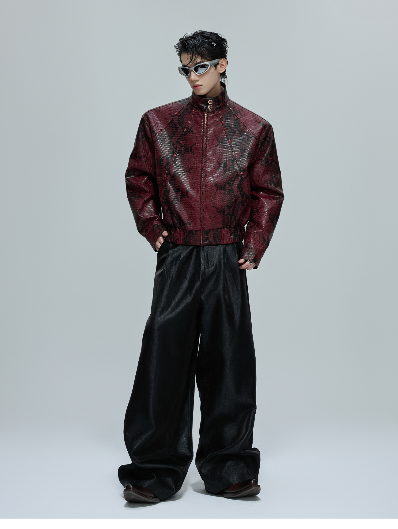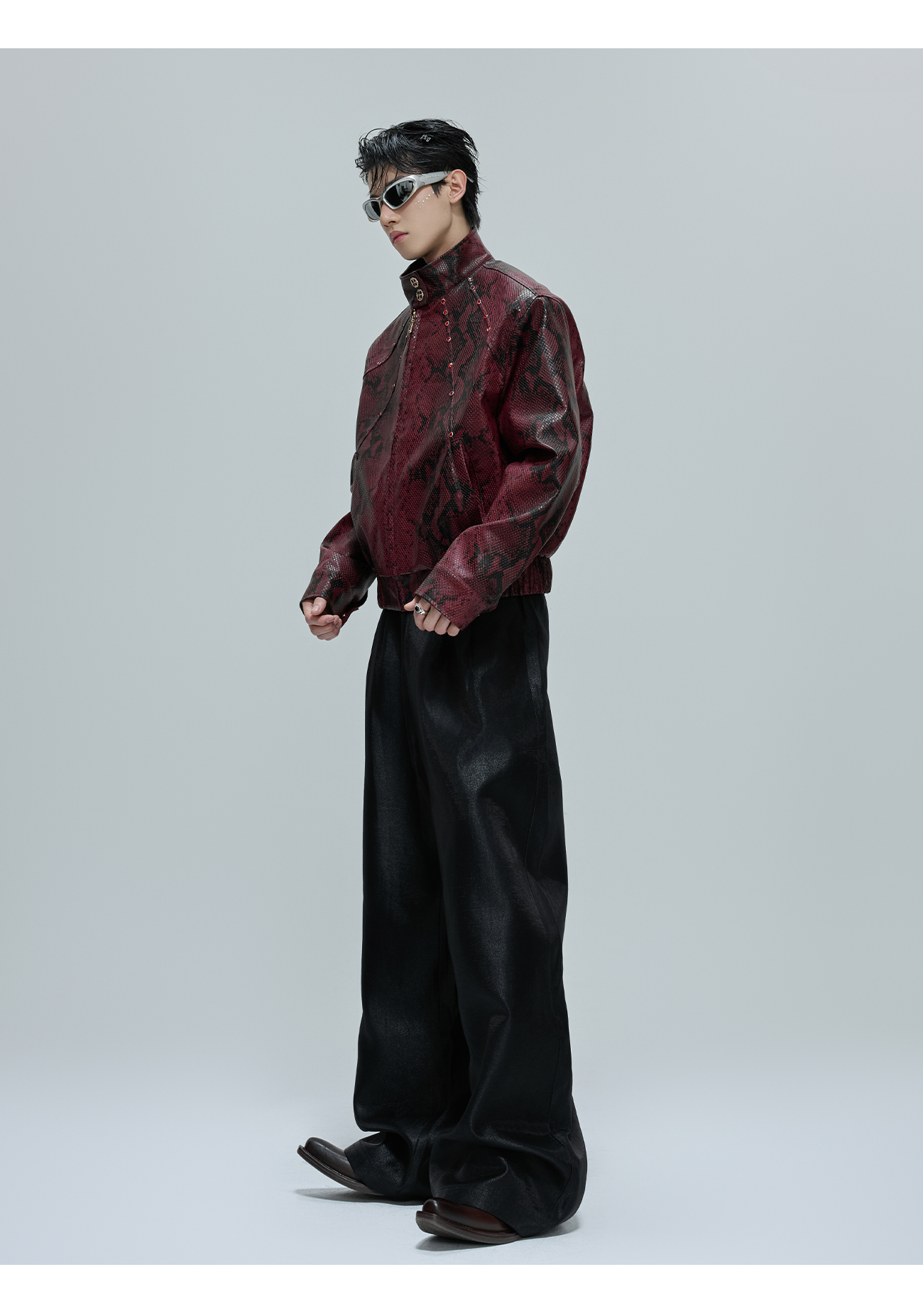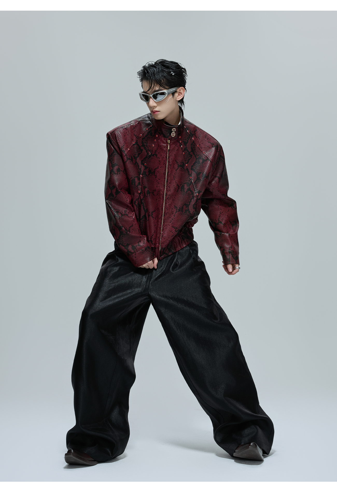 Argue Culture Niche Blood Python Texture Leather Jacket with Gem Embellishments, Stand Collar, Short Style, Autumn