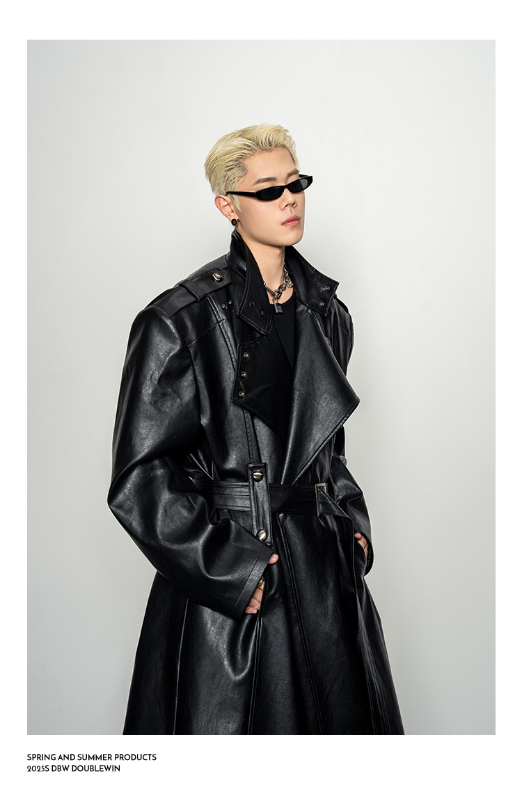 Dbwdoublewin Retro High-End Large Lapel Waist-Cinching Leather Coat Men's Stylish Avant-Garde Silhouette Long Coat