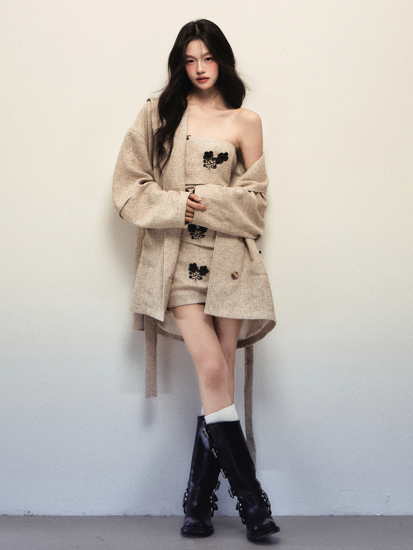 1P Studio Apricot-Colored Loose-Fitting Woolen Coat for Women, Autumn and Winter Belted Woolen Coat, Tube Top Skirt Set