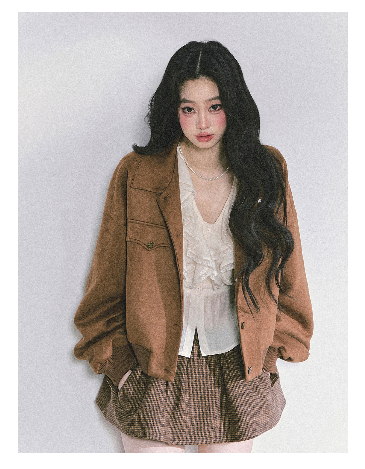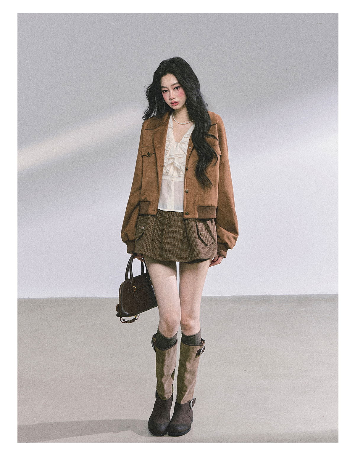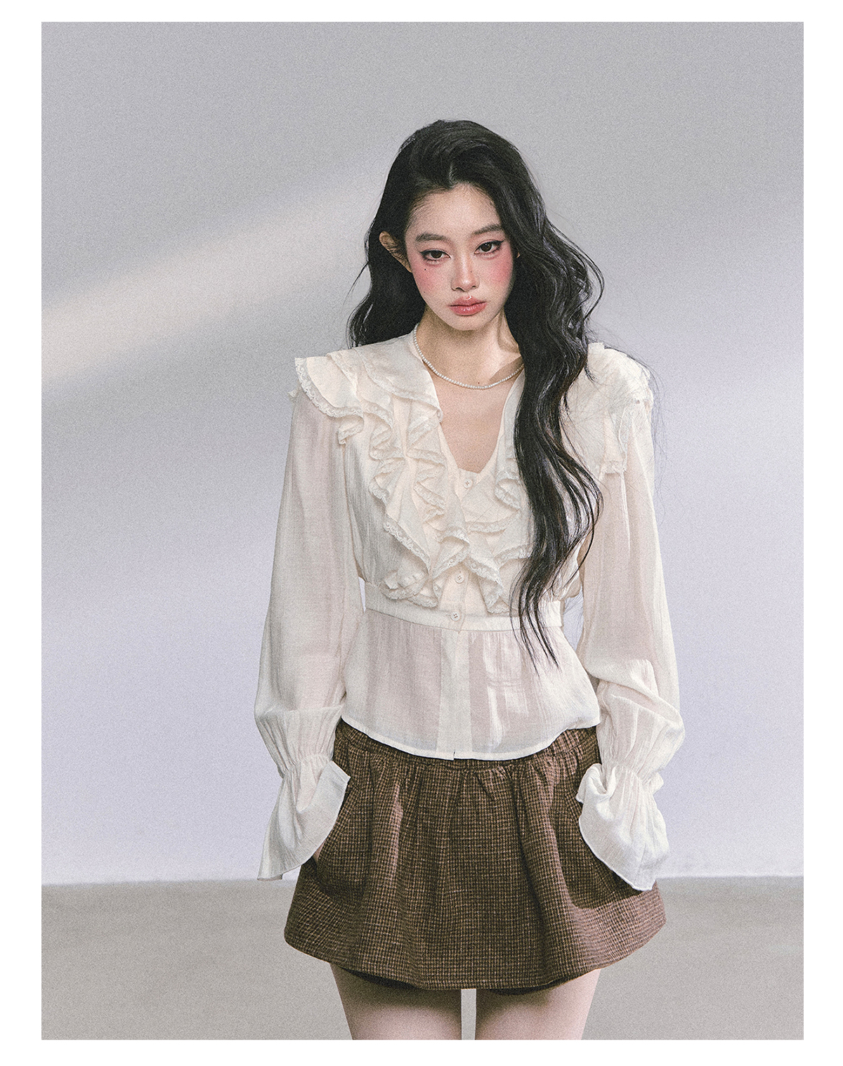 Shao Ye Yanzhao He Naosui% High-End French V-Neck Lace Shirt for Women, Autumn Waist-Cinching Slimming Ruffle Top