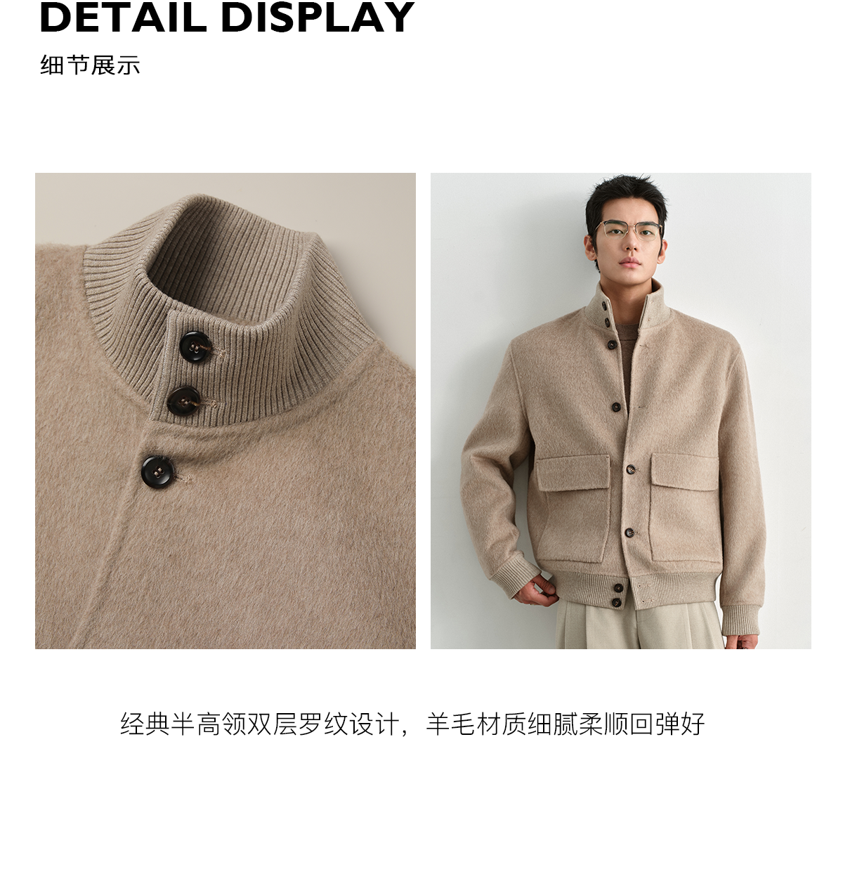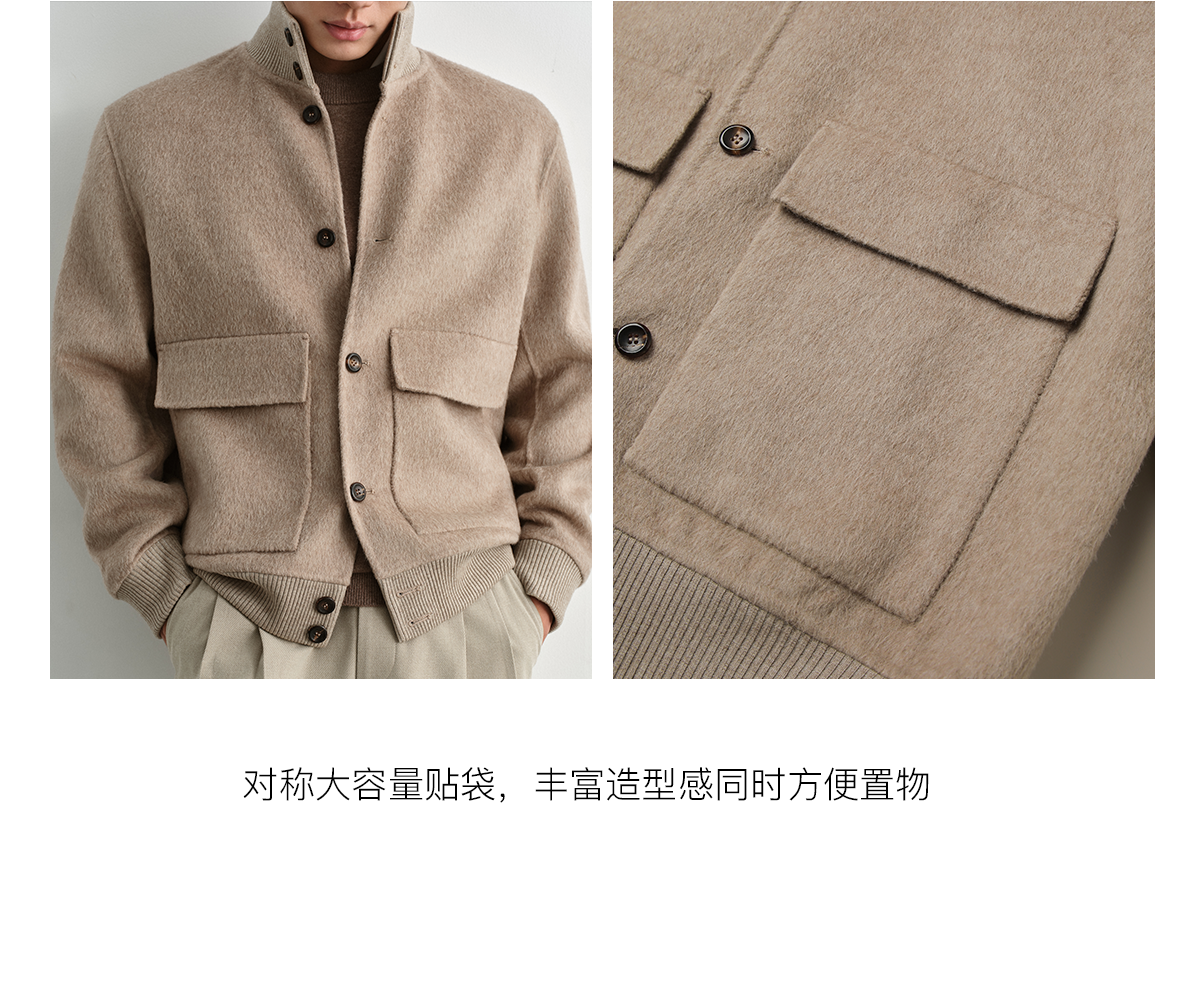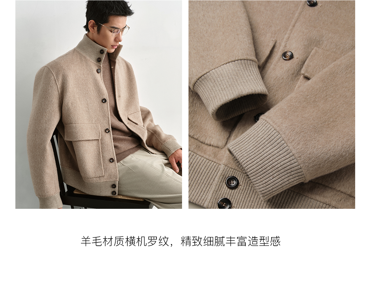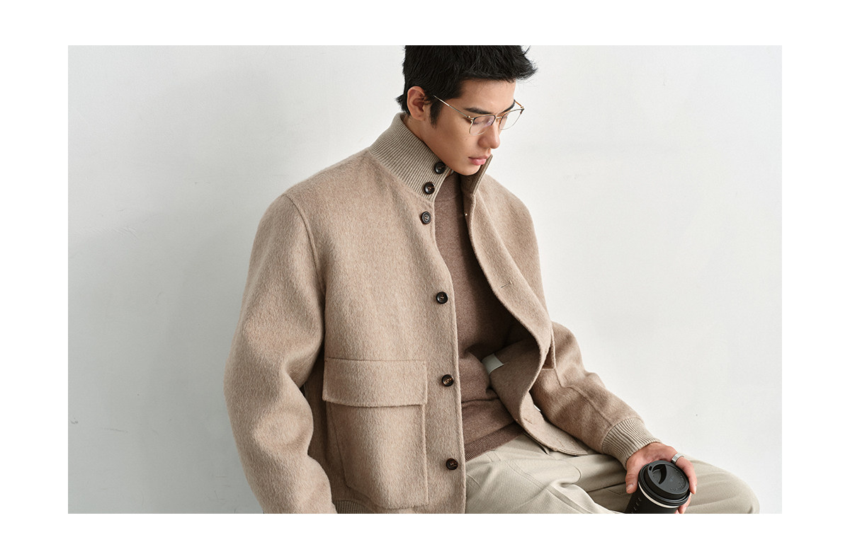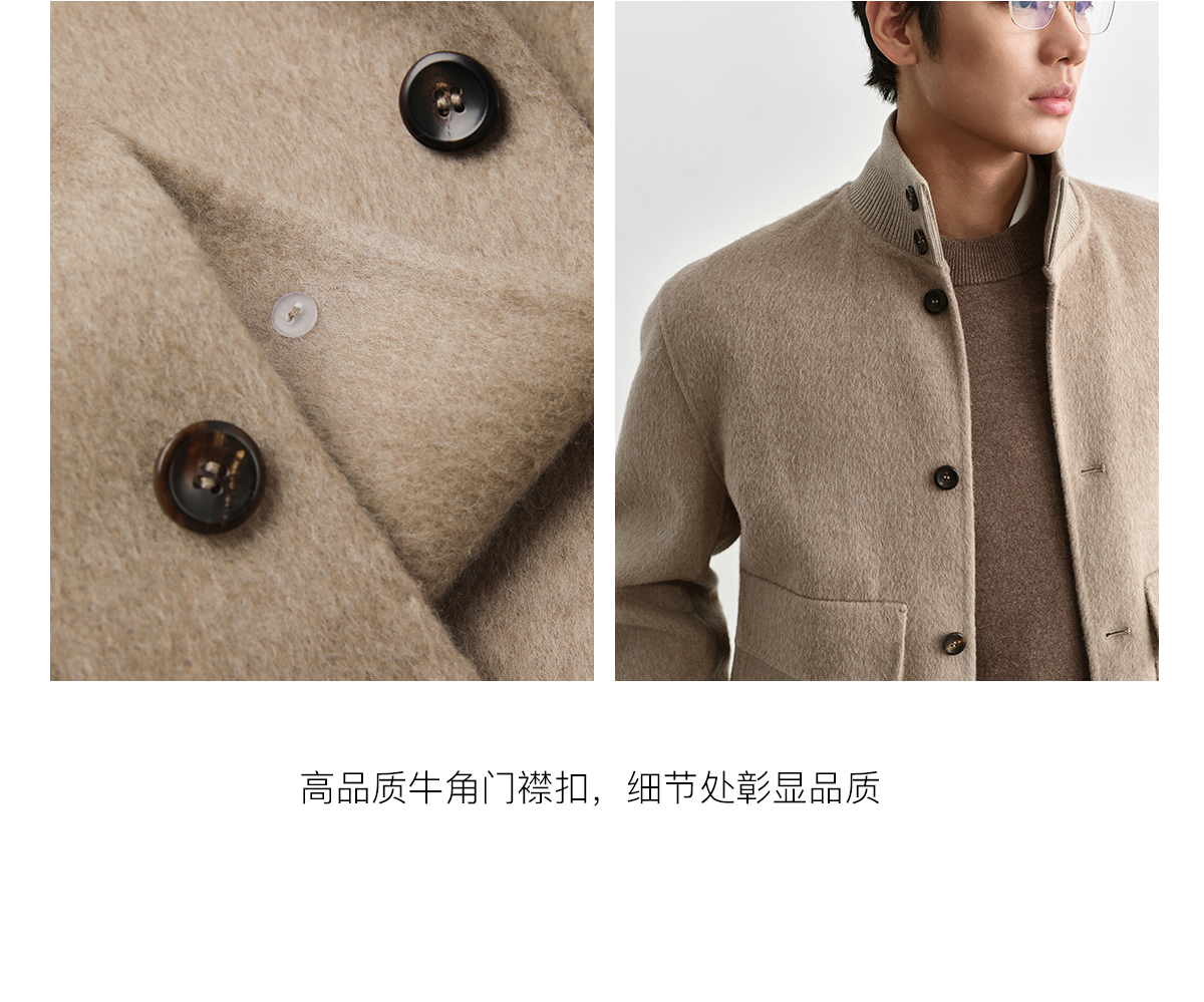 Osens Camel Wool, Mulberry Silk, and Wool Classic Half-High Collar Short Double-Sided Wool Coat Jacket for Men Winter