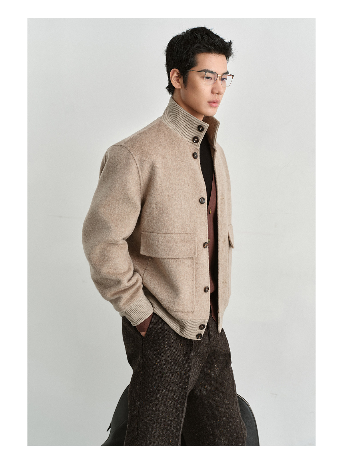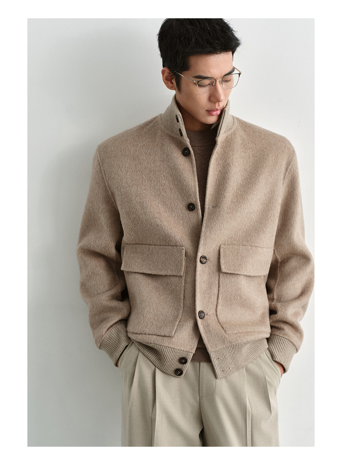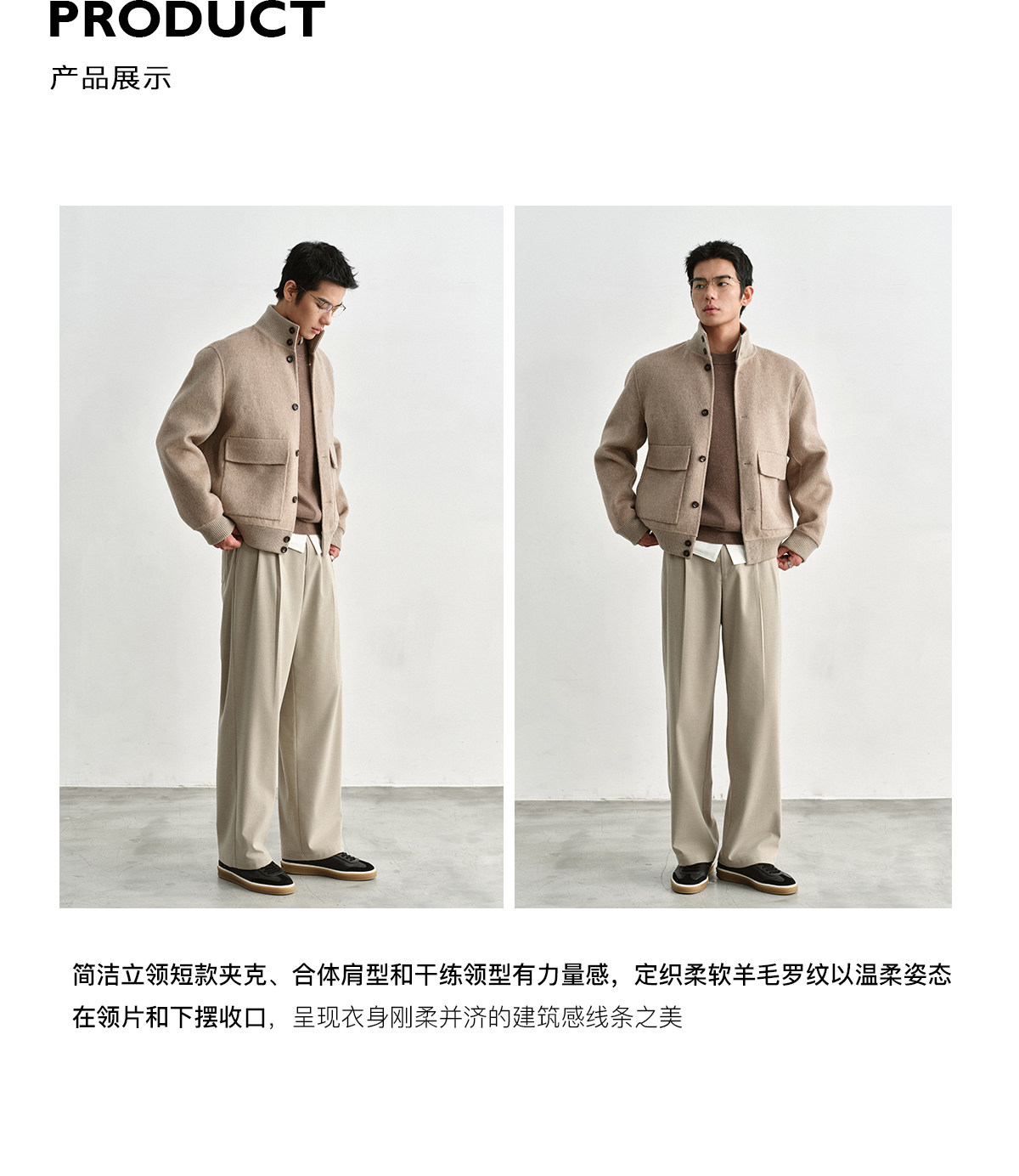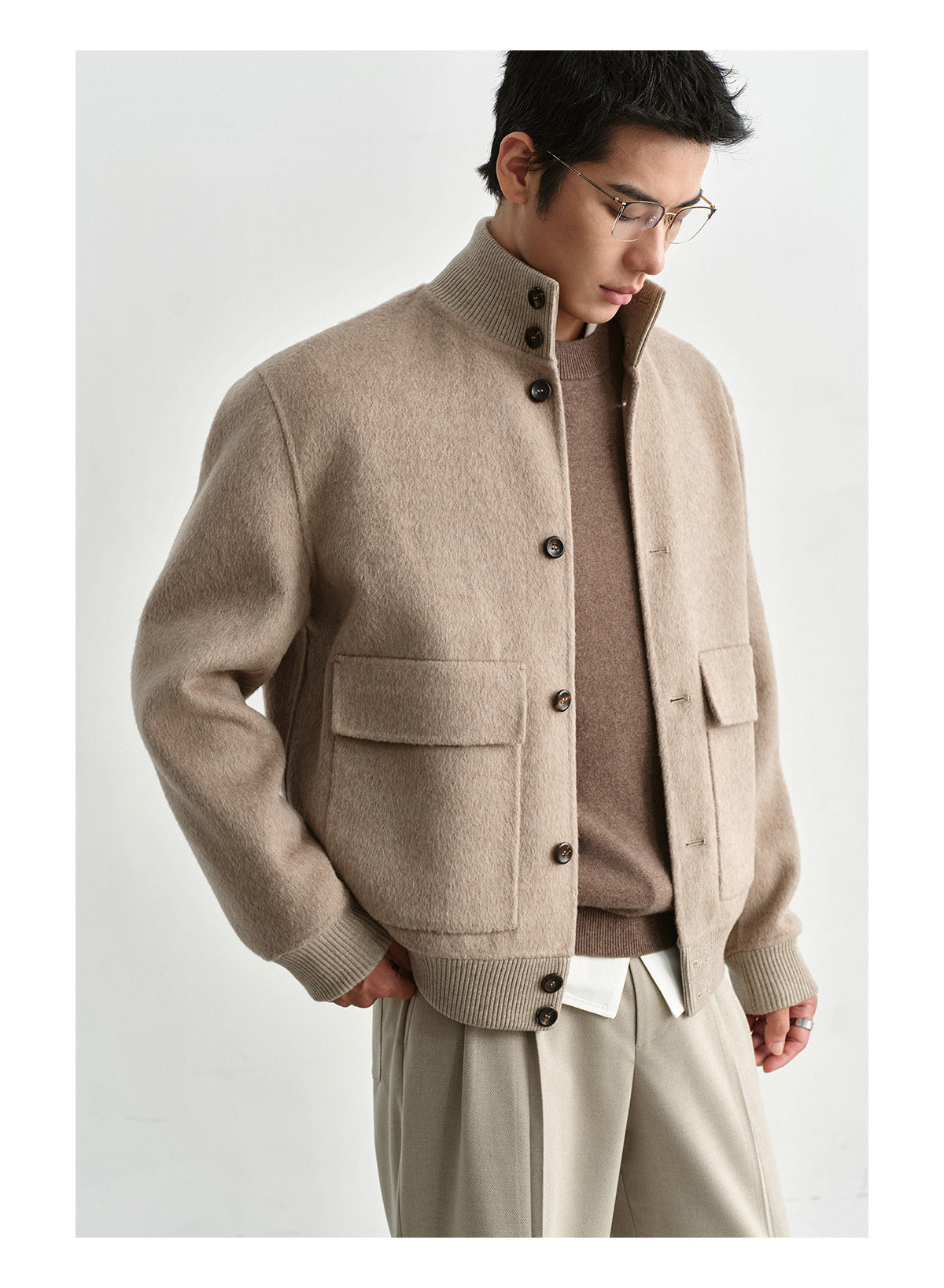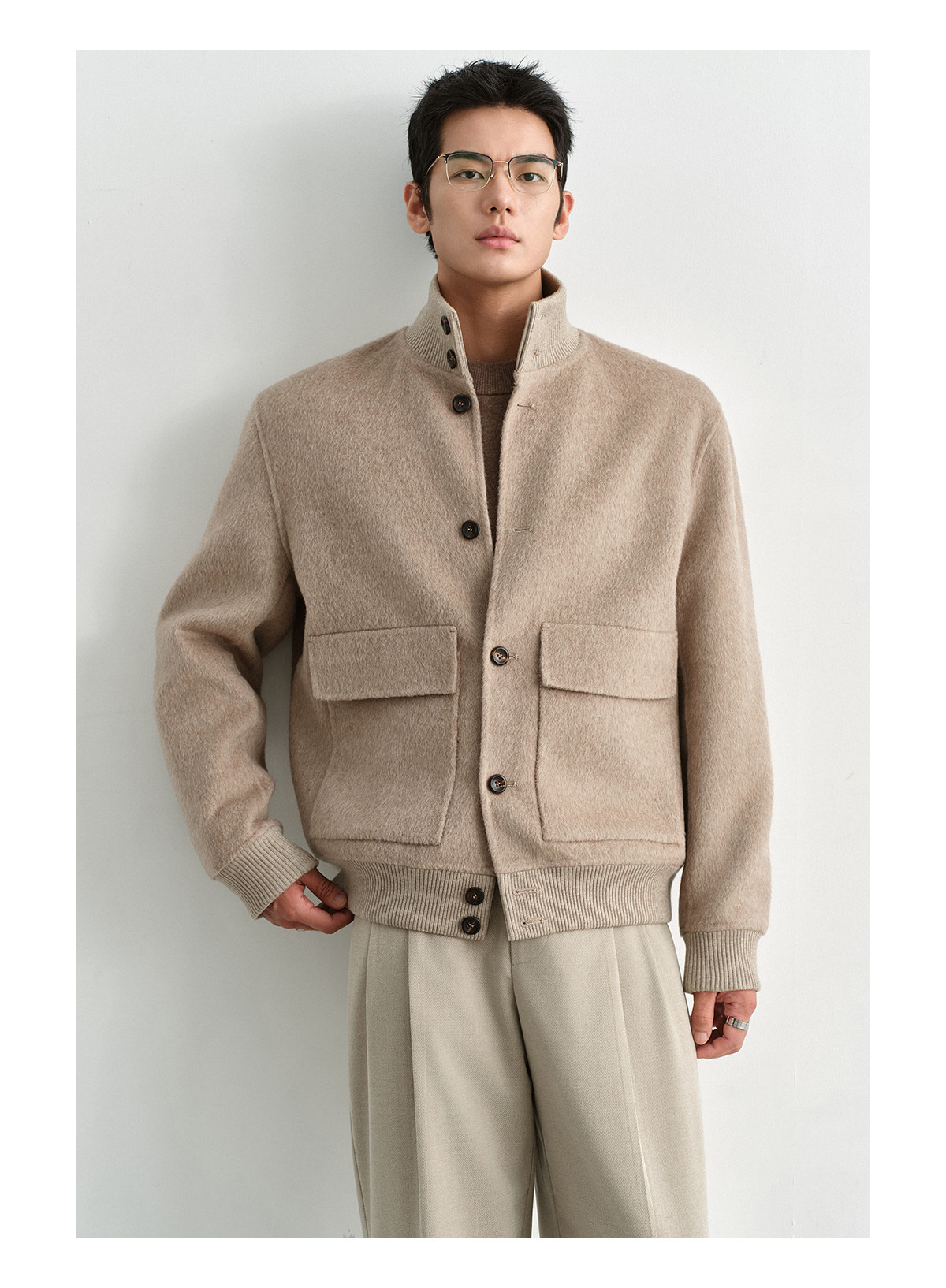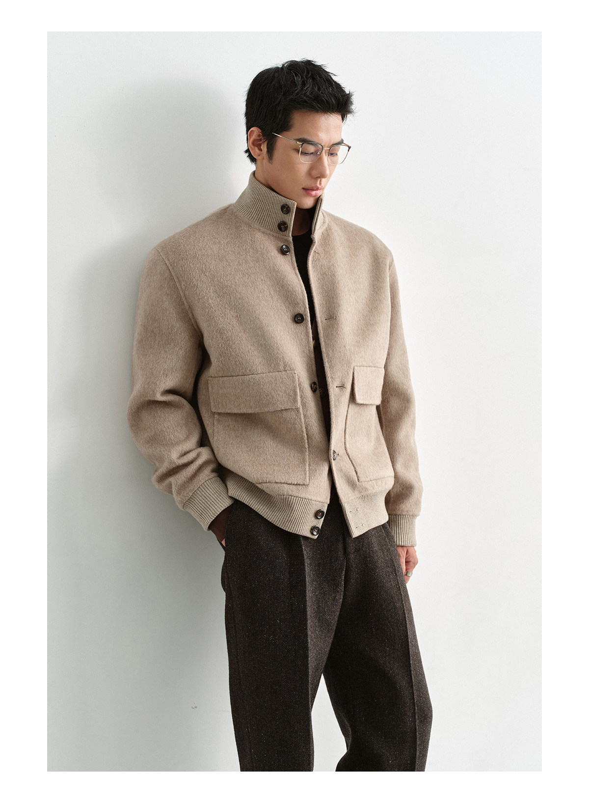 Osens Camel Wool, Mulberry Silk, and Wool Classic Half-High Collar Short Double-Sided Wool Coat Jacket for Men Winter