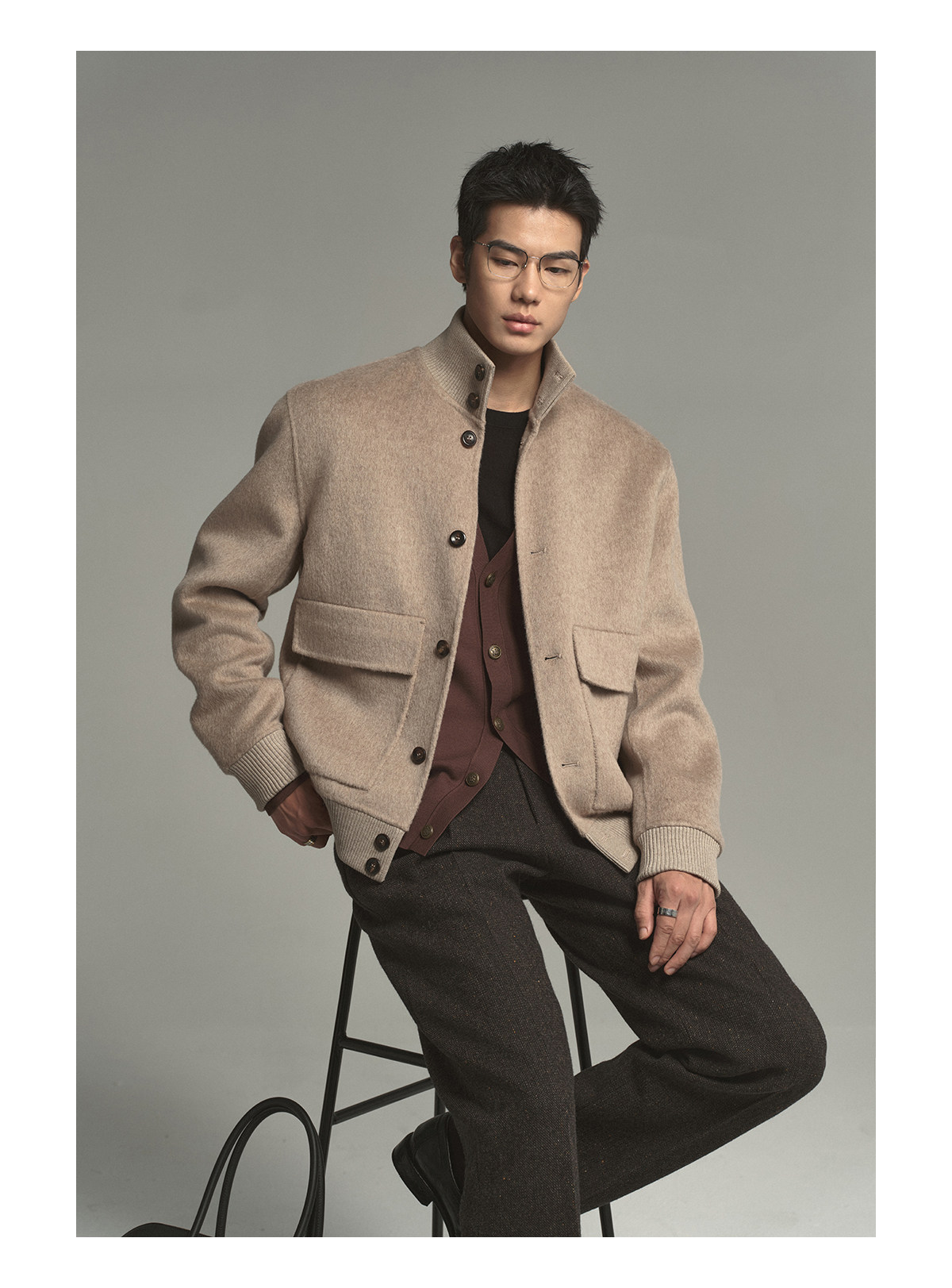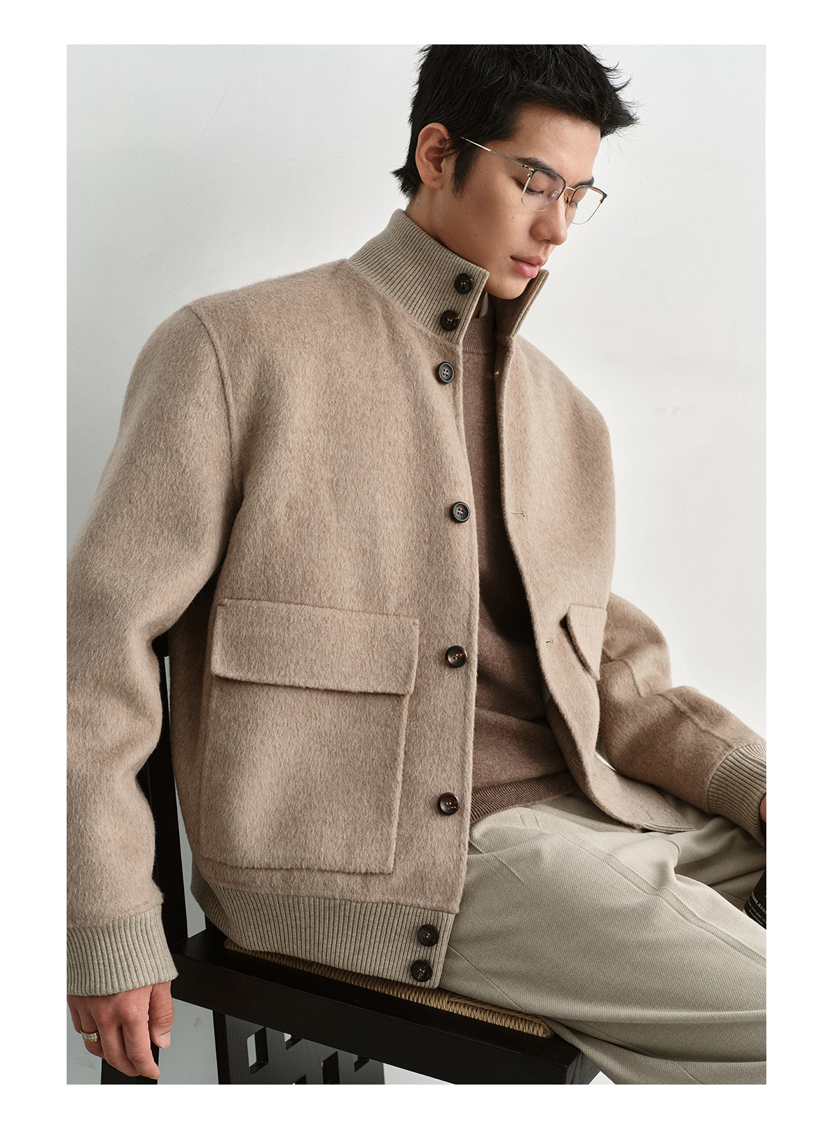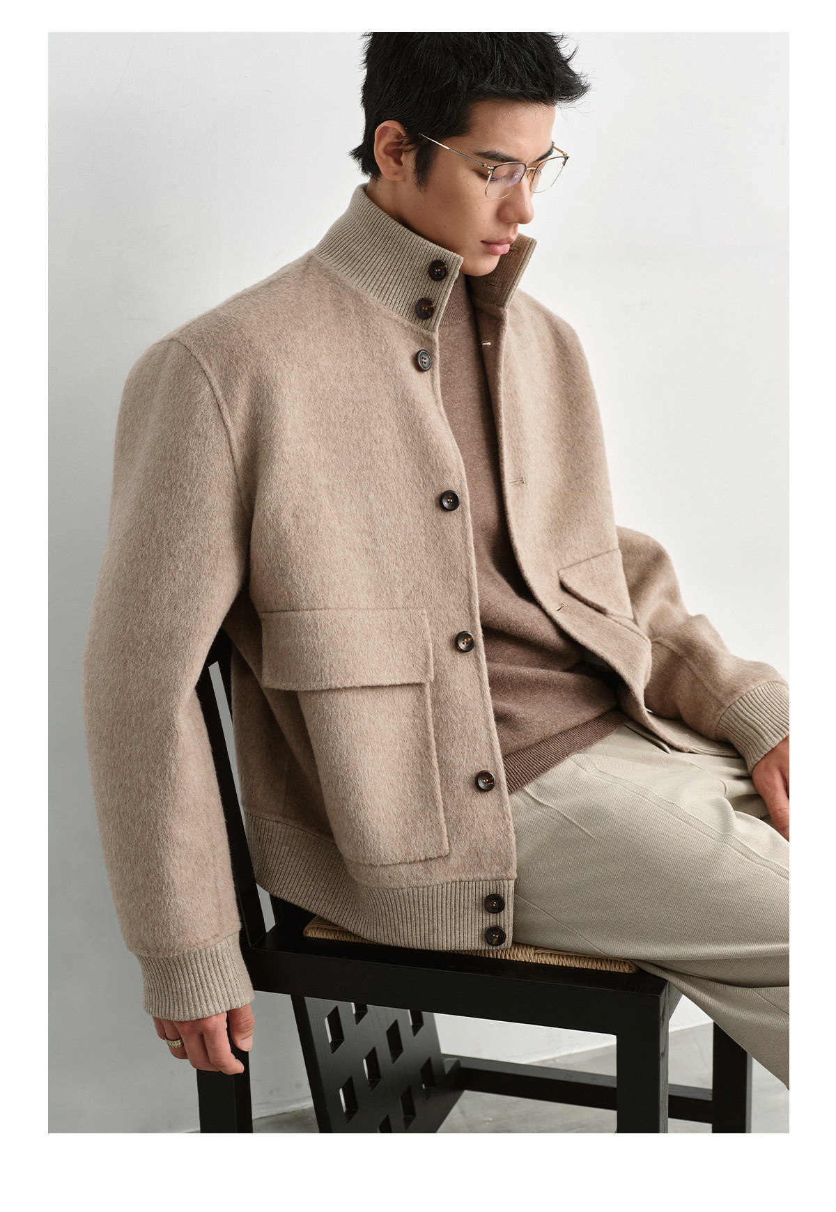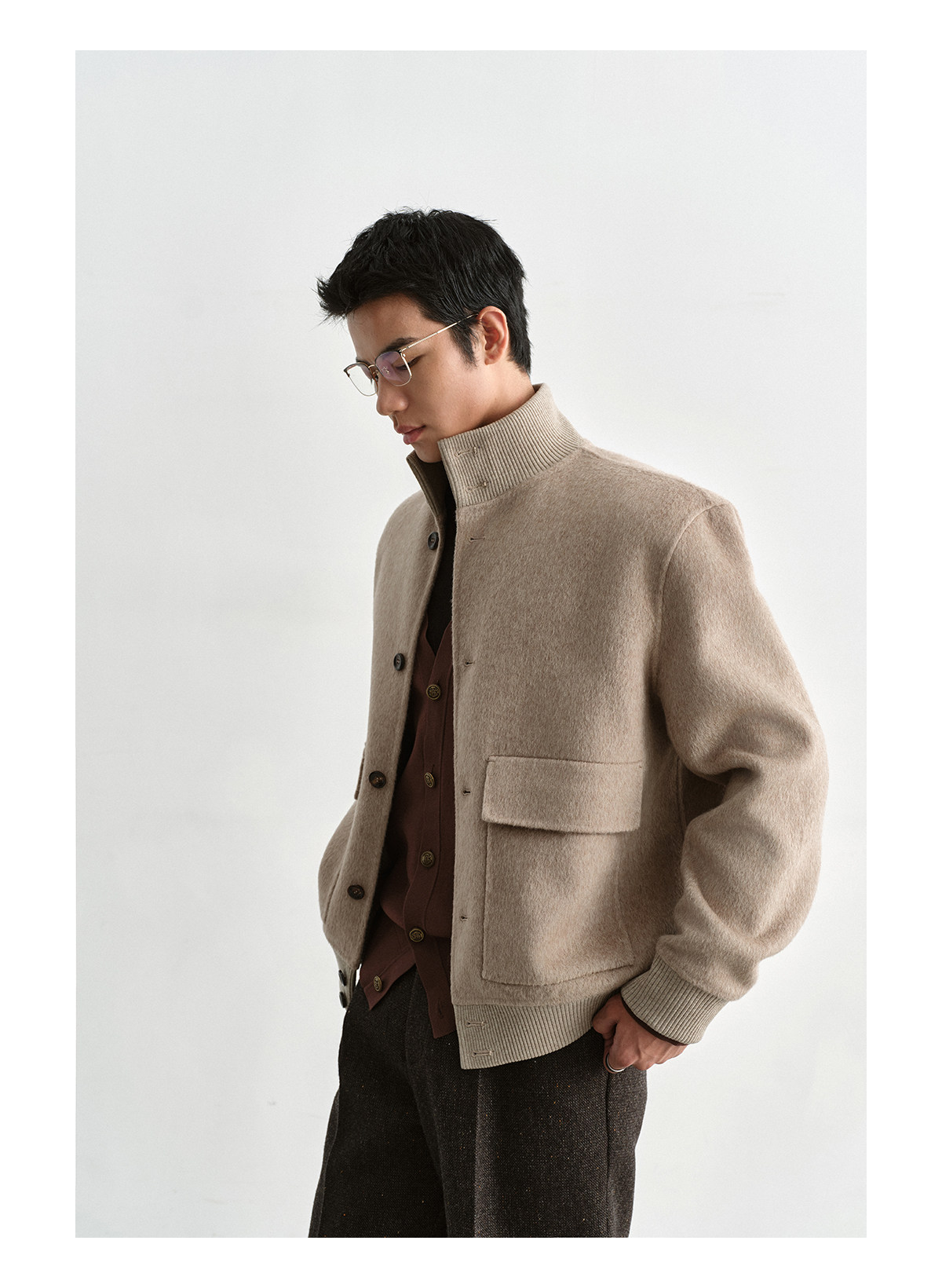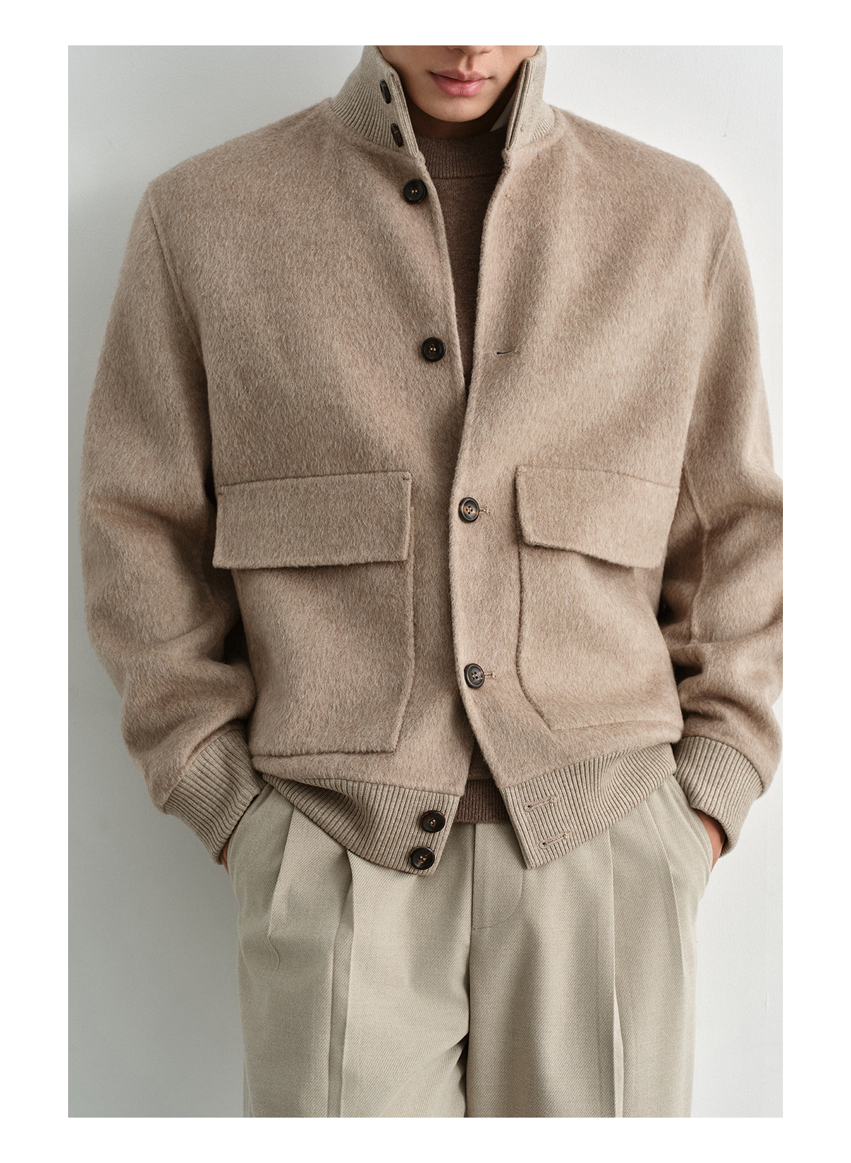 Osens Camel Wool, Mulberry Silk, and Wool Classic Half-High Collar Short Double-Sided Wool Coat Jacket for Men Winter