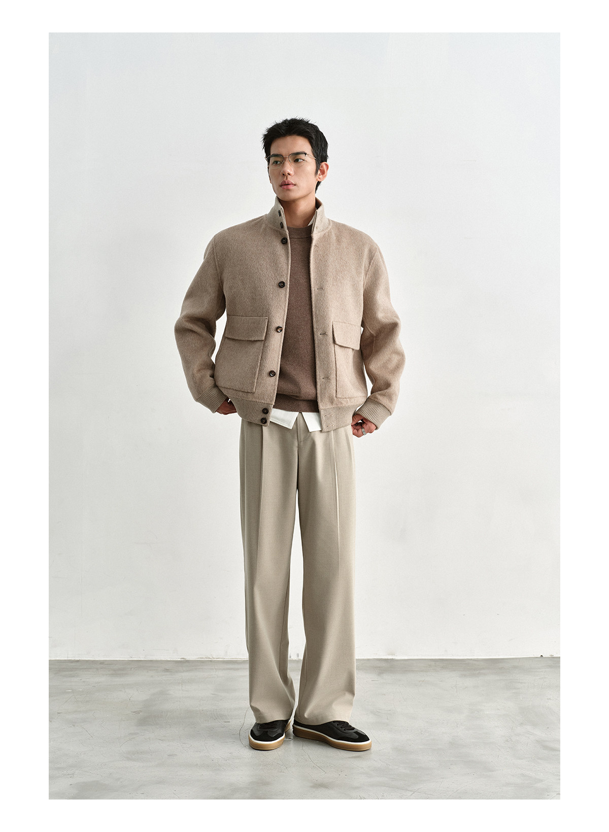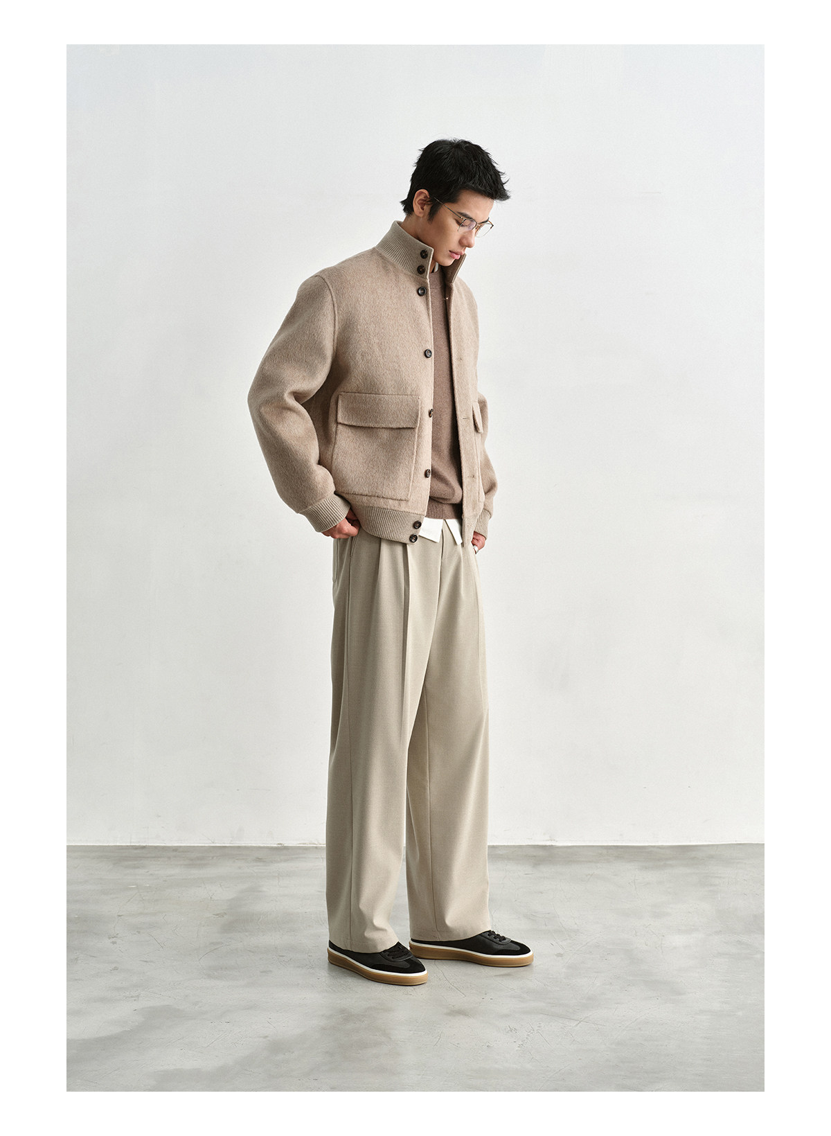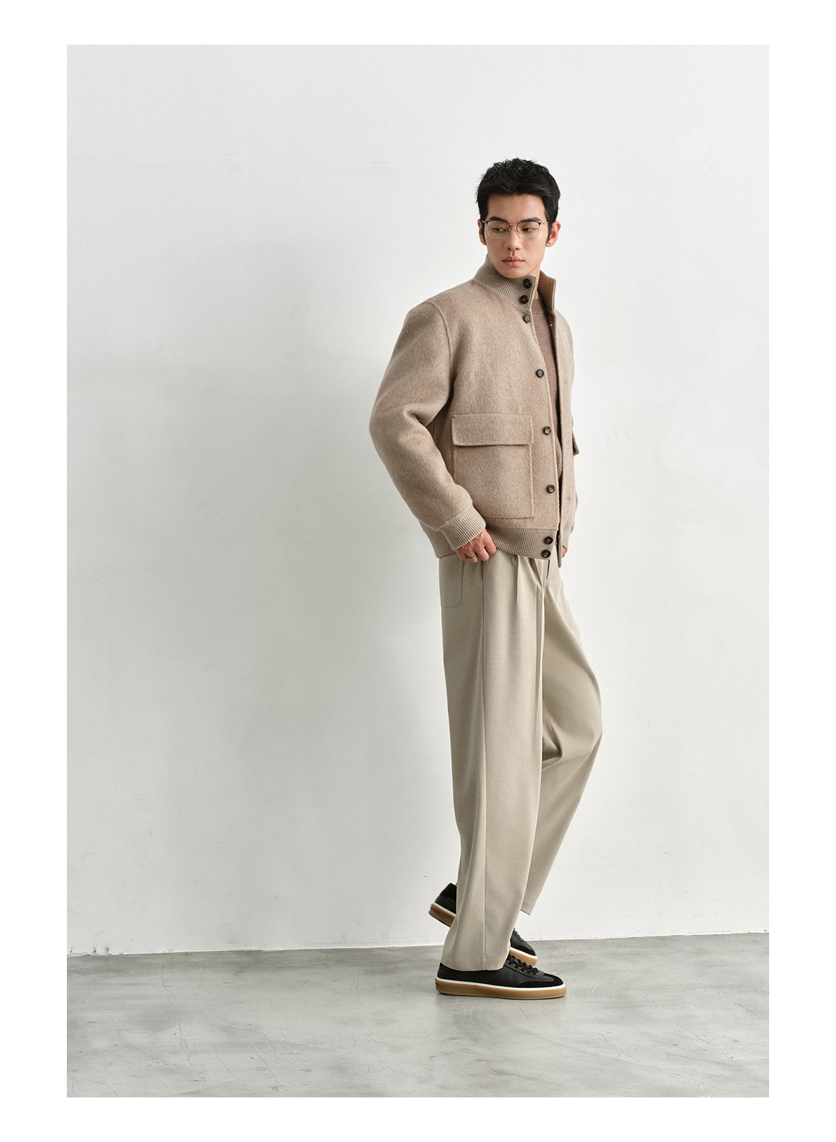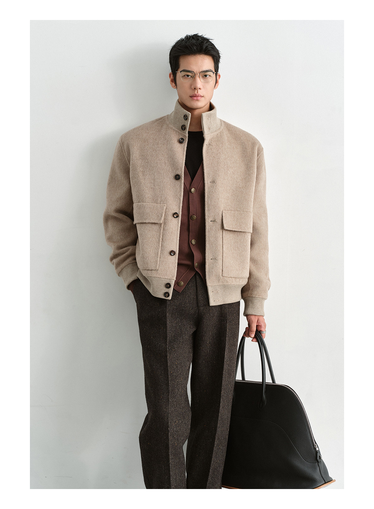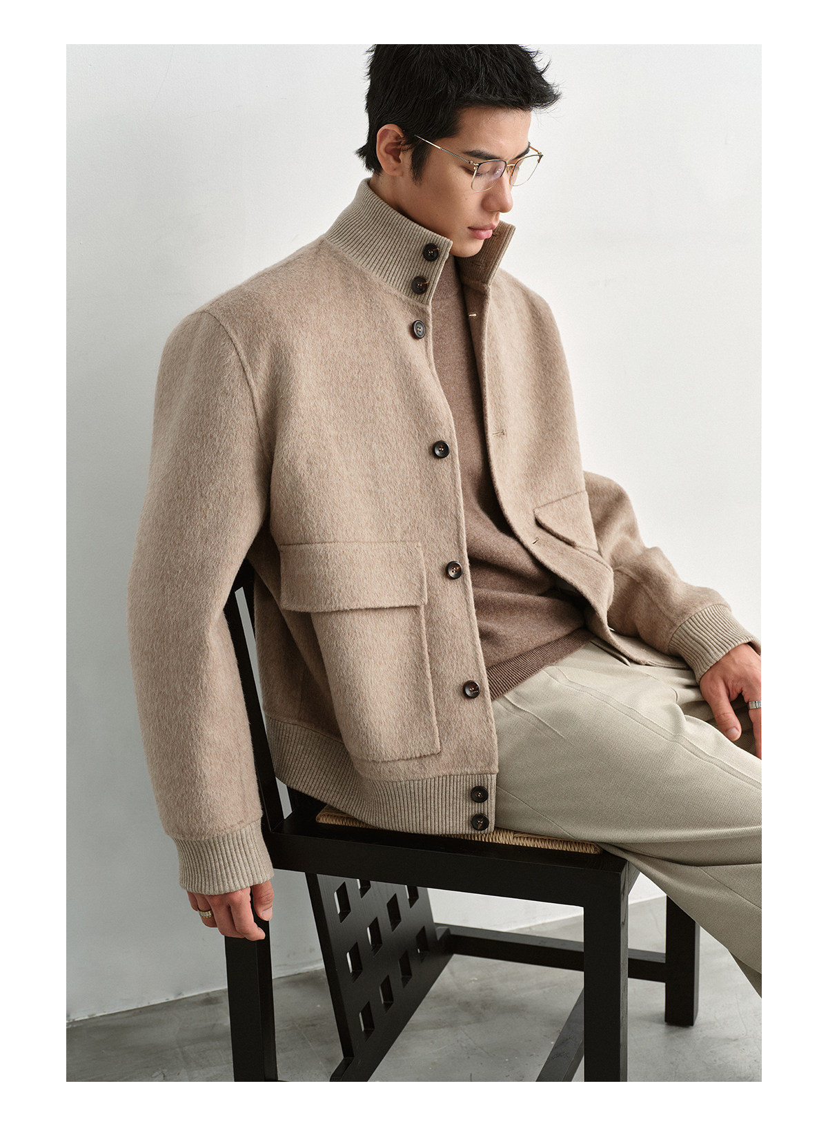 Osens Camel Wool, Mulberry Silk, and Wool Classic Half-High Collar Short Double-Sided Wool Coat Jacket for Men Winter