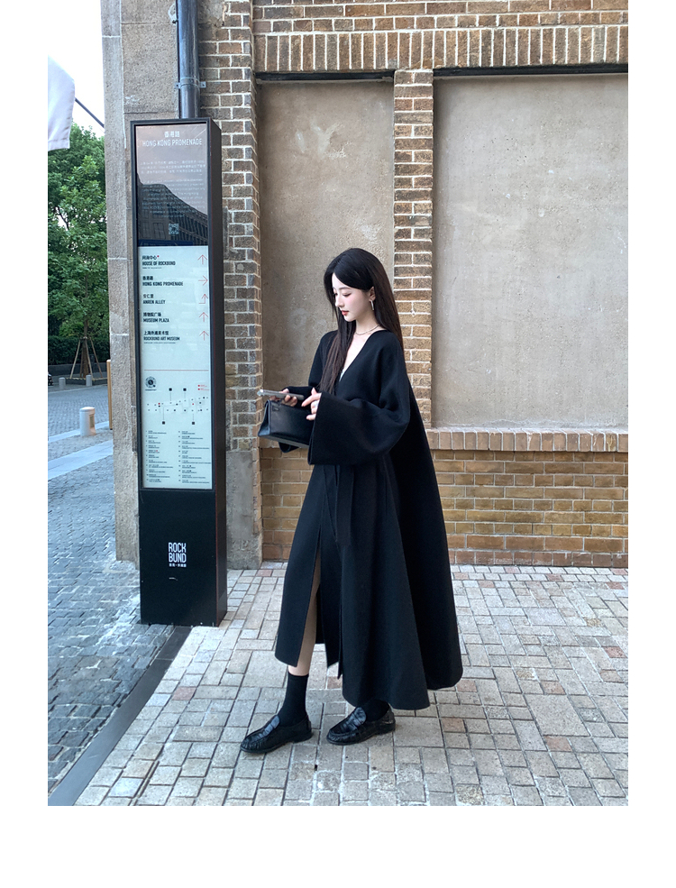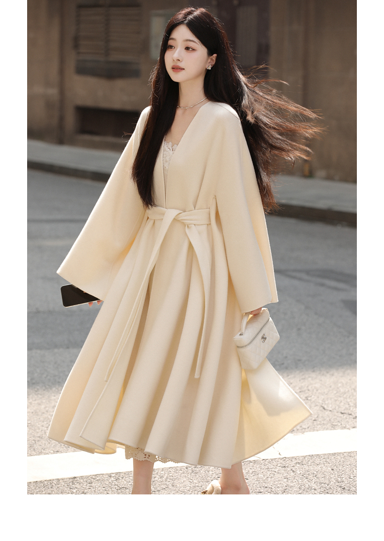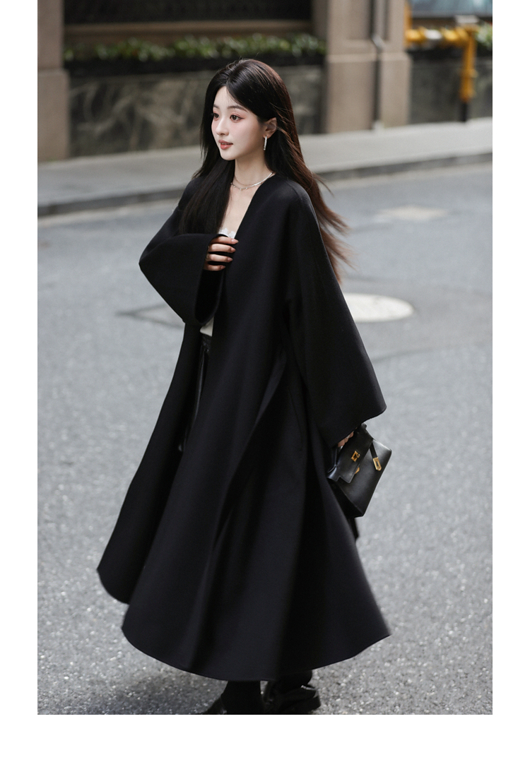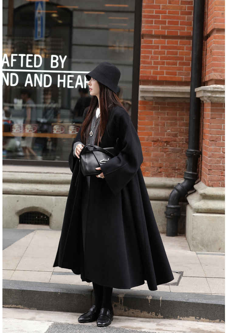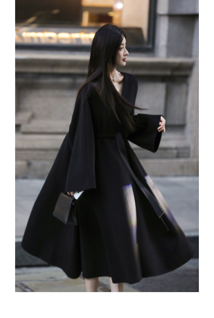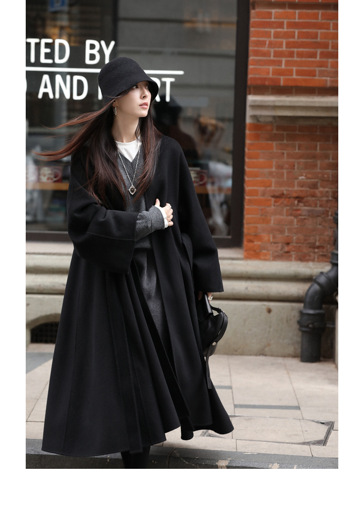 Xia Shiwen 100% Australian Wool High-Density Full Wool V-Neck Double-Sided Woolen Coat, Cool Korean Drama Heroine Style with Large Skirt Hem