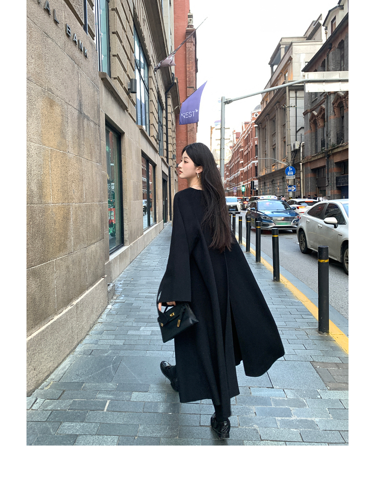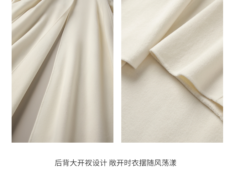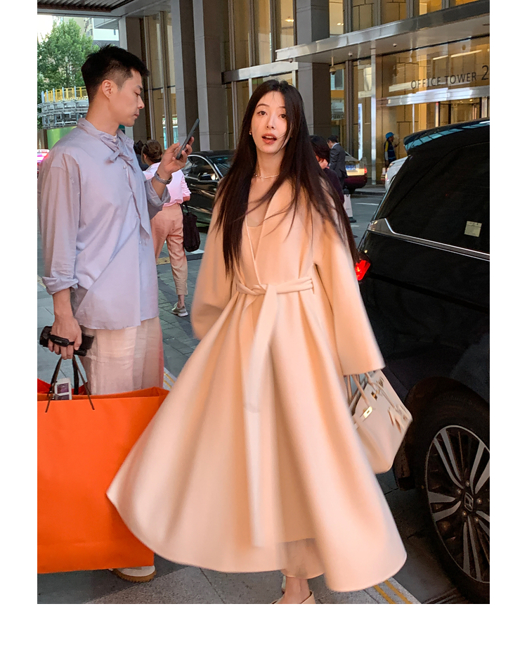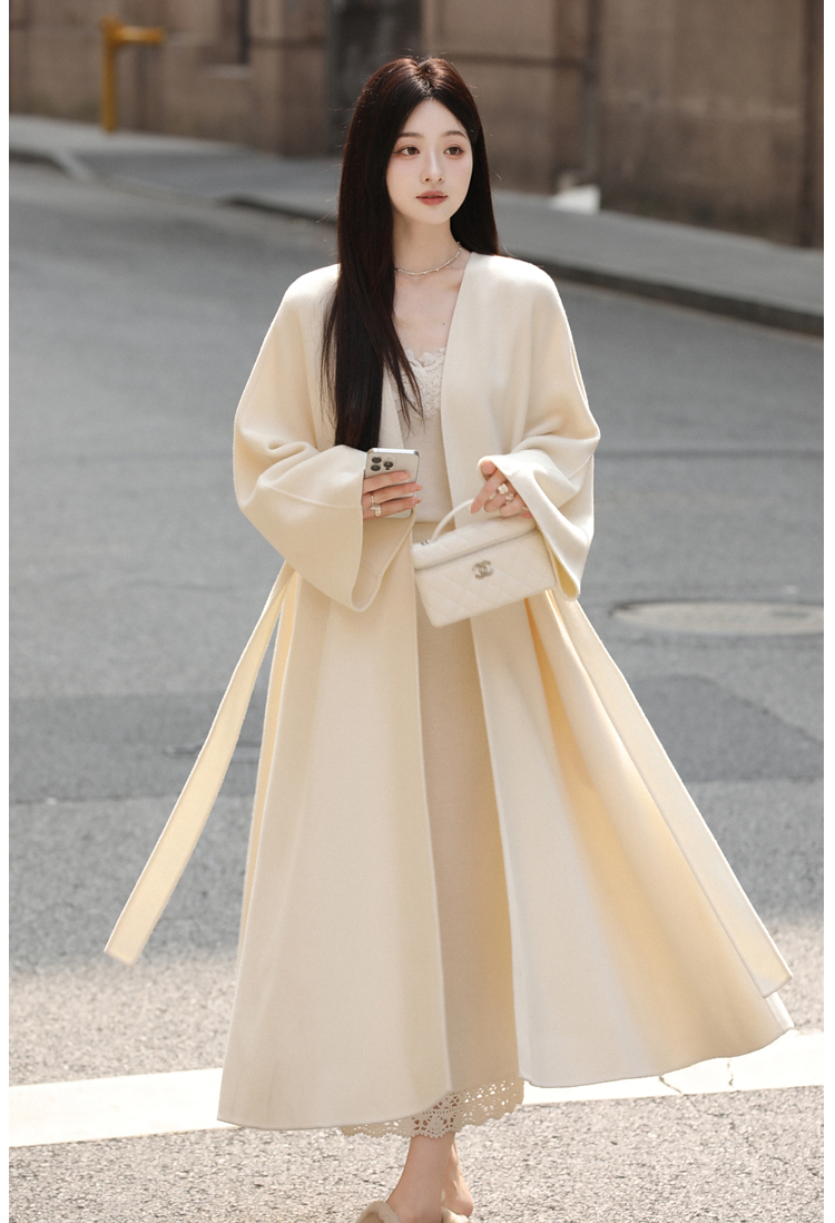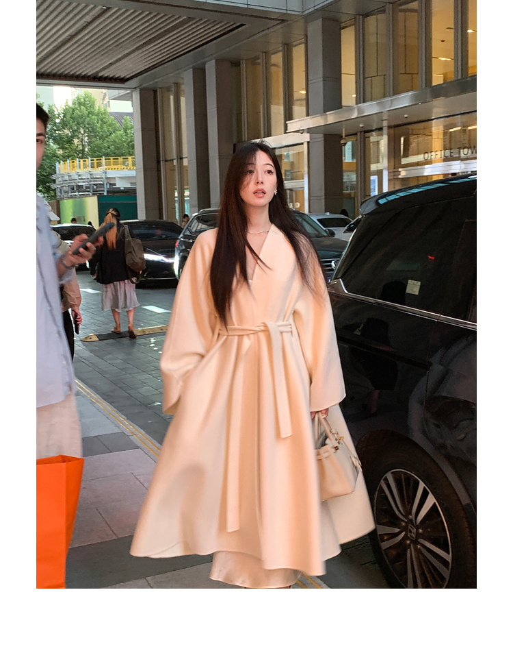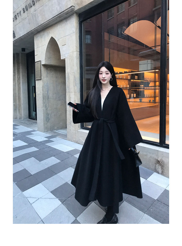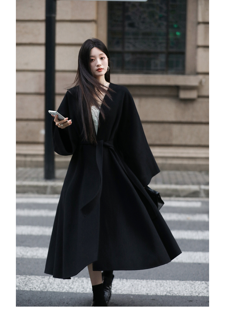 Xia Shiwen 100% Australian Wool High-Density Full Wool V-Neck Double-Sided Woolen Coat, Cool Korean Drama Heroine Style with Large Skirt Hem