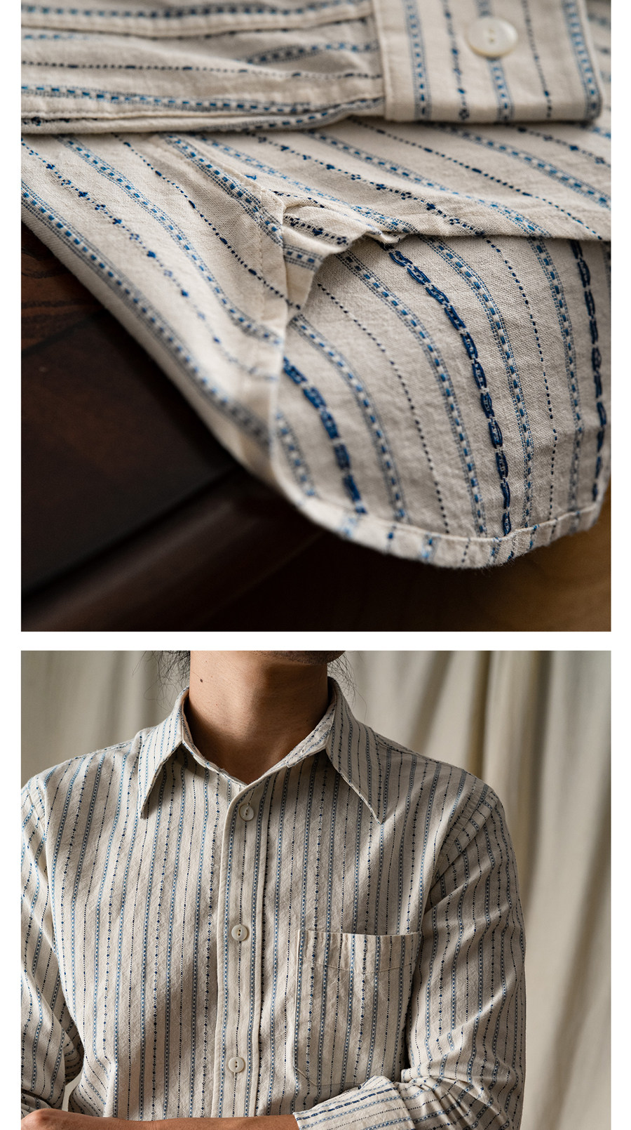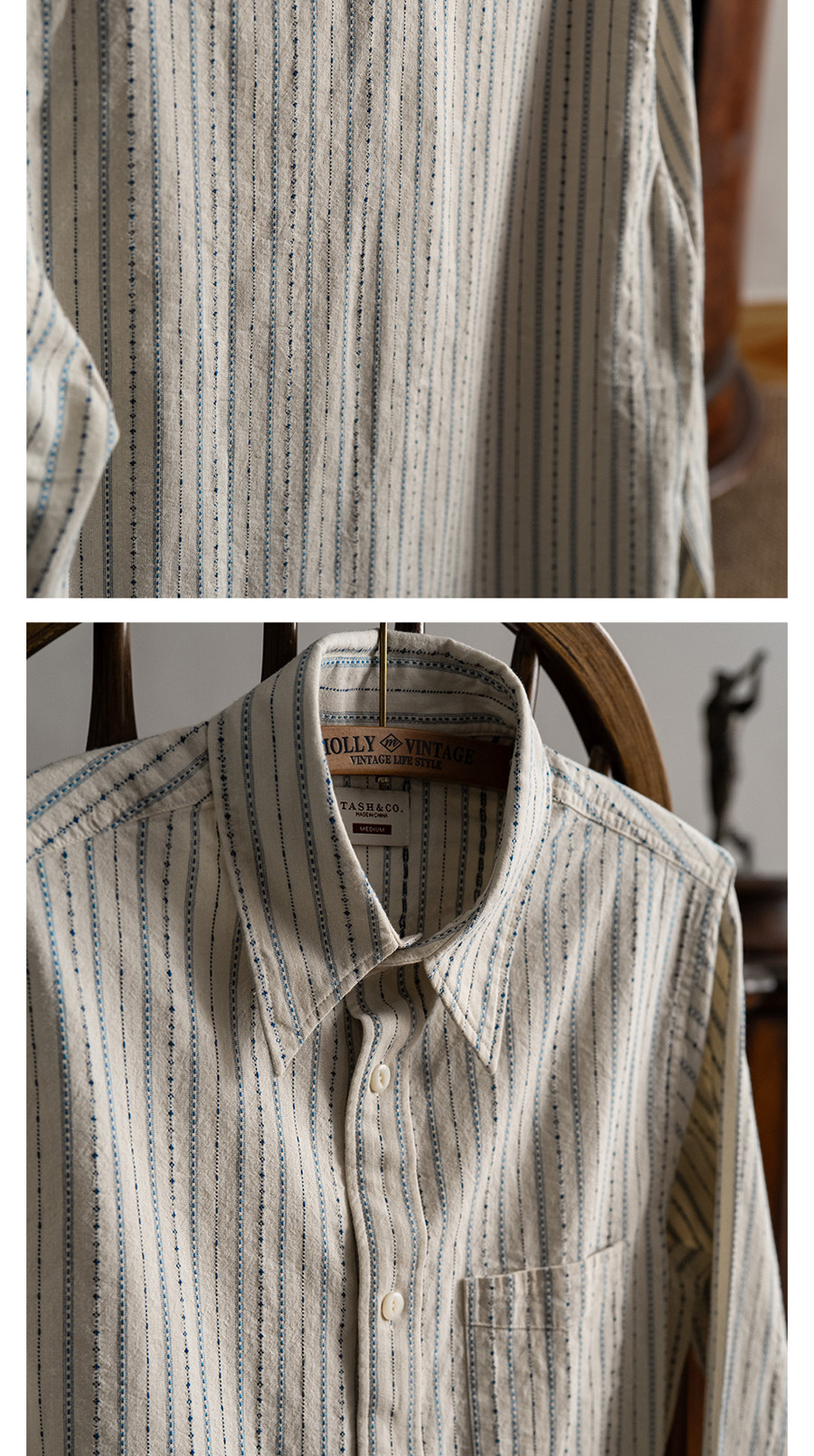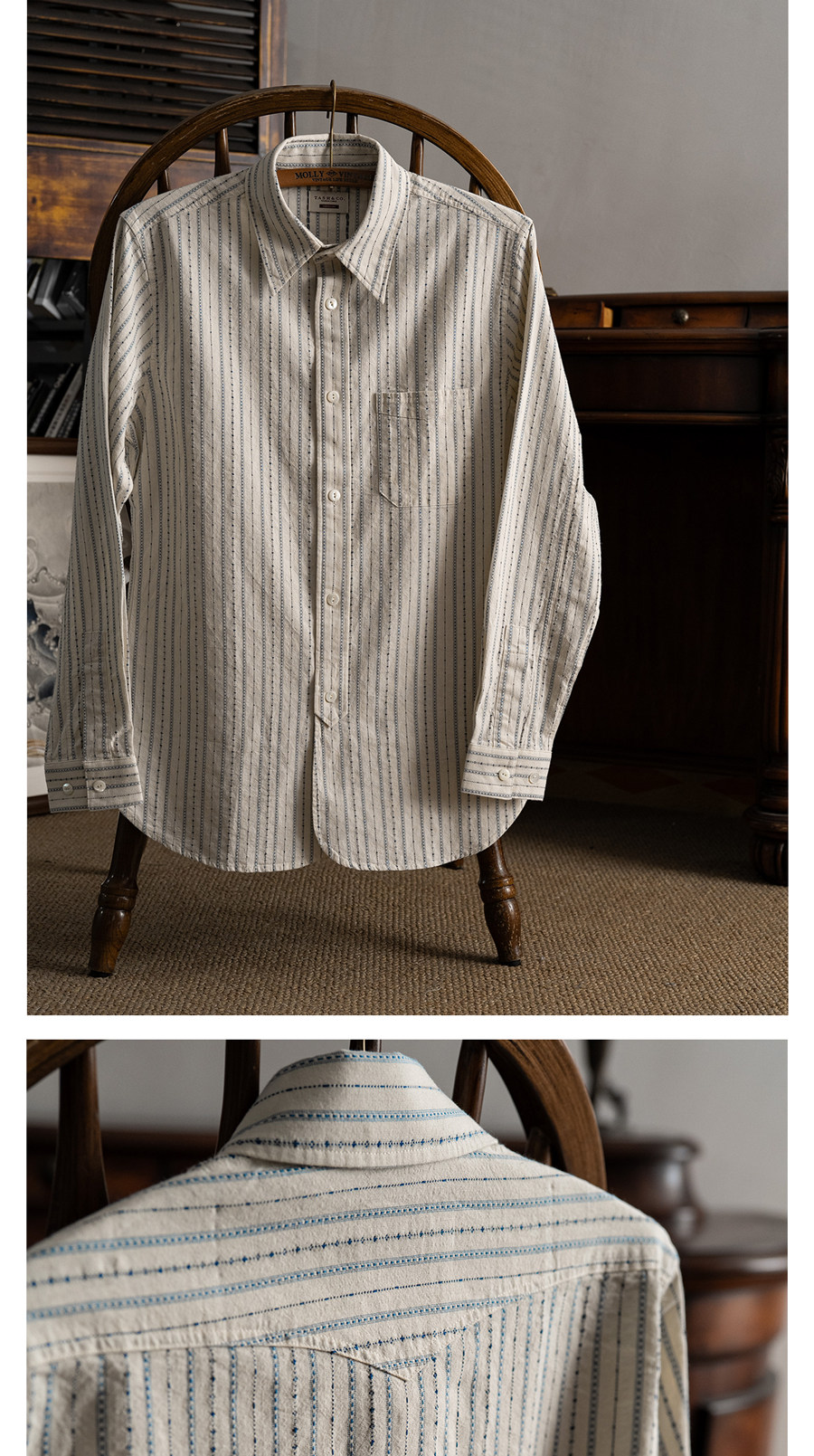 Tash&Co Milky White Beaded Jacquard Striped Ivy Shirt, All-Cotton American Retro Long-Sleeve Shirt