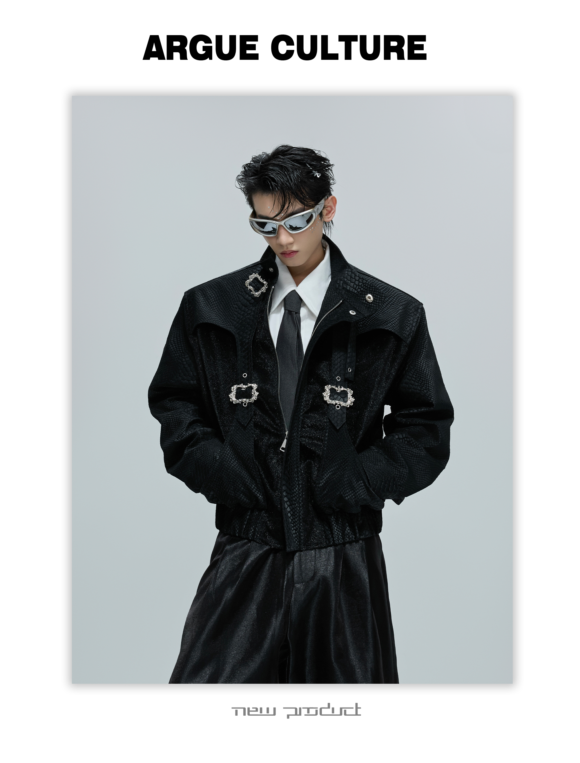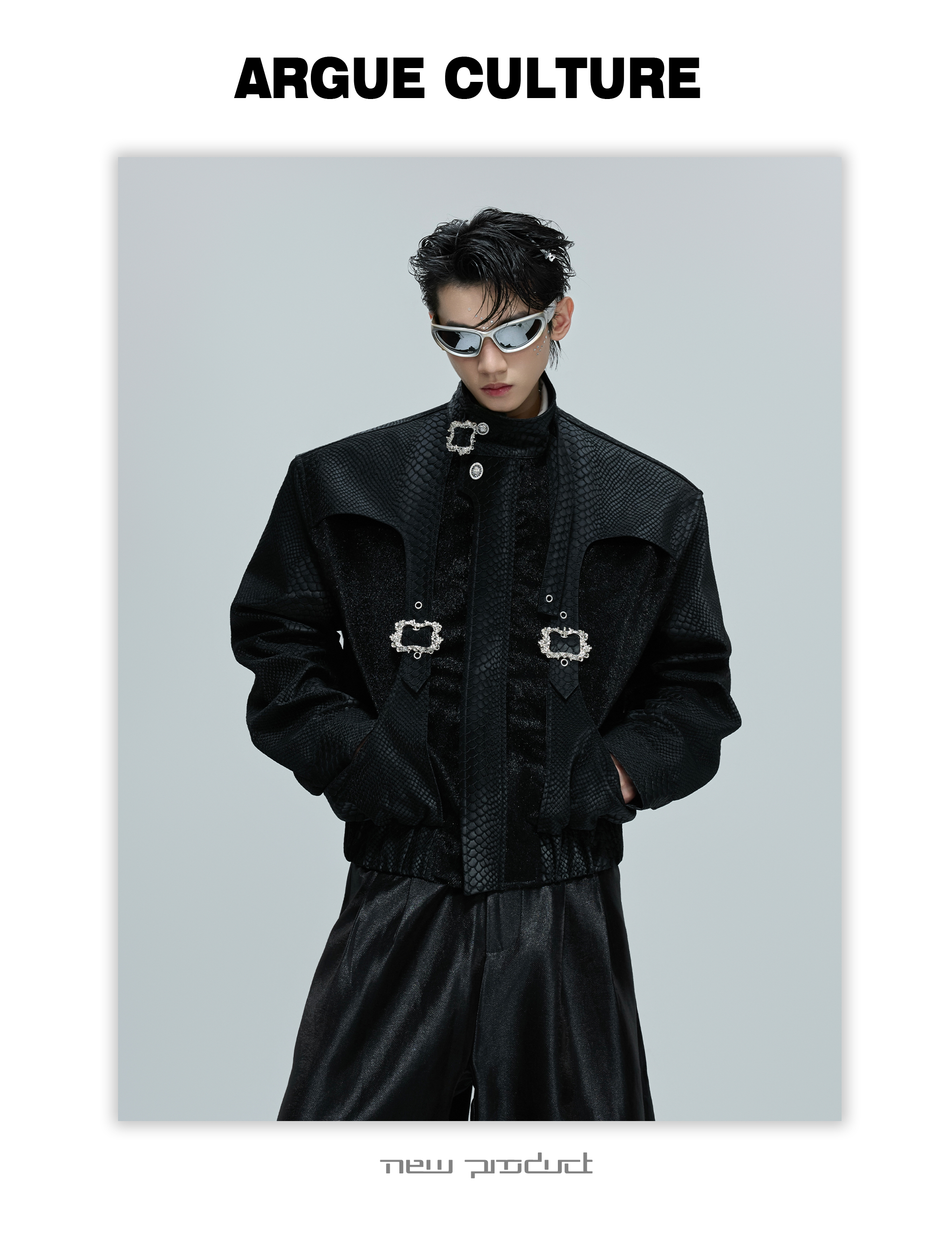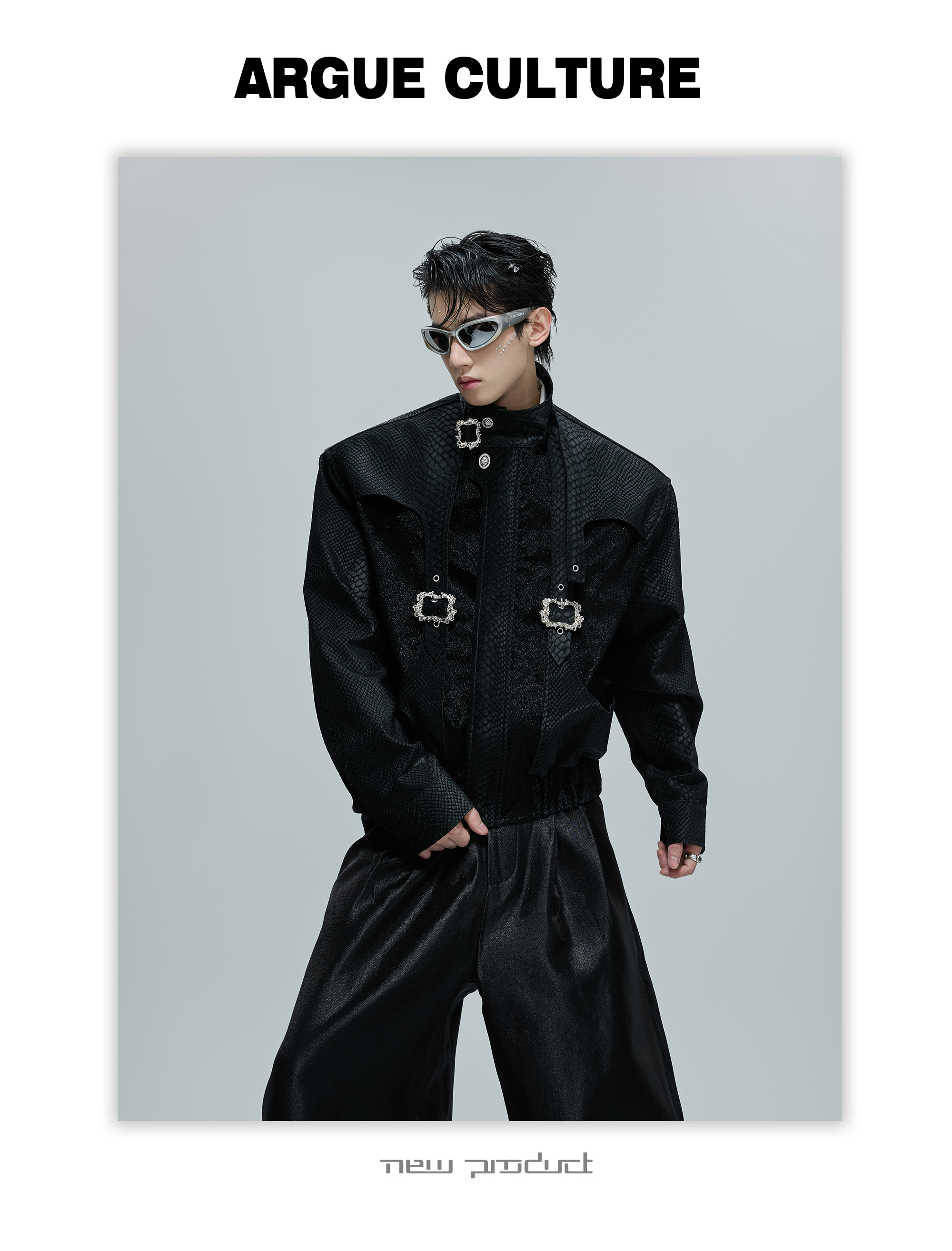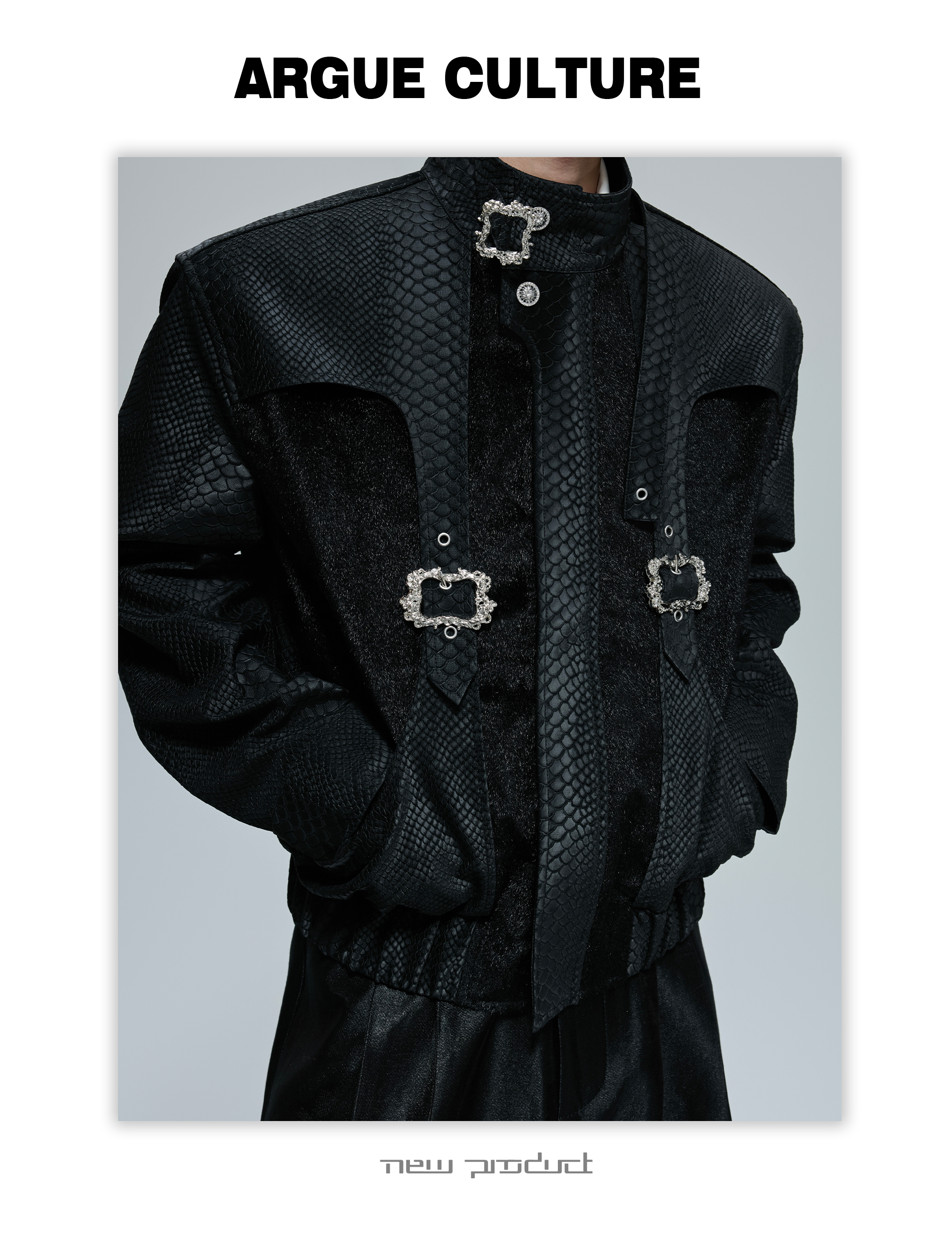 Argue Culture Snake Scale Short Jacket with Stand Collar, Horsehair Splicing, and Metal Buckle Design Leather Coat