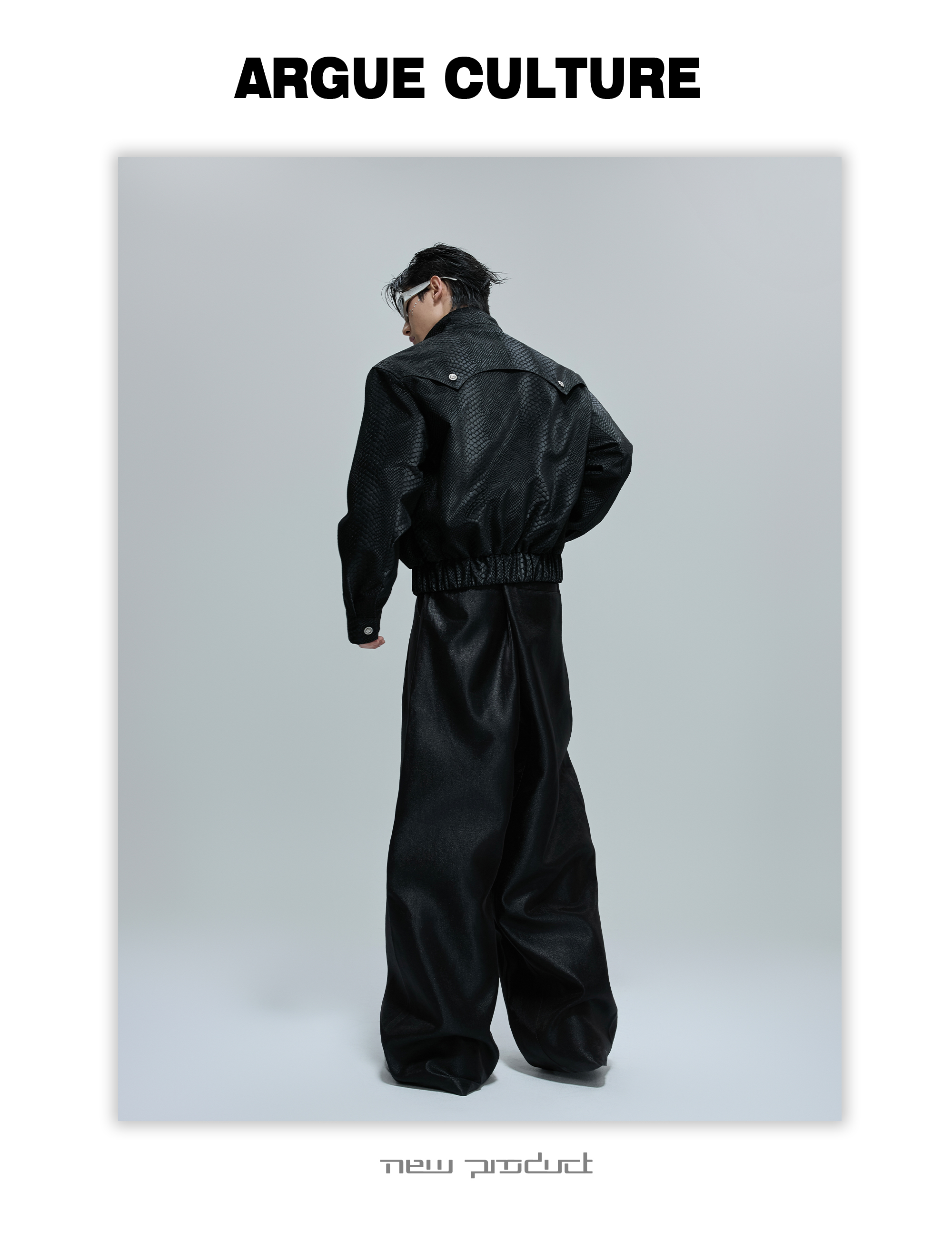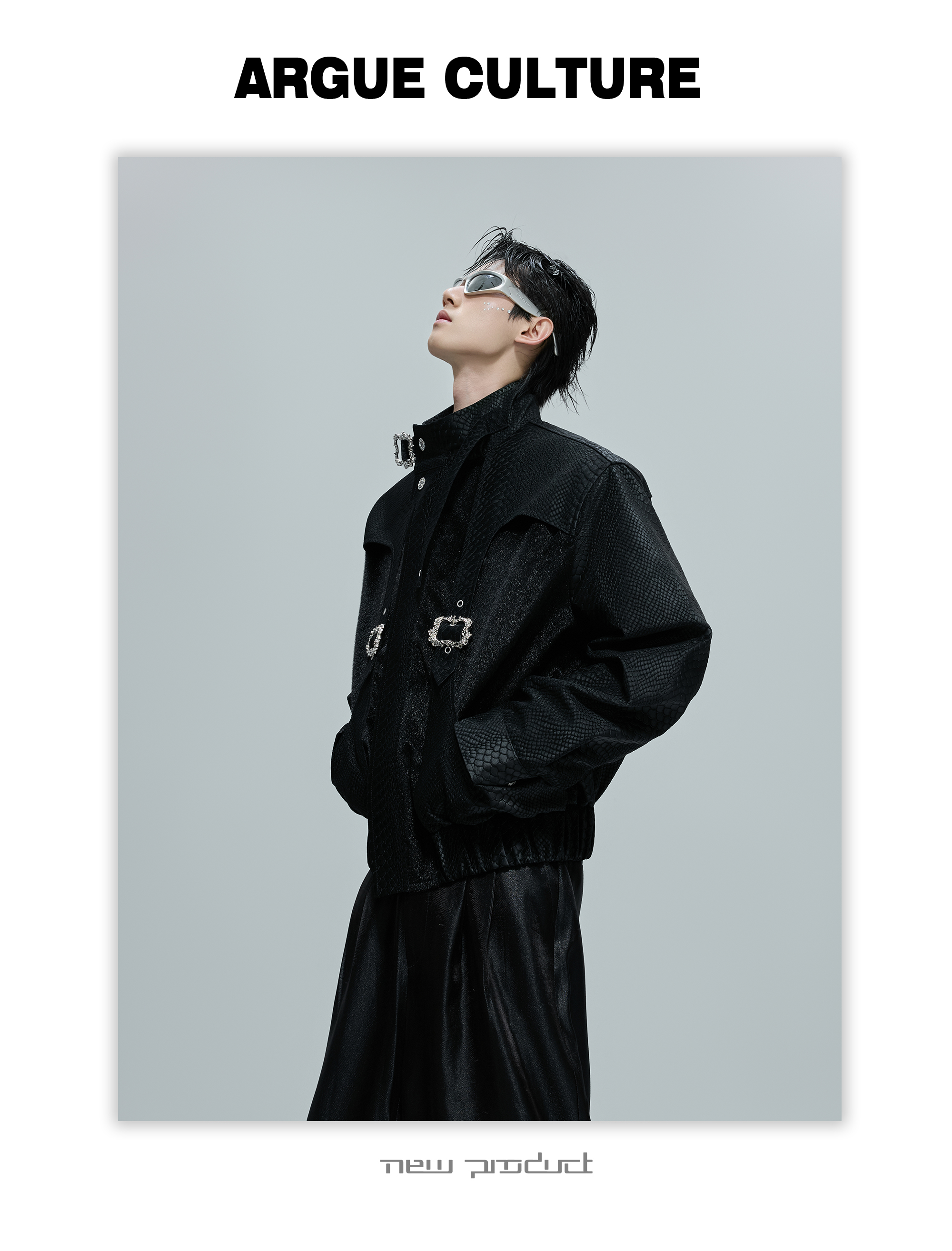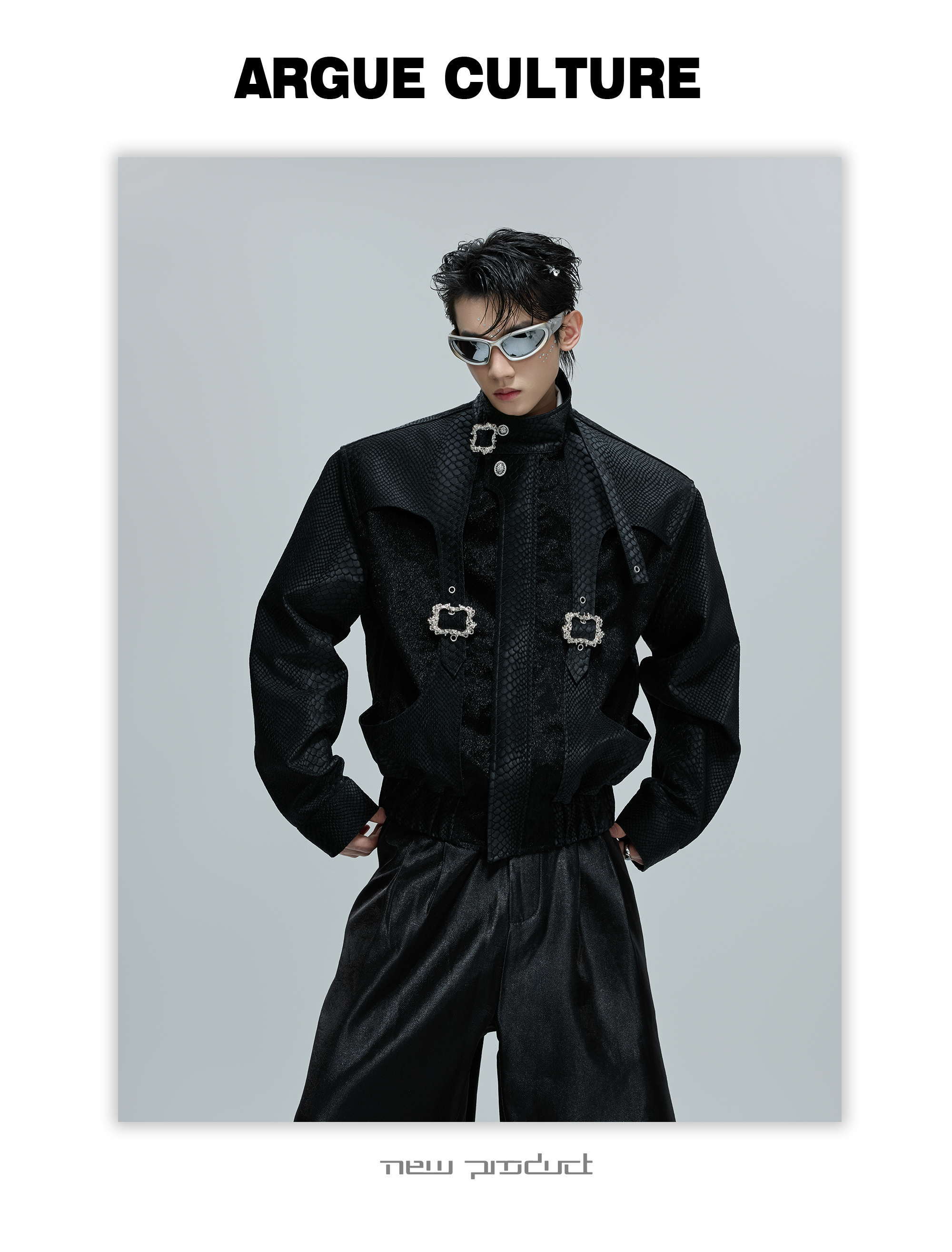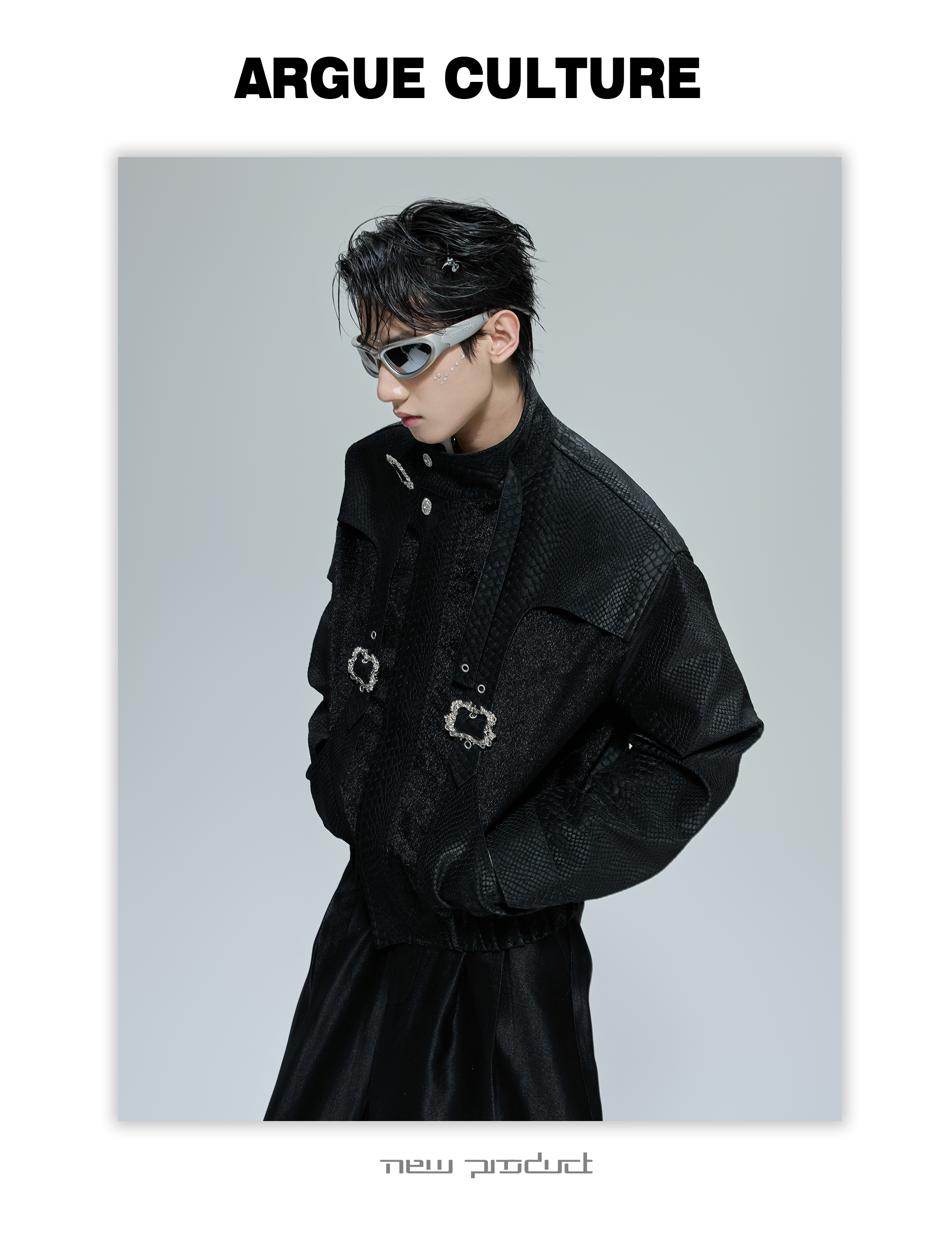 Argue Culture Snake Scale Short Jacket with Stand Collar, Horsehair Splicing, and Metal Buckle Design Leather Coat